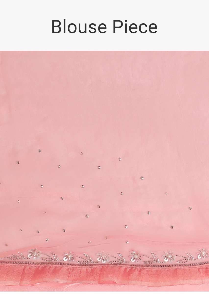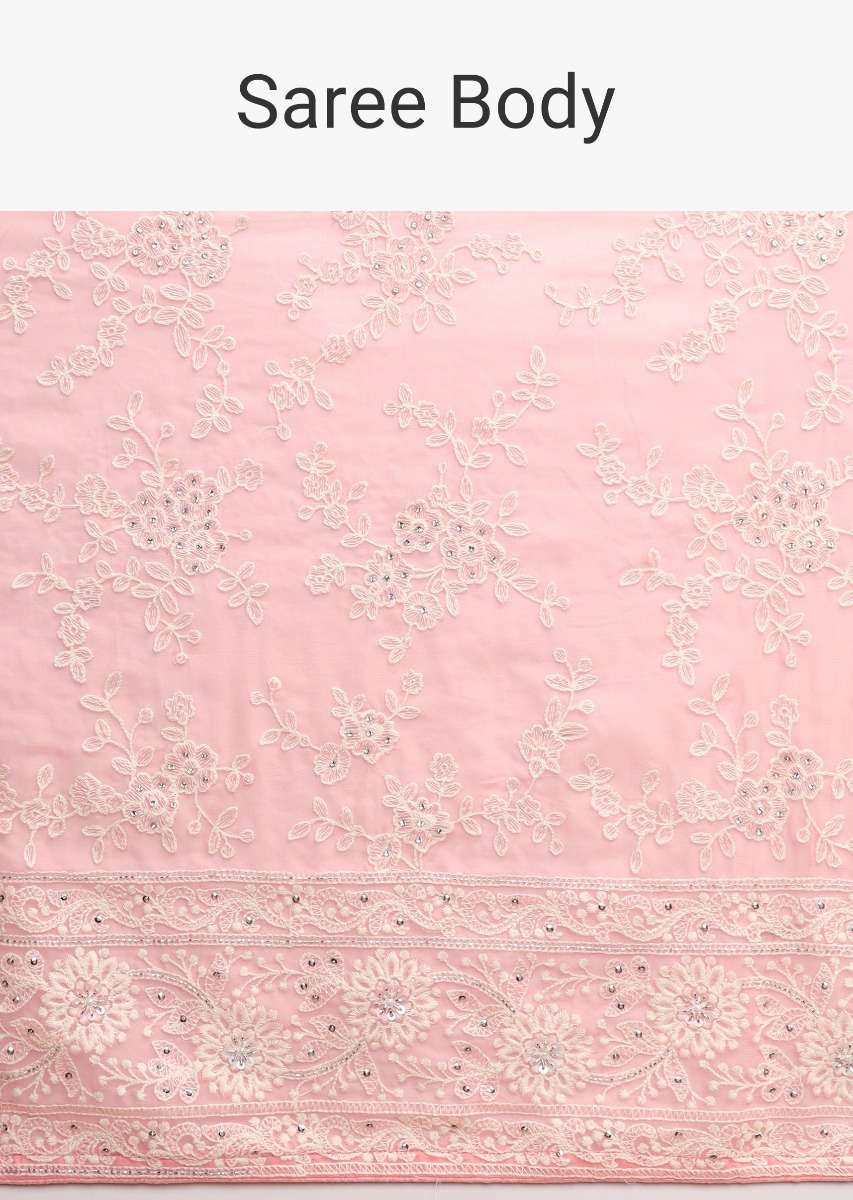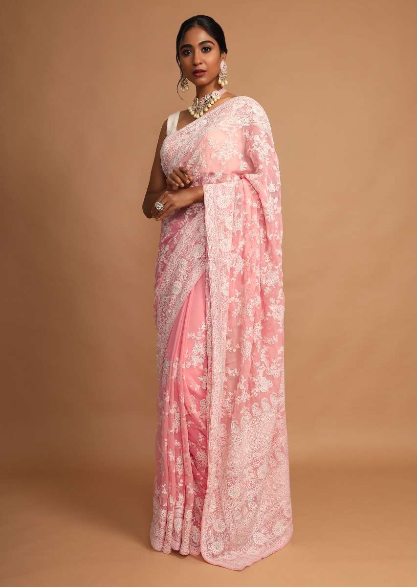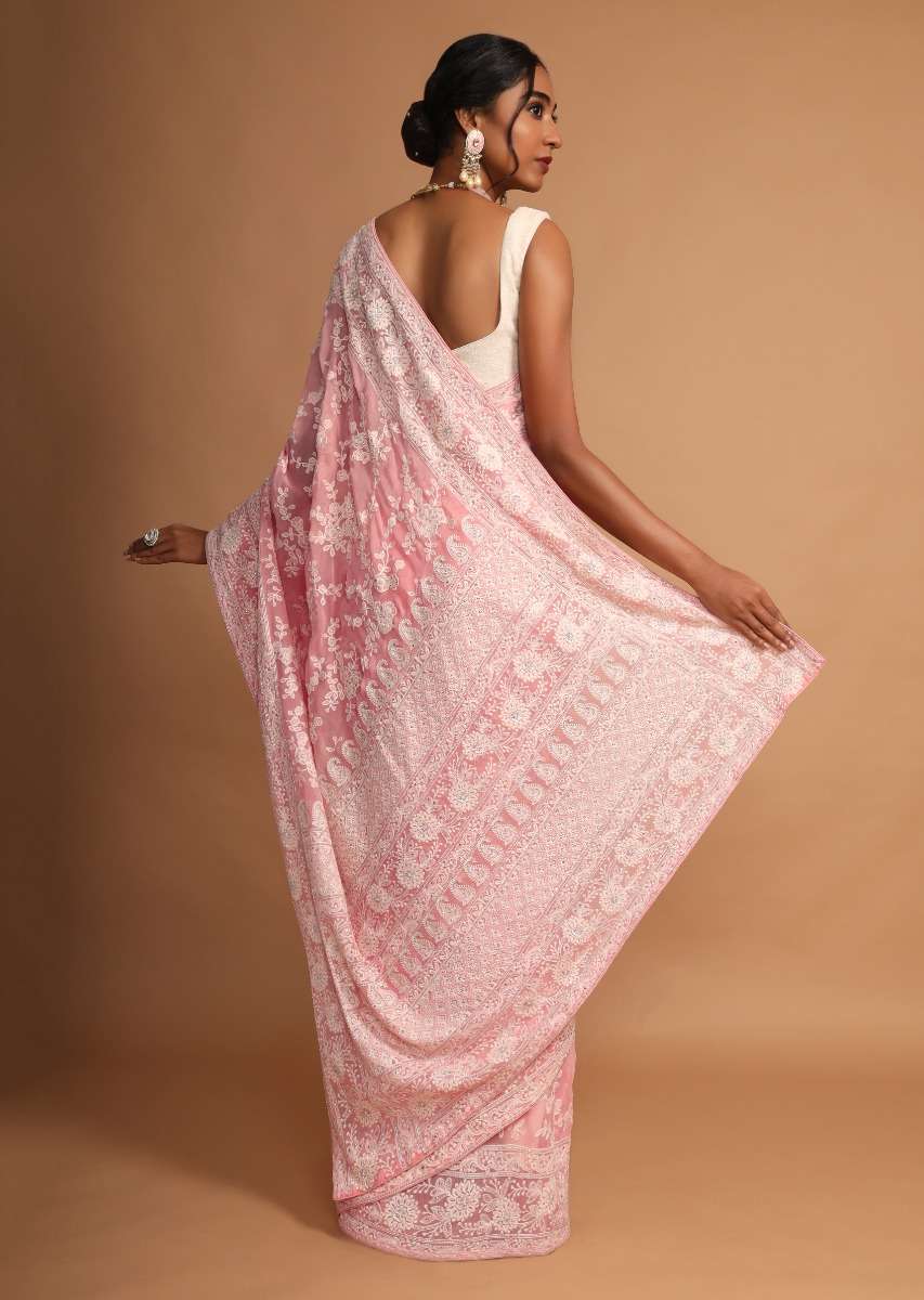Rose Pink Saree In Georgette With Lucknowi Thread Embroidered Floral Jaal Online - Kalki Fashion