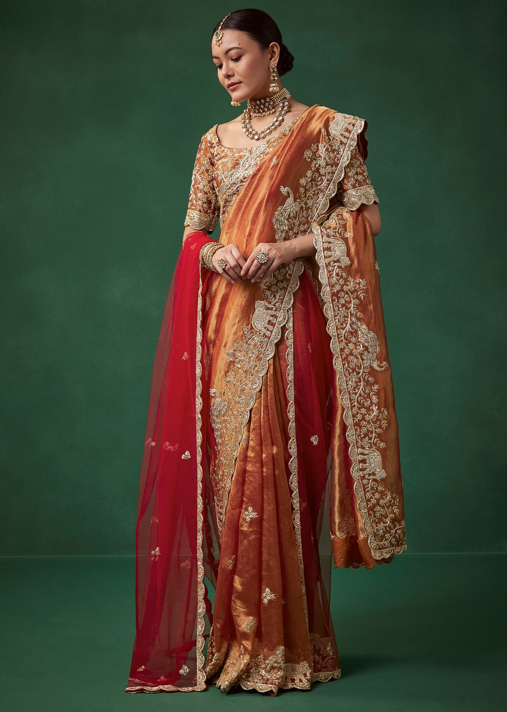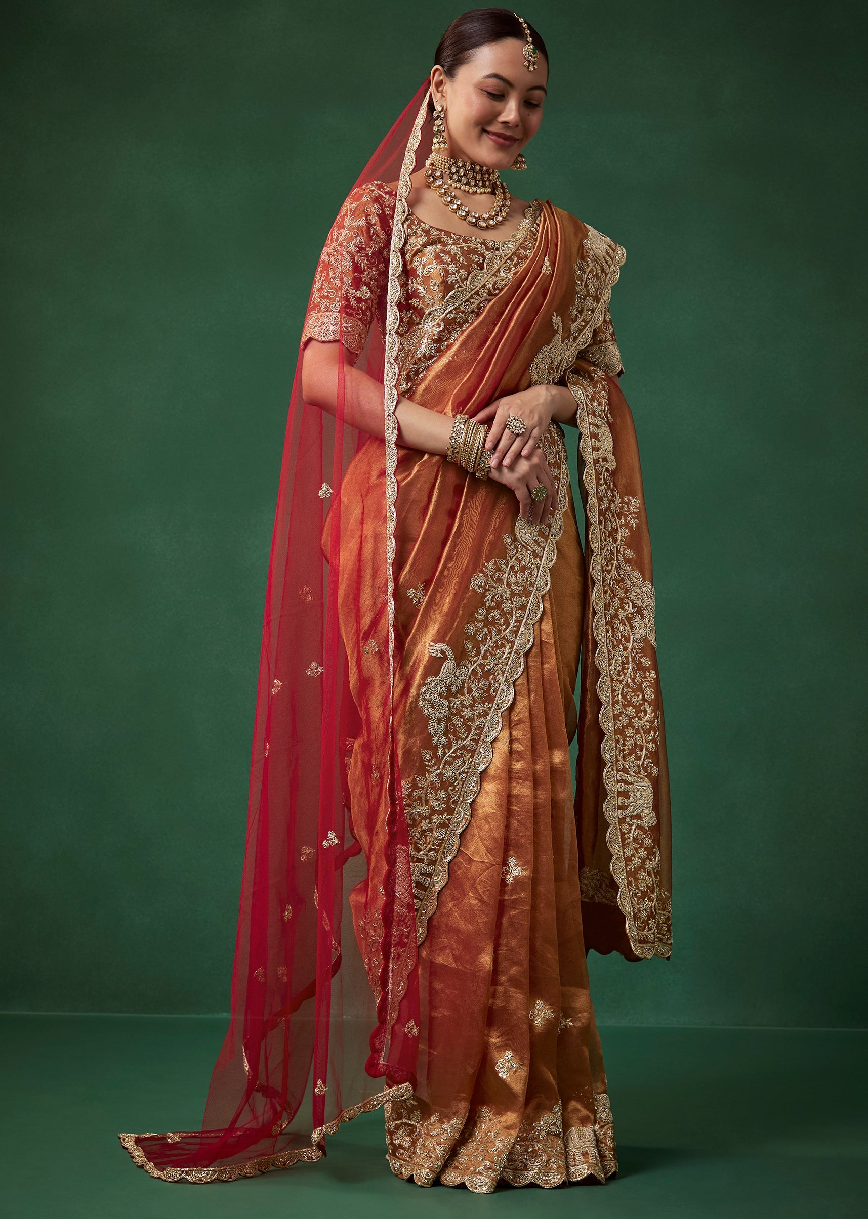 Rust Bridal Silk Organza Saree with Unstitched Blouse and Dupatta