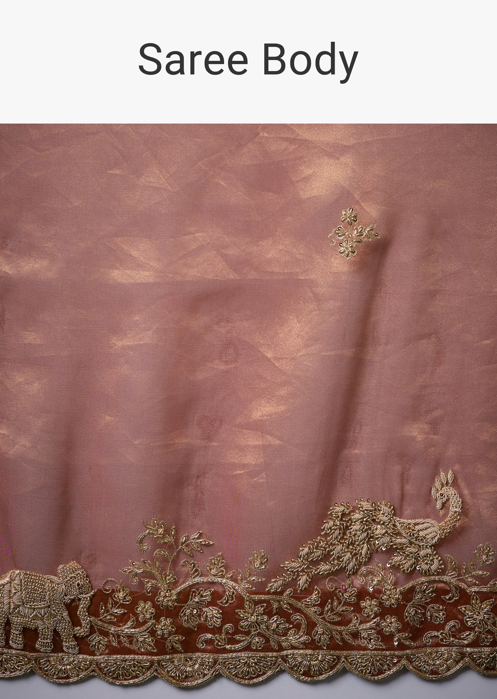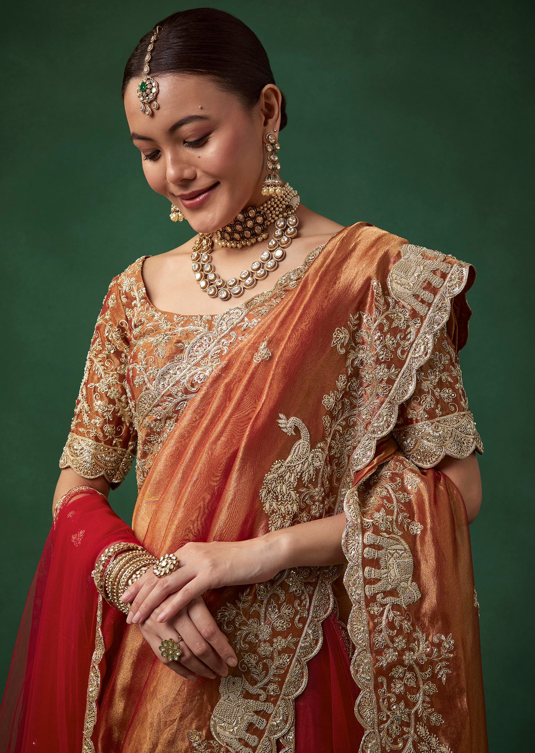 Bridal artistry comes alive in this organza silk saree, adorned with a richly embroidered scallop border and intricate detailing on the blouse featuring zardosi and zari work. Traditional motifs including elephants, peacocks, and florals are embroidered all over the drape, adding depth and cultural elegance, while the matching scallop embroidered dupatta completes the ensemble with a regal touch. The set includes one saree, one unstitched blouse fabric, and one dupatta, making it perfect for weddings and grand celebrations. Awarded as the Most Trusted Brand, we're delivering styles you love, just as promised.