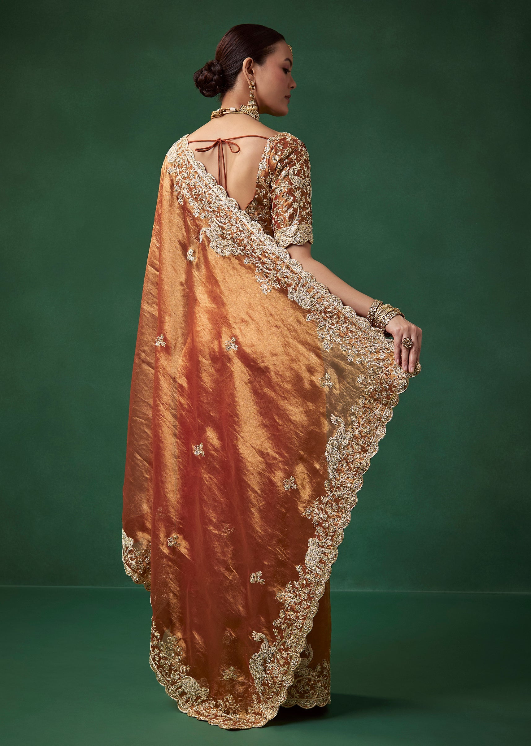 Fit Tips:Keep the pleats neat for a graceful flow and choose a structured blouse to balance the saree’s ornate embroidery and lightweight organza texture.