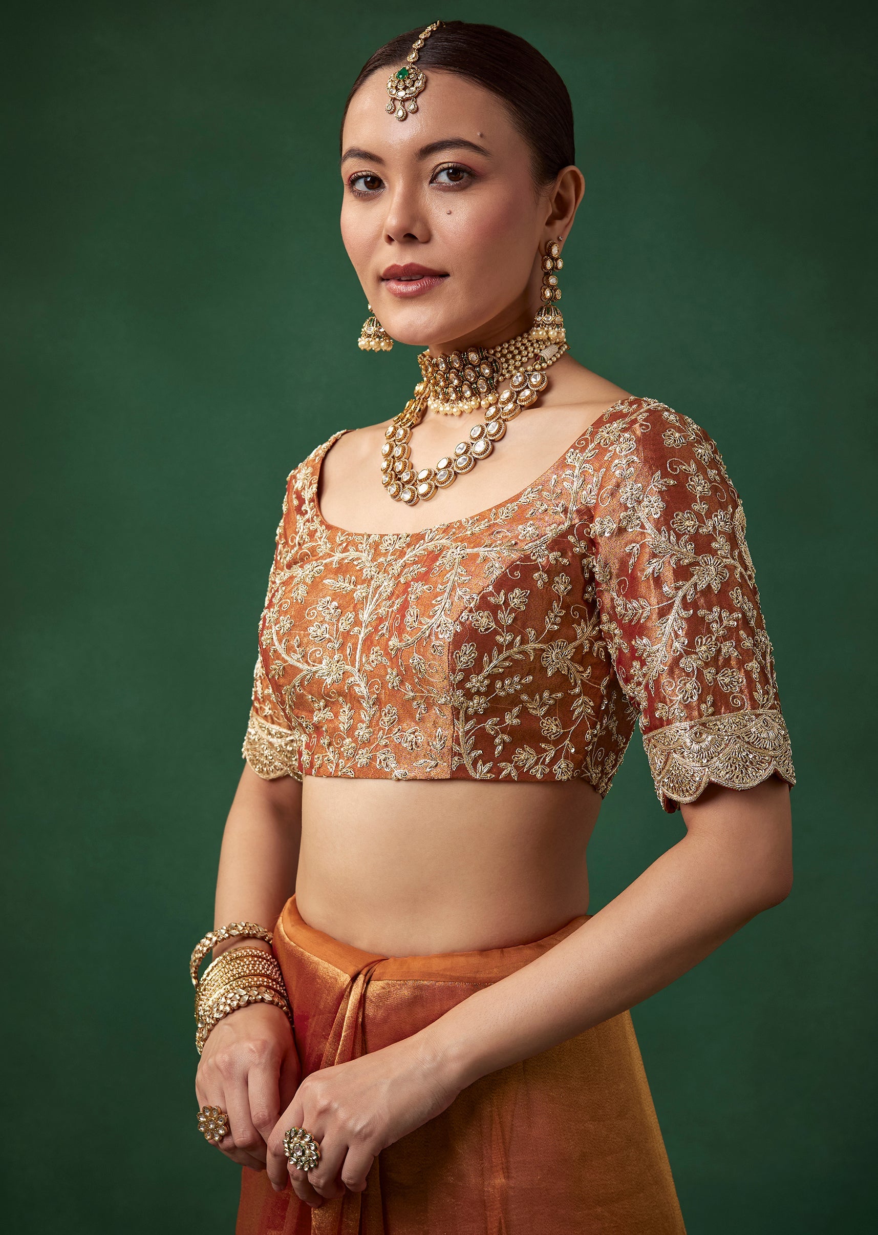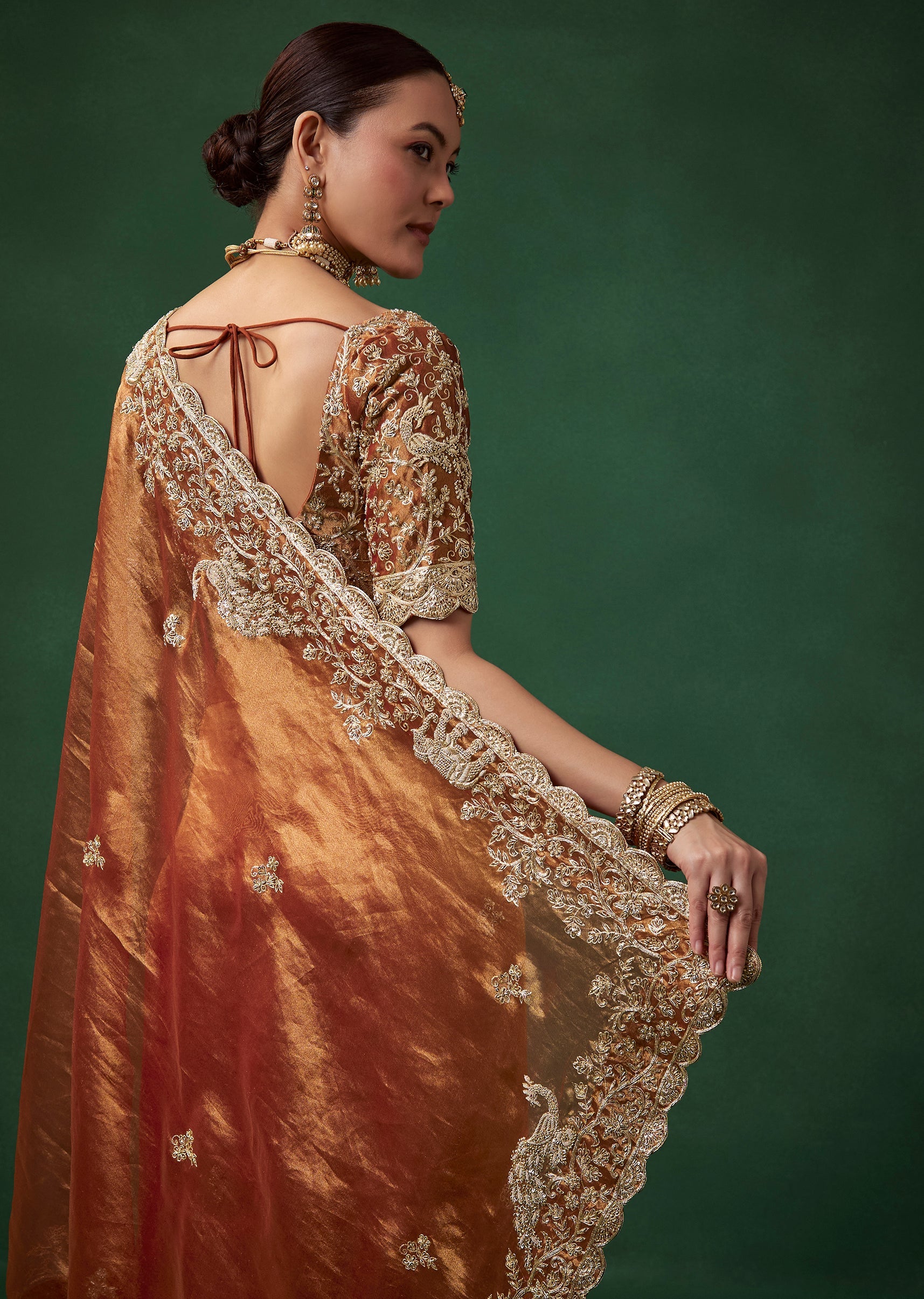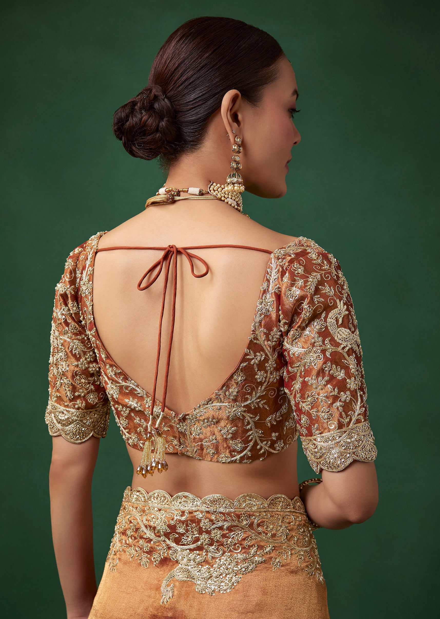 Pair it with antique gold or kundan jewelry, a soft bun or braided hairstyle, and glowing warm makeup to enhance its traditional charm.