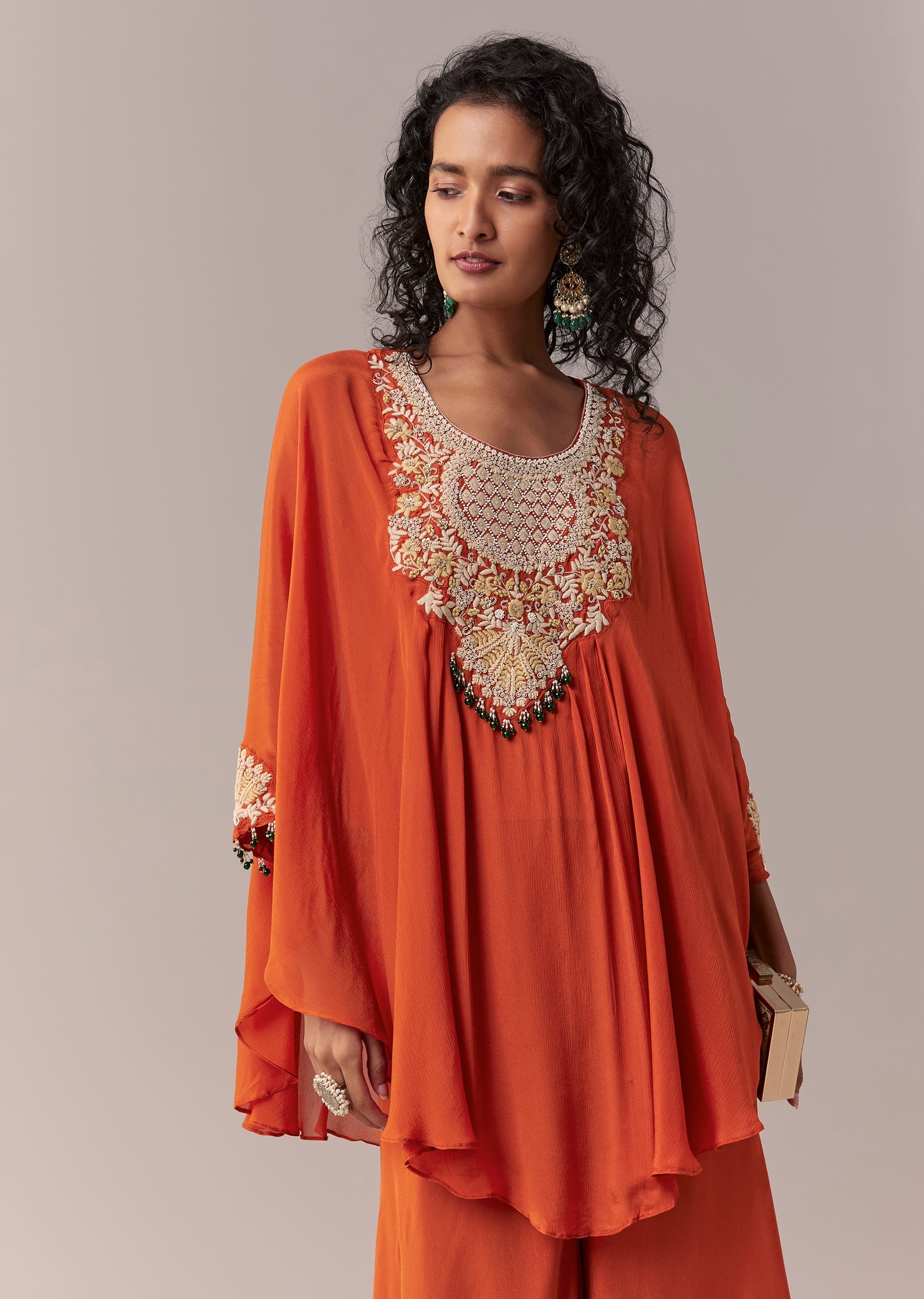 Crafted in soft chinon, this contemporary cape set features a beautifully detailed cape with thread and moti work. The ensemble includes a coordinated inner and flared palazzos, designed for effortless... More Product Details