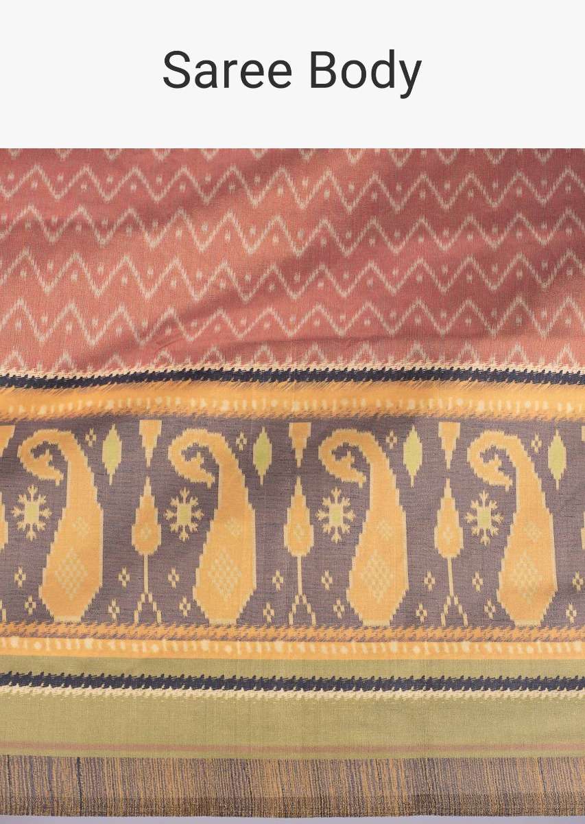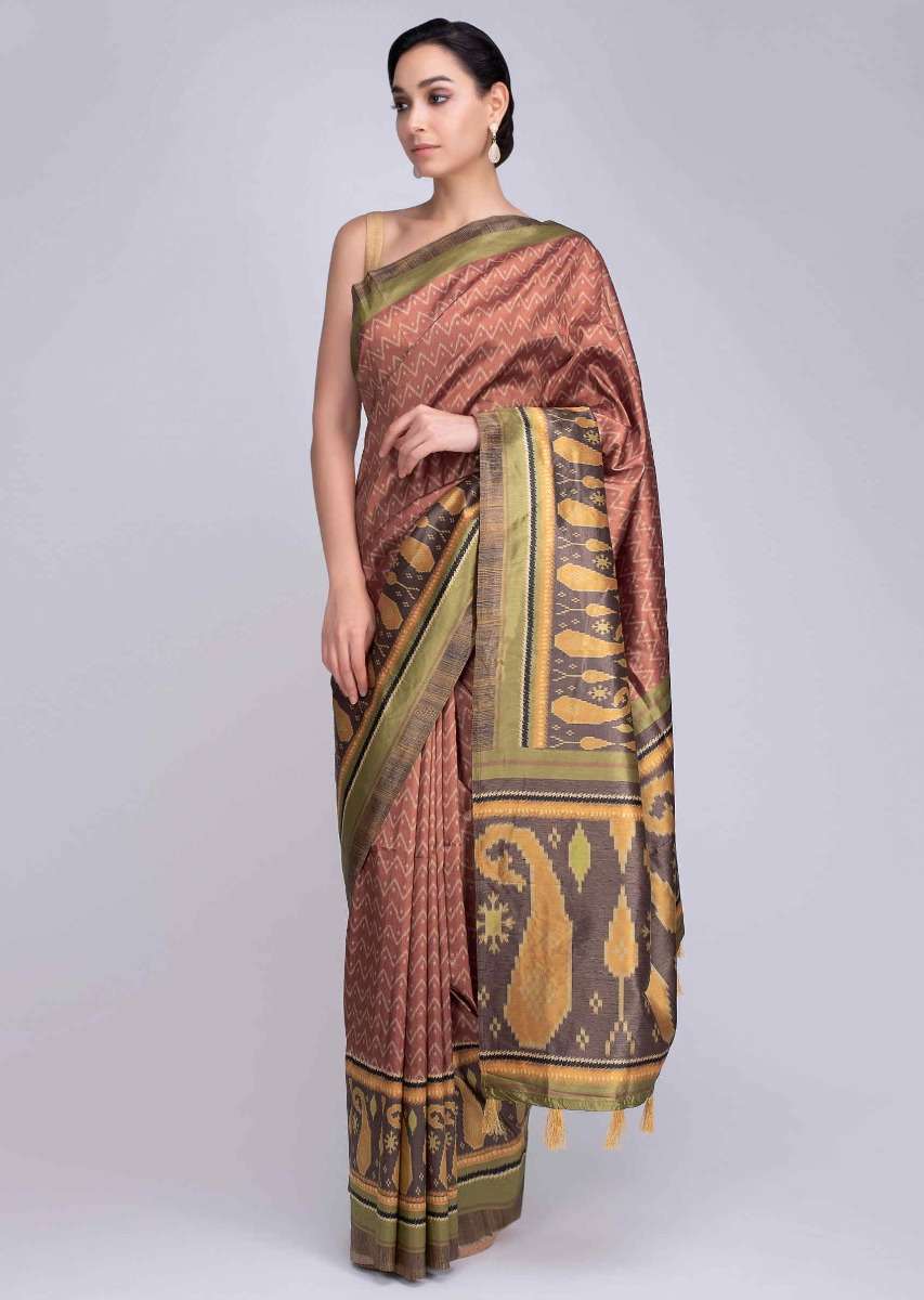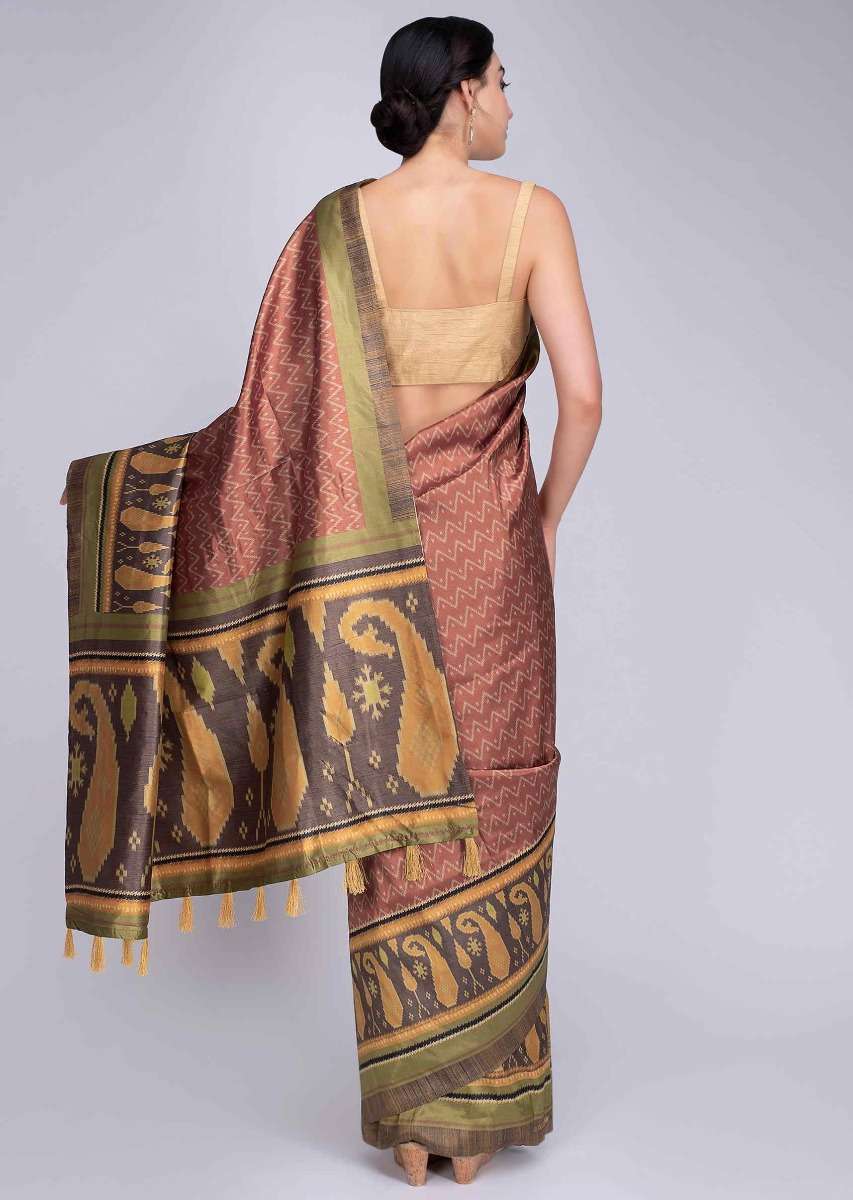 Rust silk saree in paisley and zig zag printed motif only on Kalki