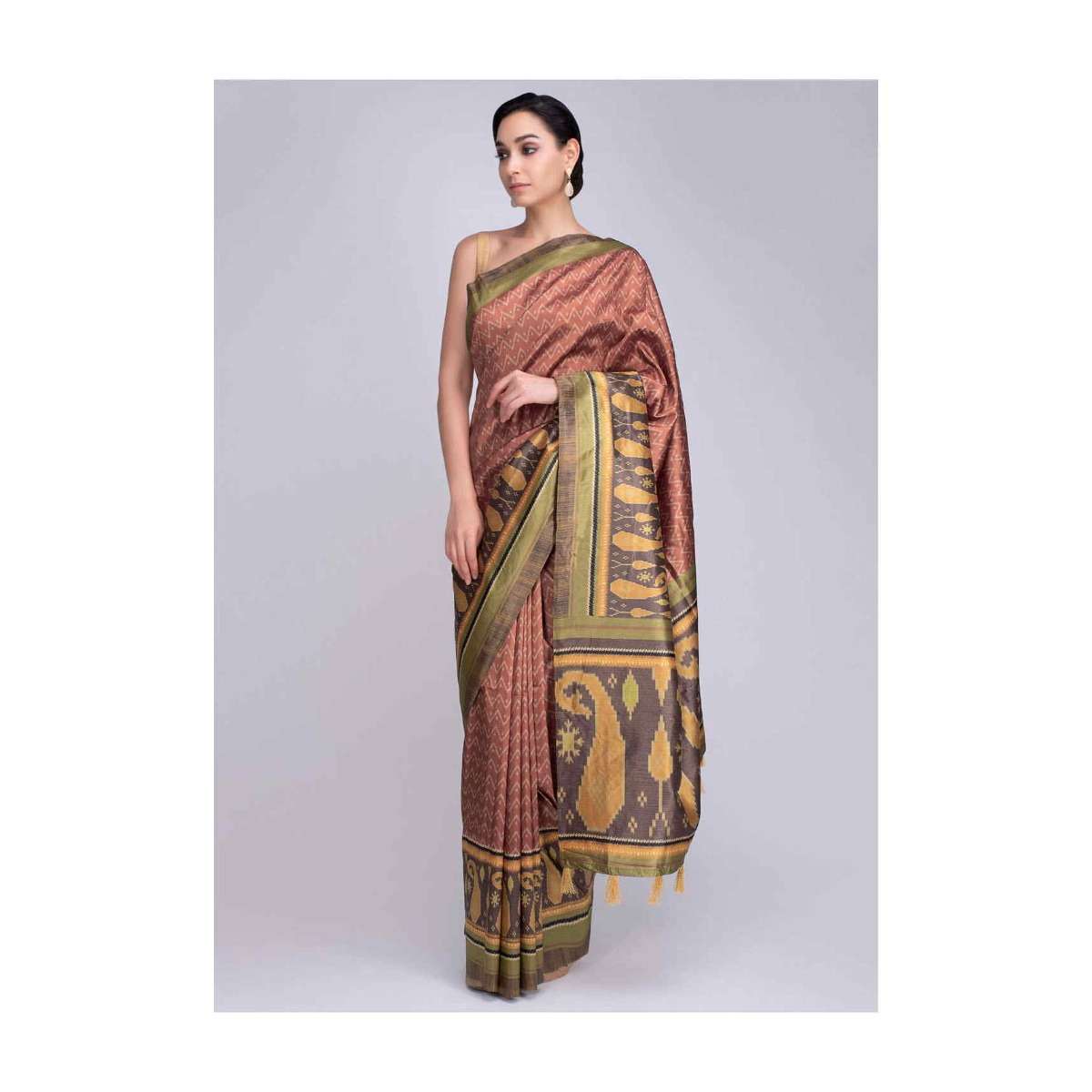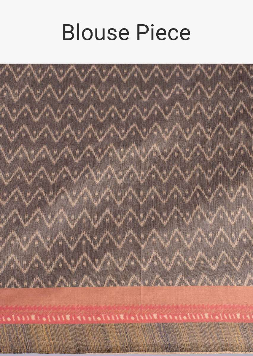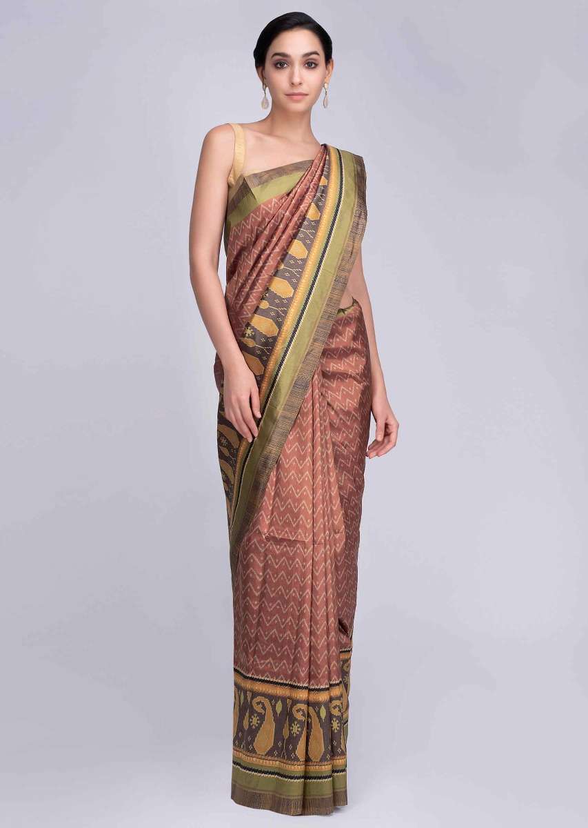 Rust silk saree in paisley and zig zag printed motif only on Kalki