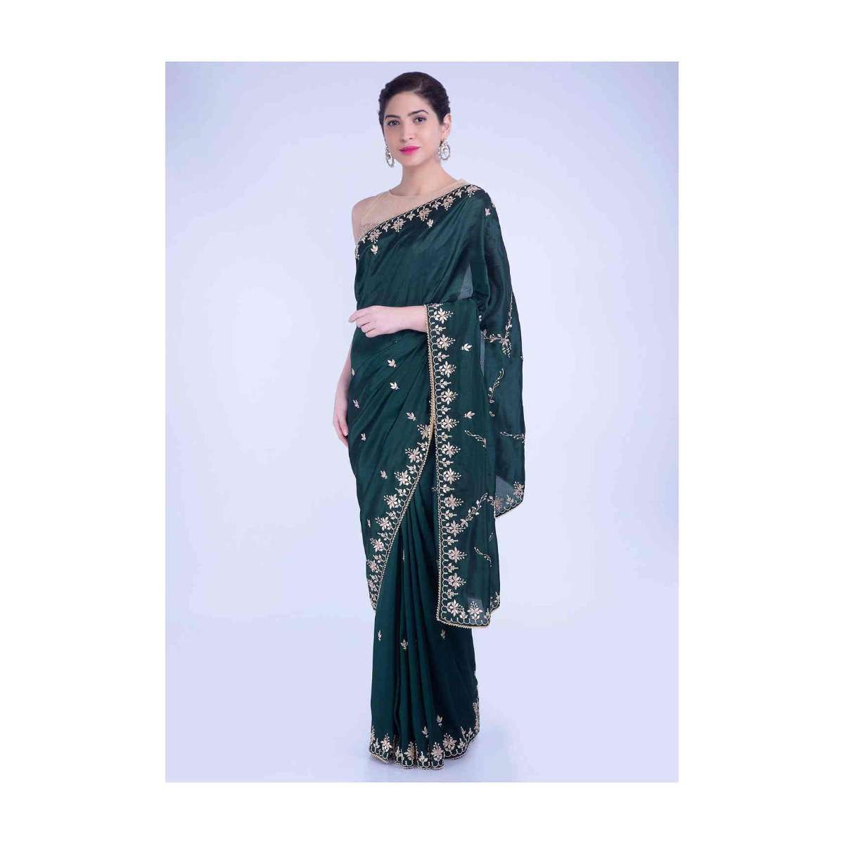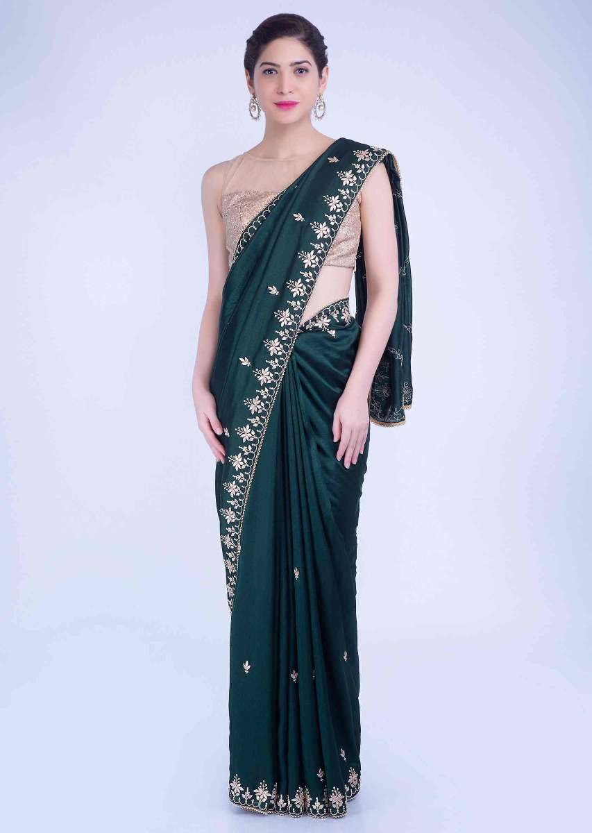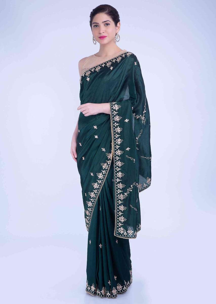 Sacramento Green Saree In Crepe Silk With Floral And Scallop Embroidered Border Online - Kalki Fashion