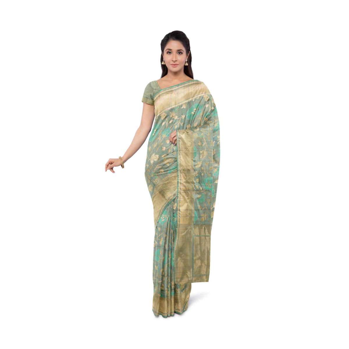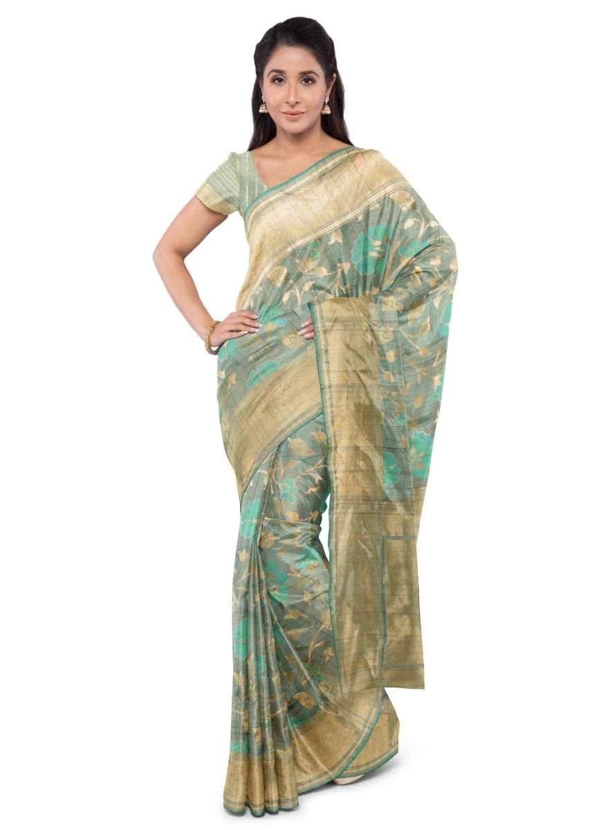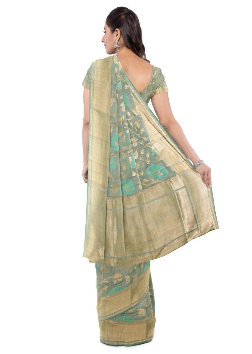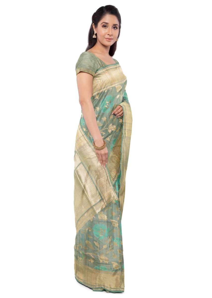 Sage Green Banarasi Saree In Jute Silk With Matching Blouse Piece Online - Kalki Fashion