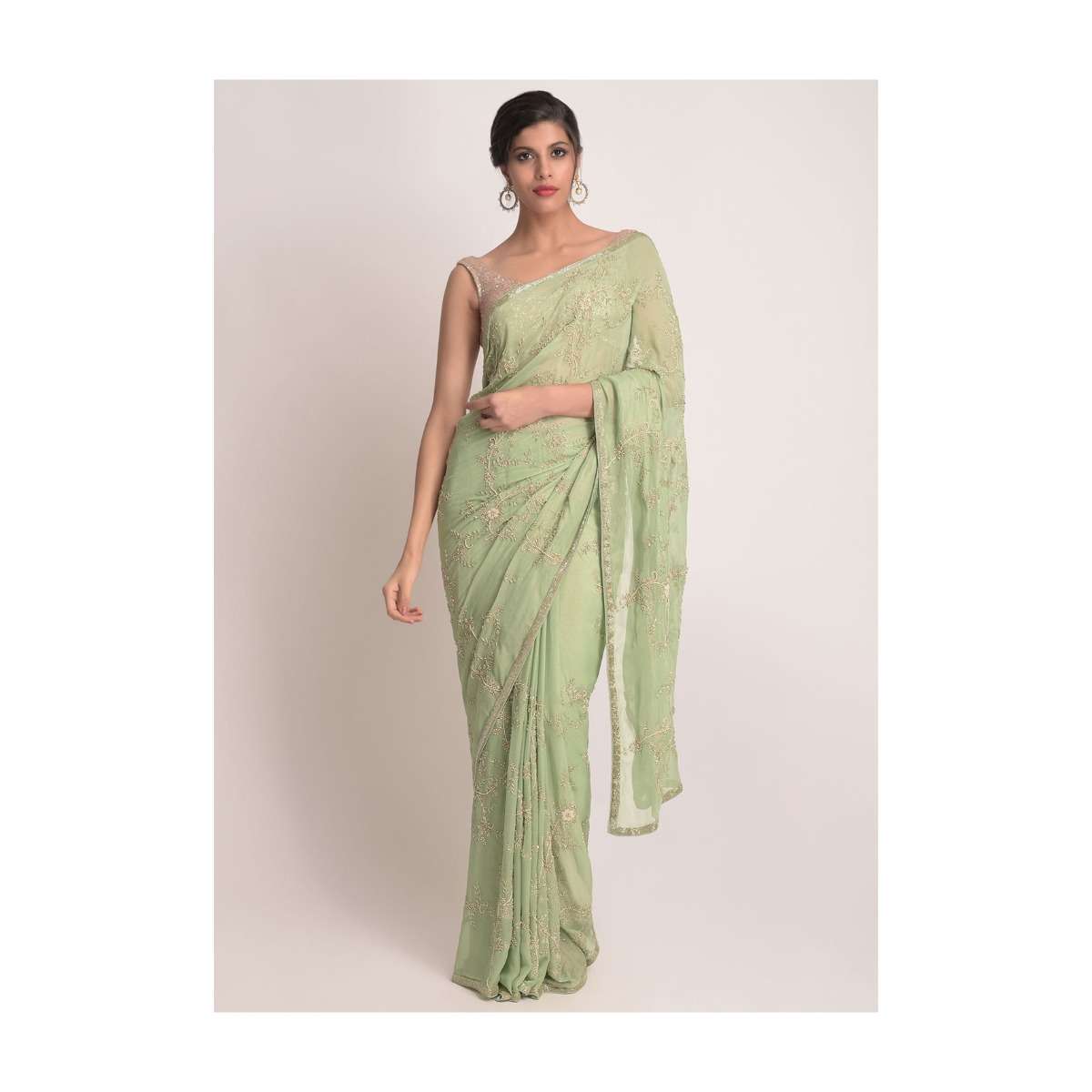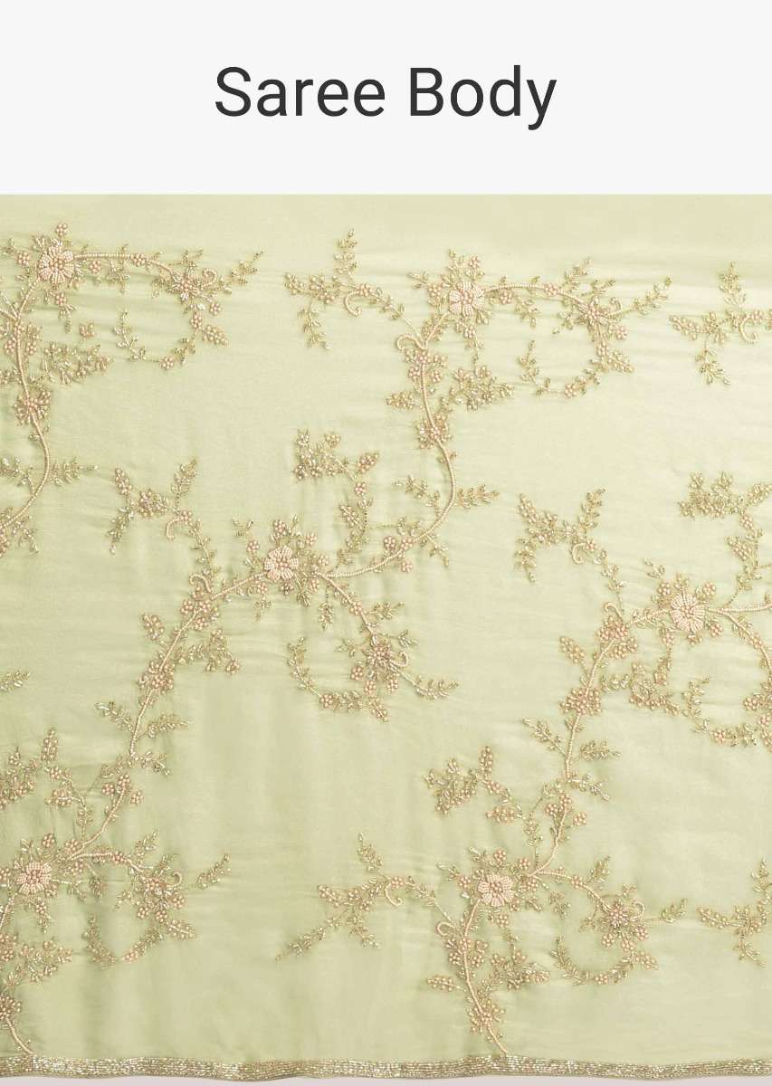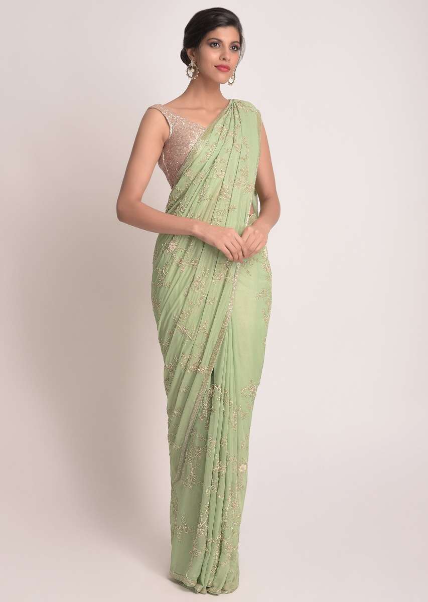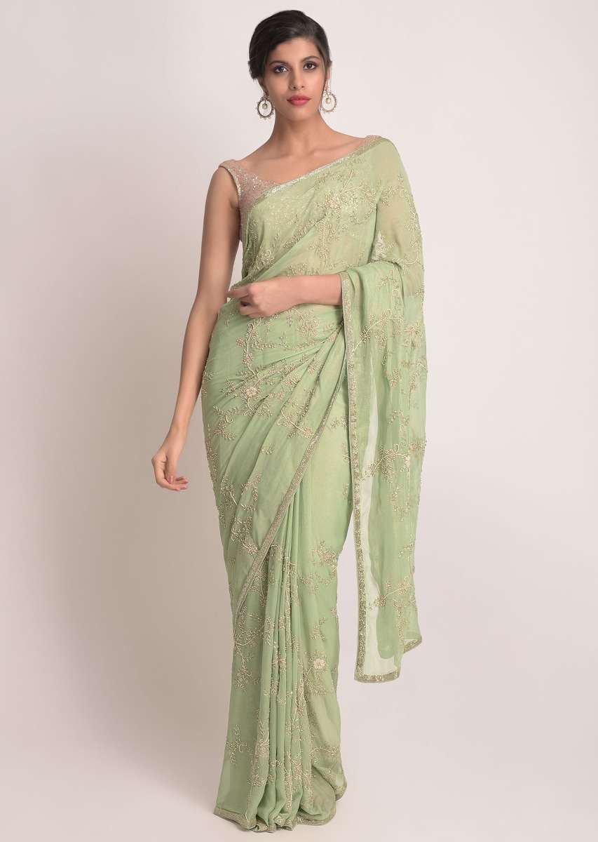 Sage Green Saree In Shimmer Georgette With Pearls, Cut Dana And Zari In Floral Pattern Online - Kalki Fashion