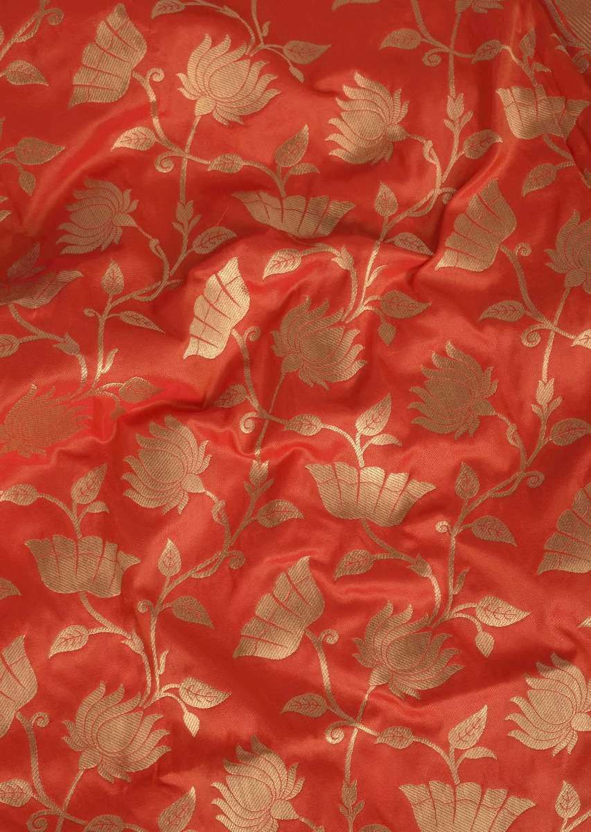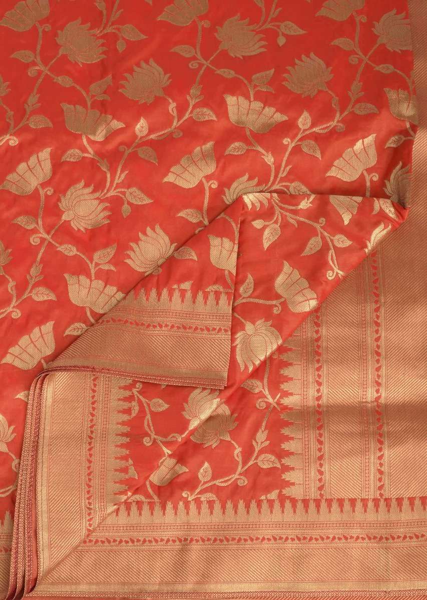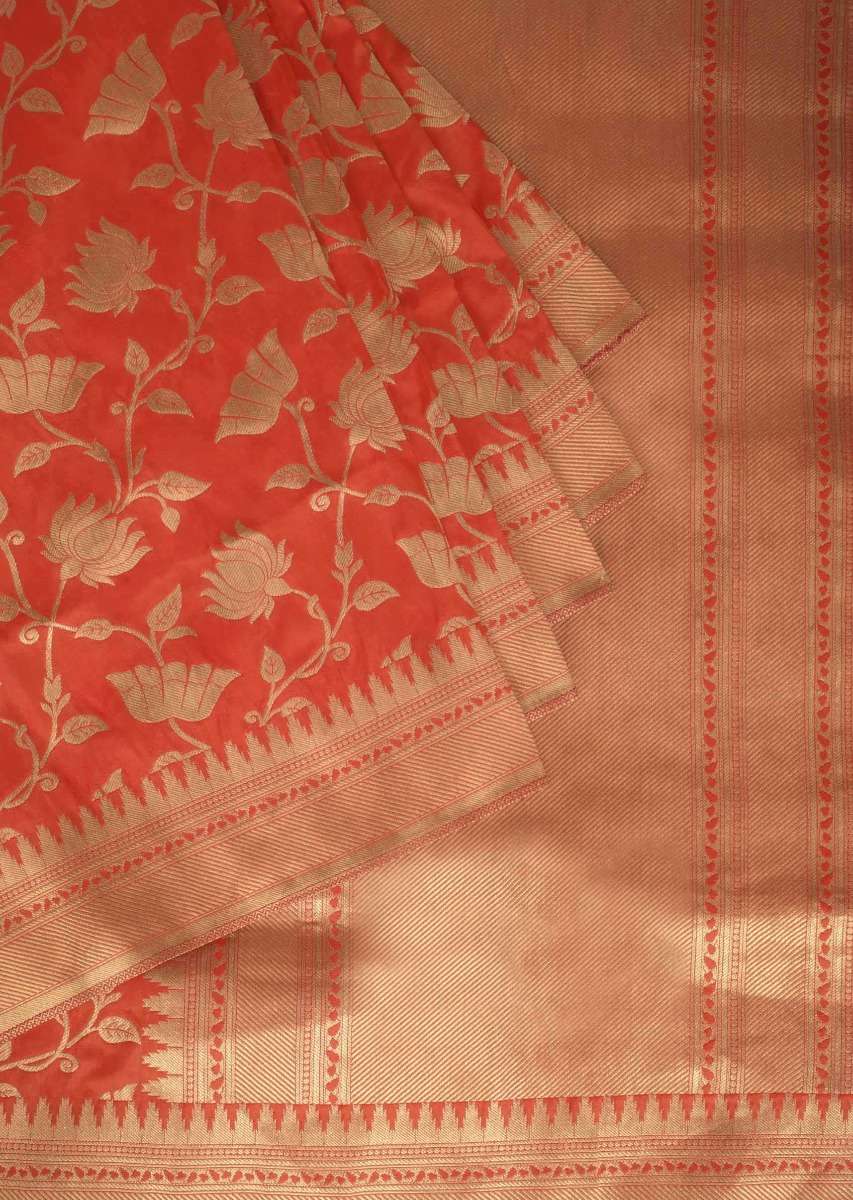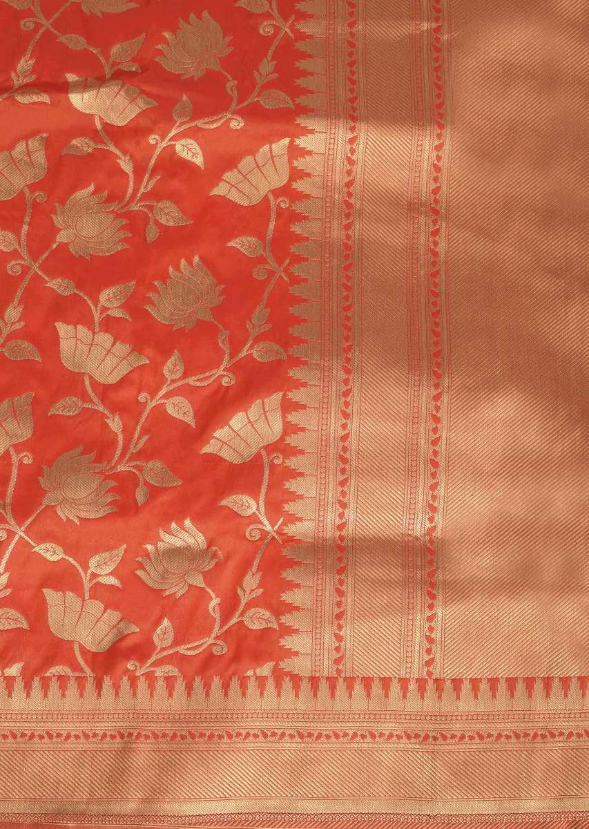 Salamander Orange Saree In Banarasi Silk With Weaved Floral Jaal In Lotus Motif Online - Kalki Fashion