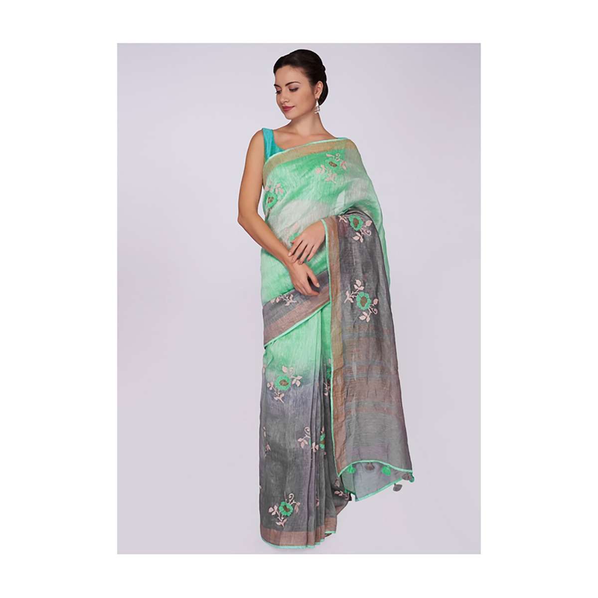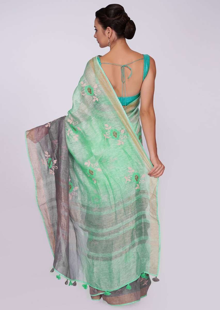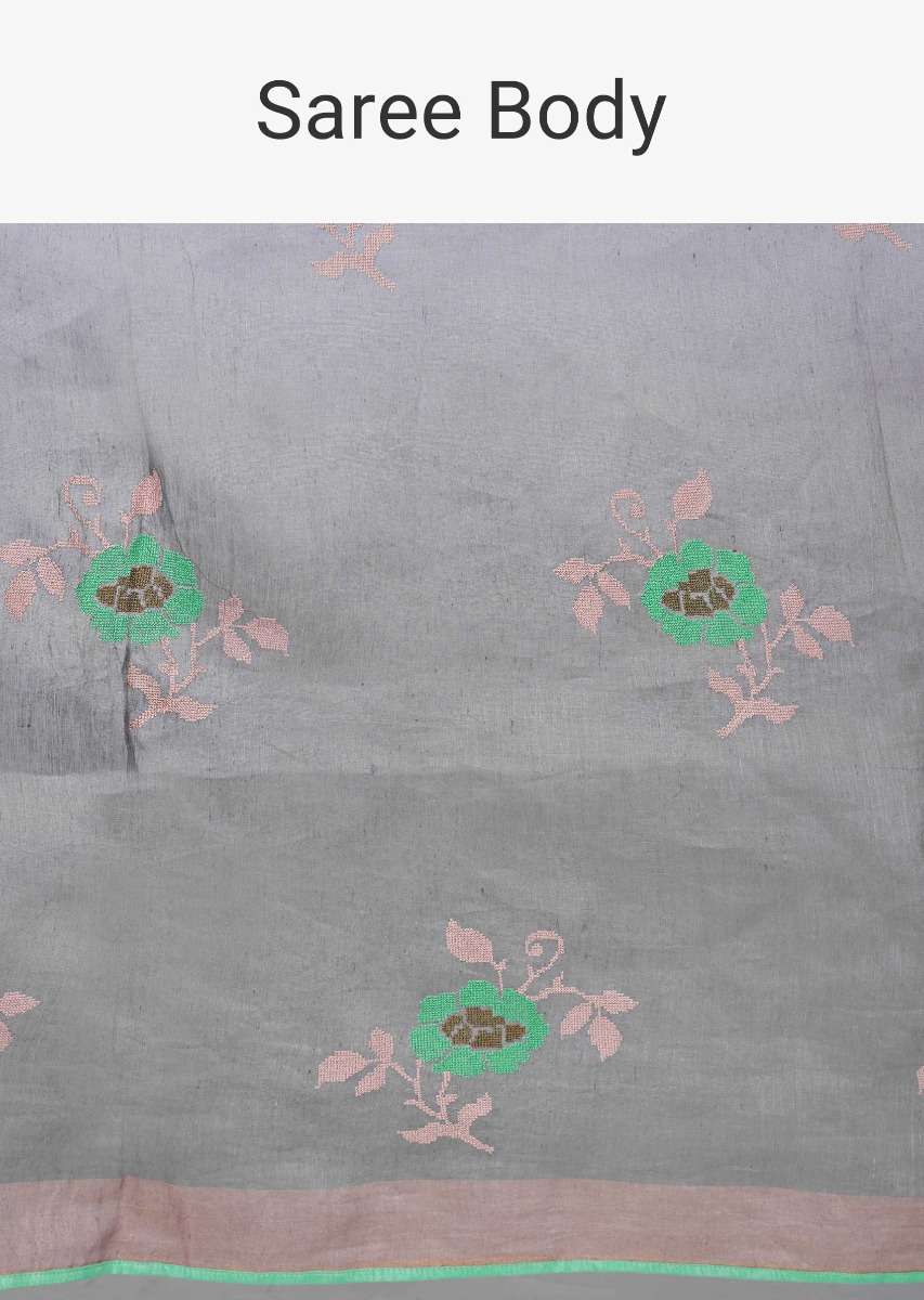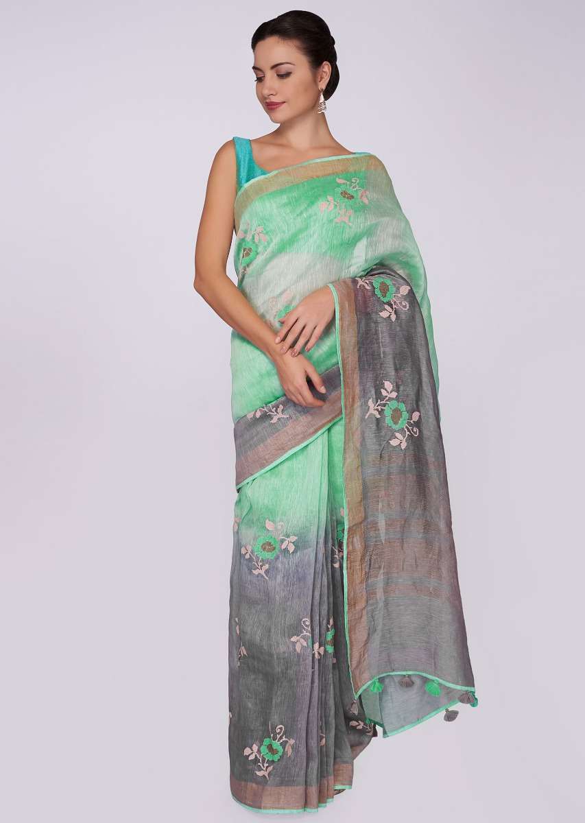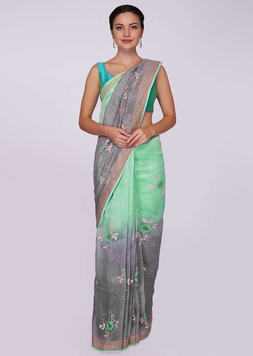 Sea Green And Grey Saree Cotton With Shaded Effect And Floral Butti Online - Kalki Fashion