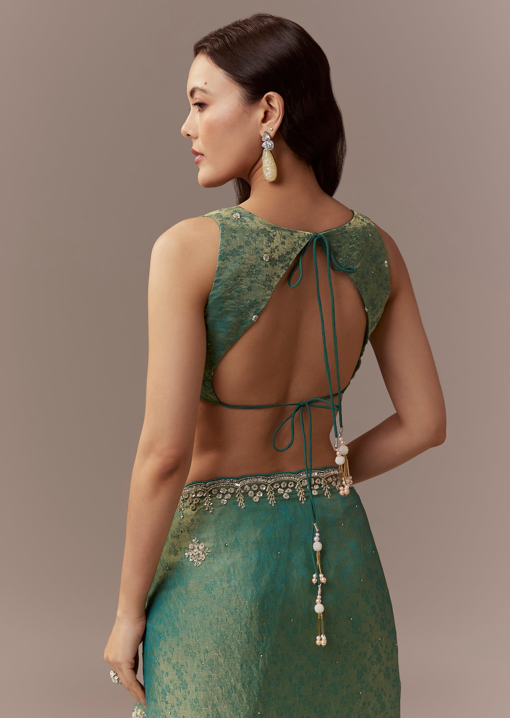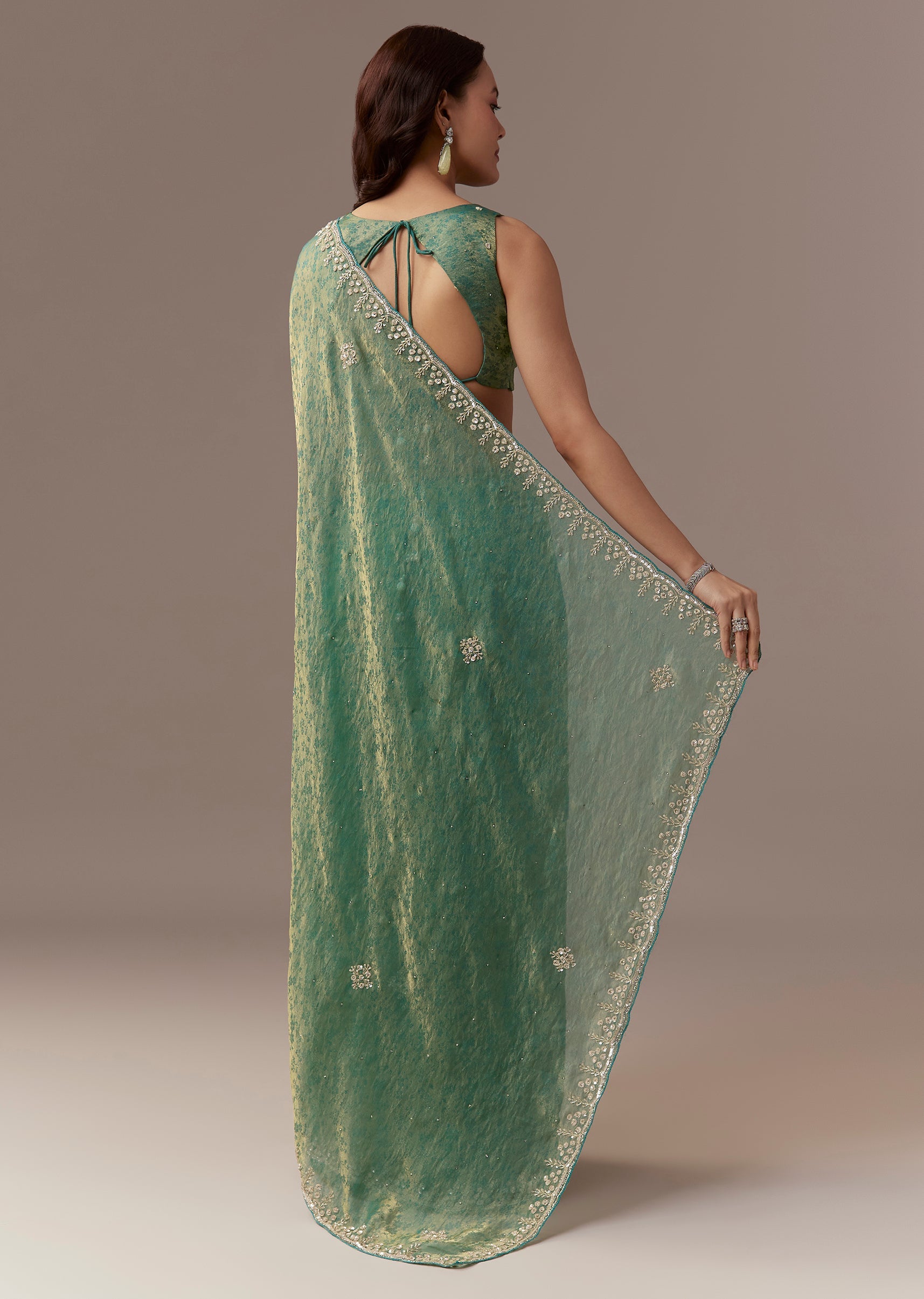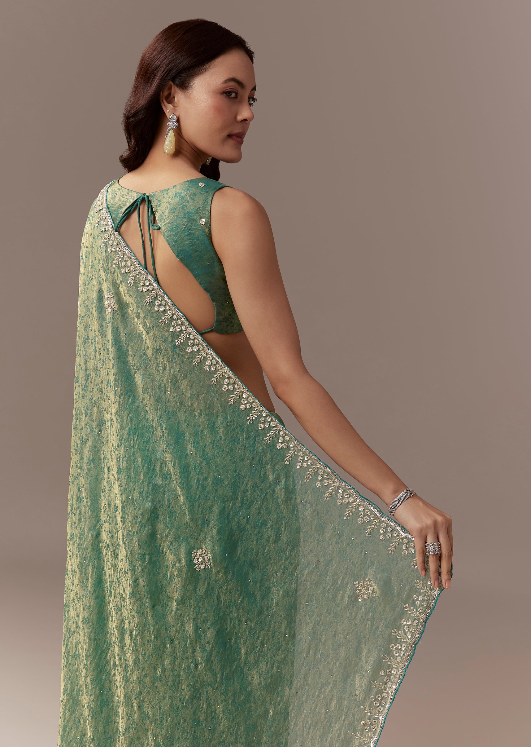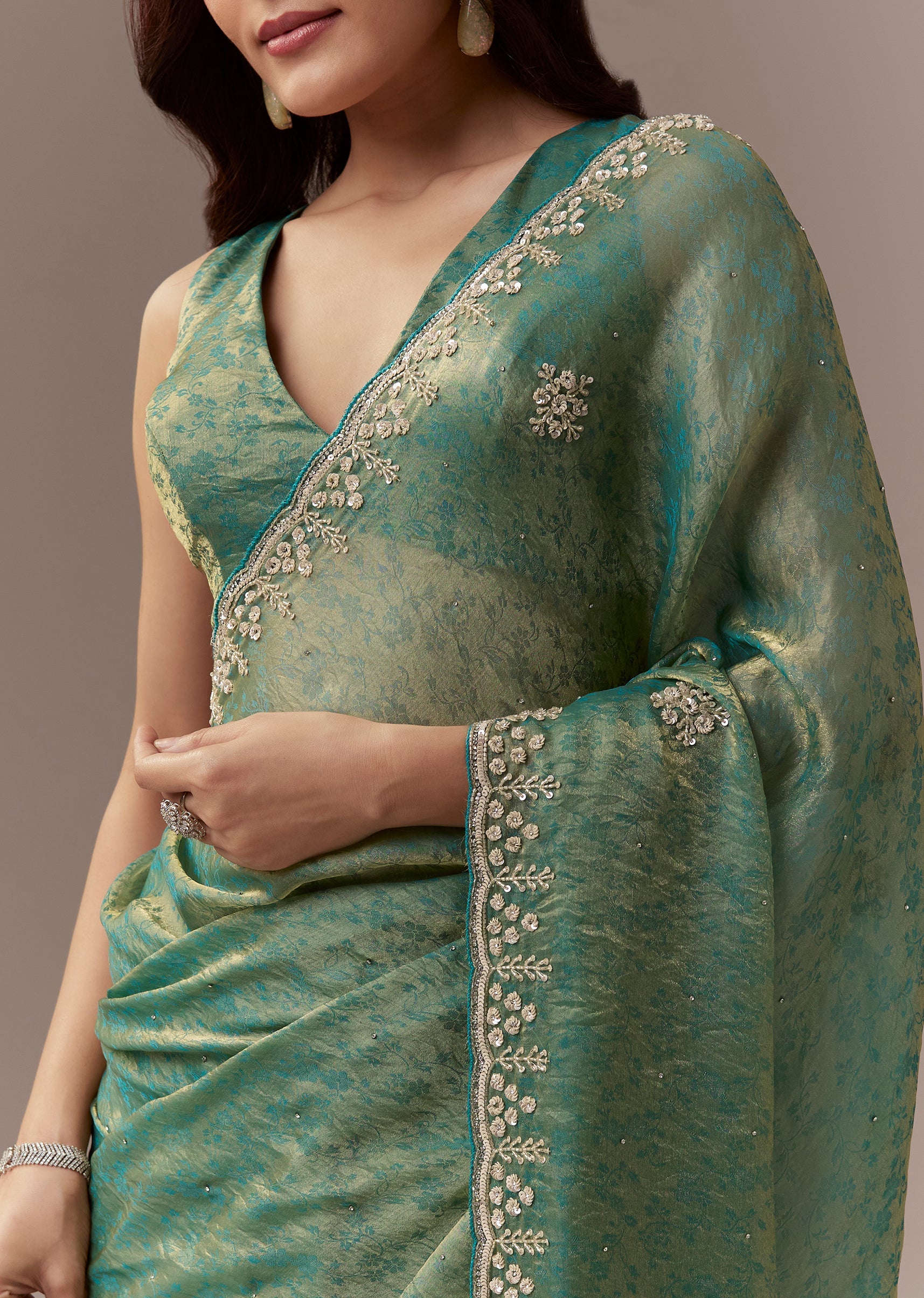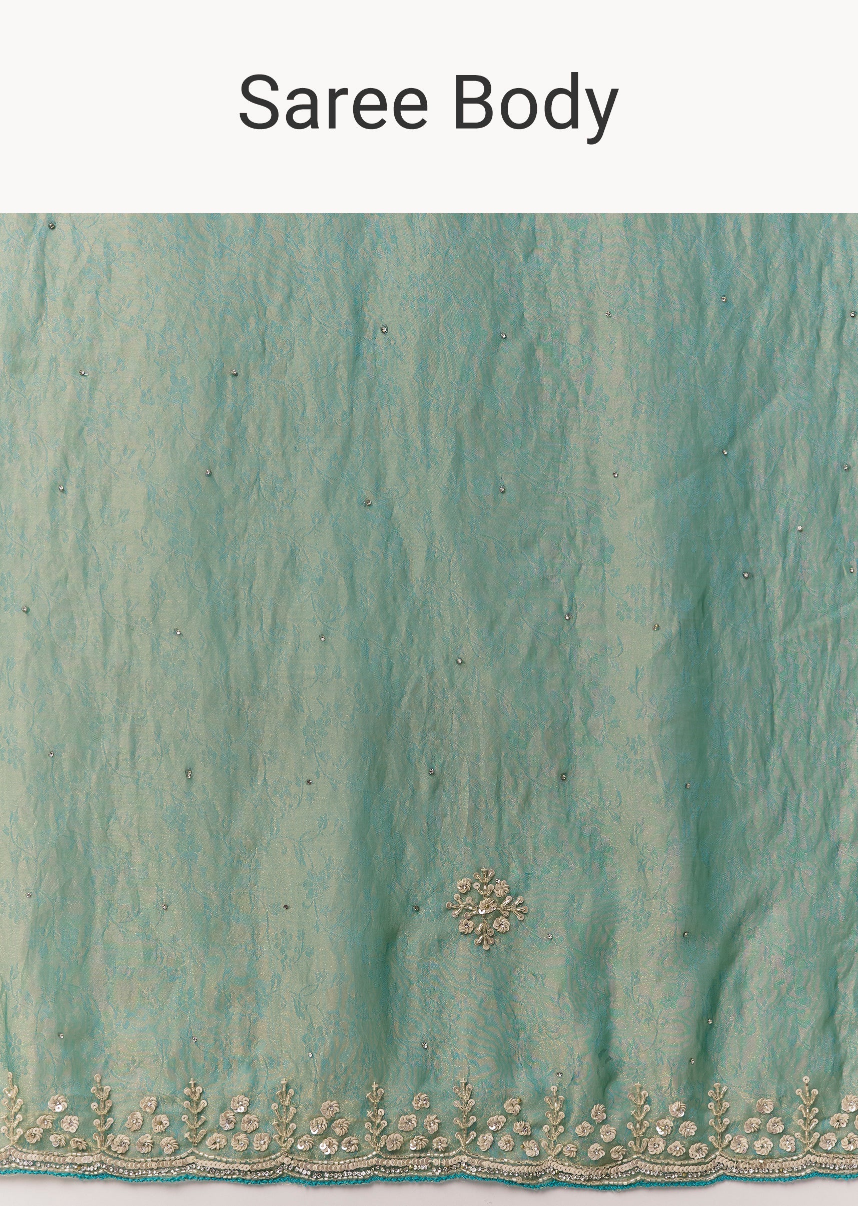 Sea Green Jacquard Tissue Saree With Cutdana Stones And Sequin Embroidery
