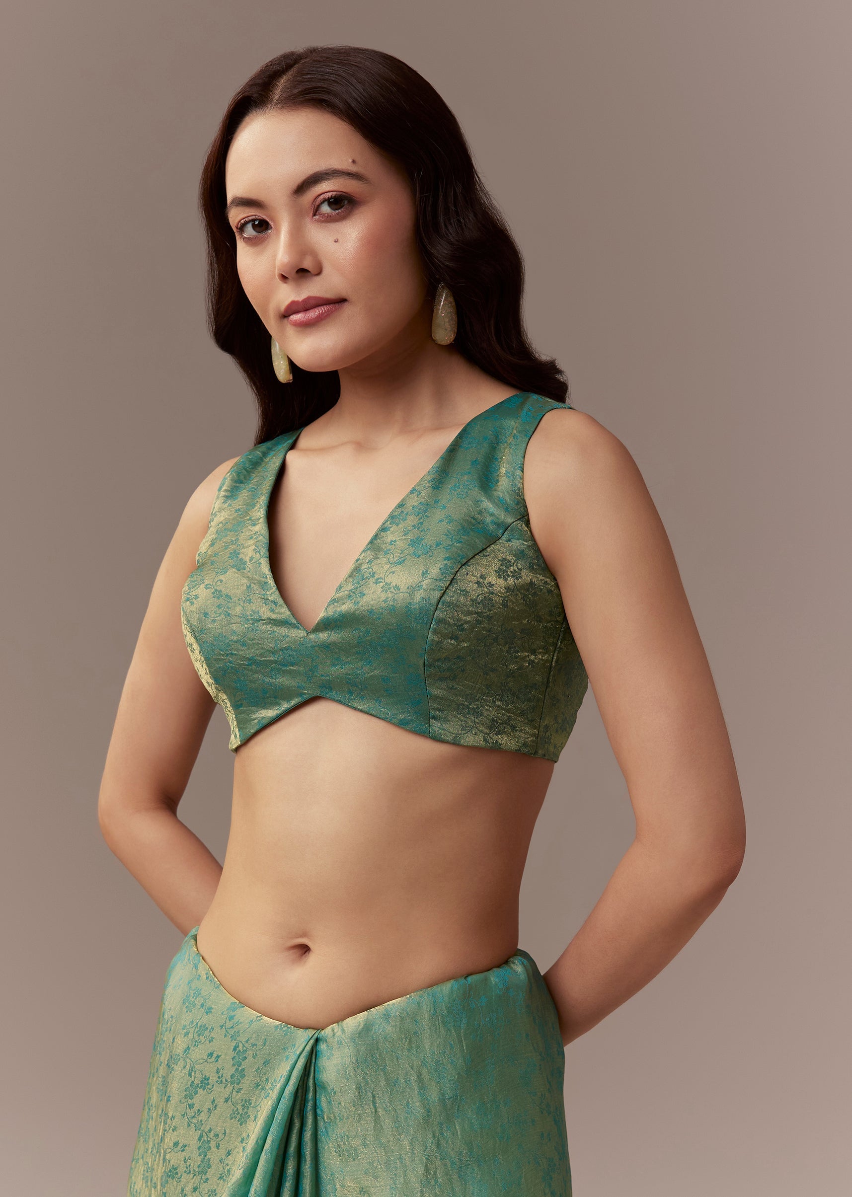 Soft elegant and festive this sea green jacquard tissue saree is perfect for mehendi celebrations as a wedding guest. The saree features a scalloped cutwork border embellished with stones and... More Product Details