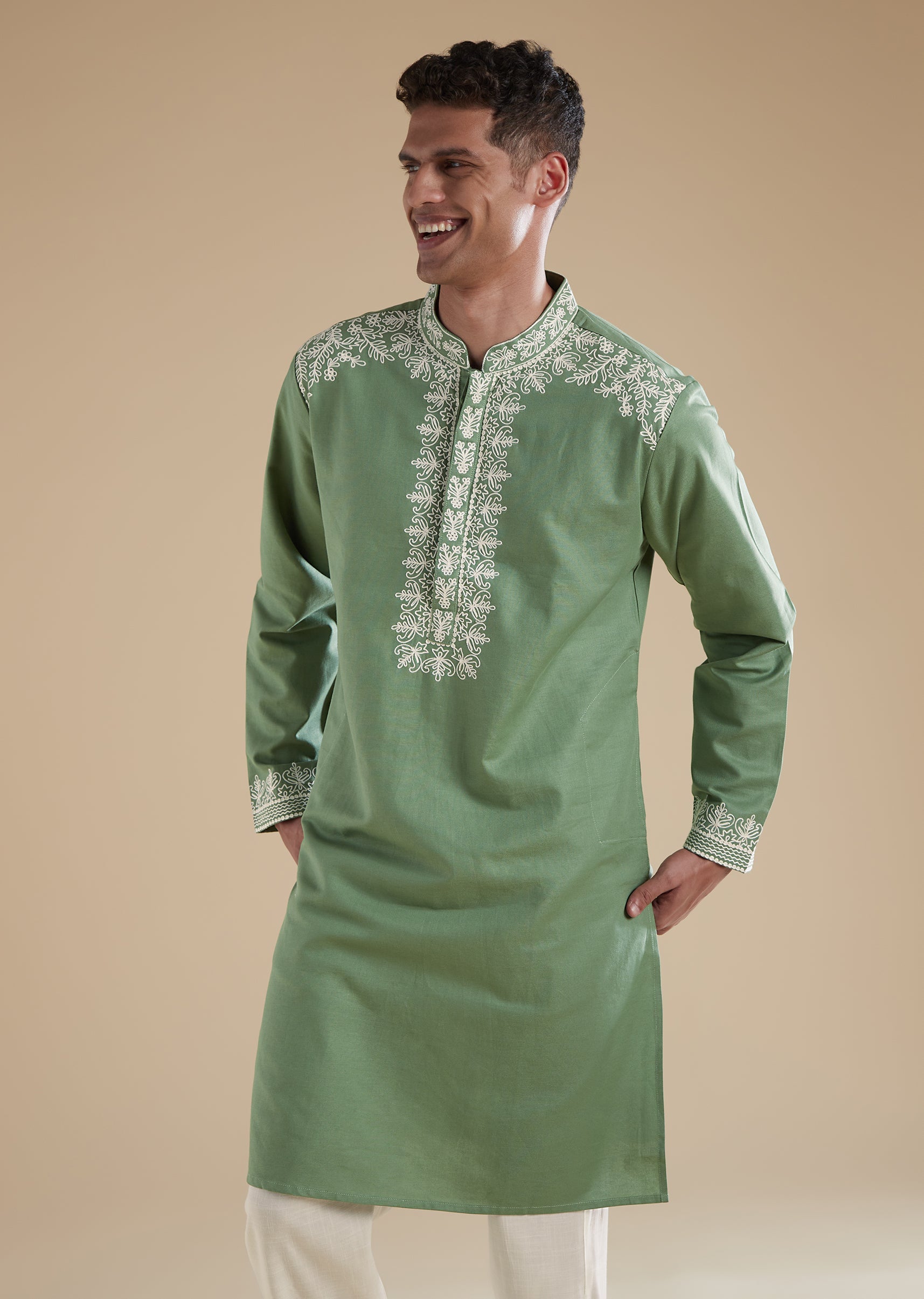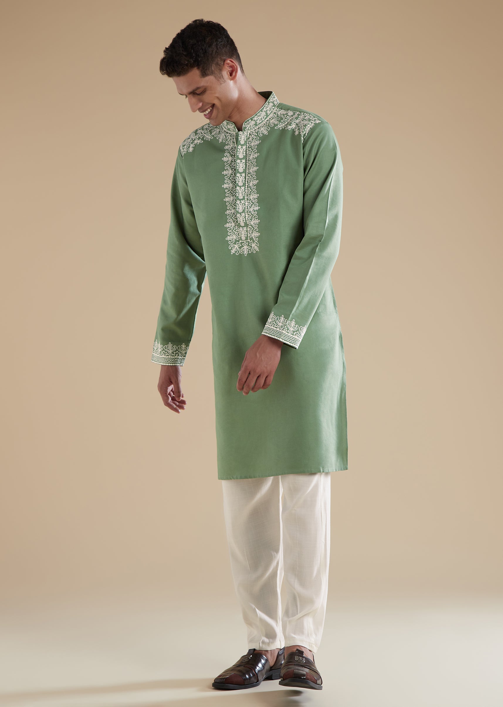 This sea green mens kurta set is crafted in soft viscose with polyester as the secondary fabric, giving it a smooth drape and a pastel refined finish. The kurta features... More Product Details