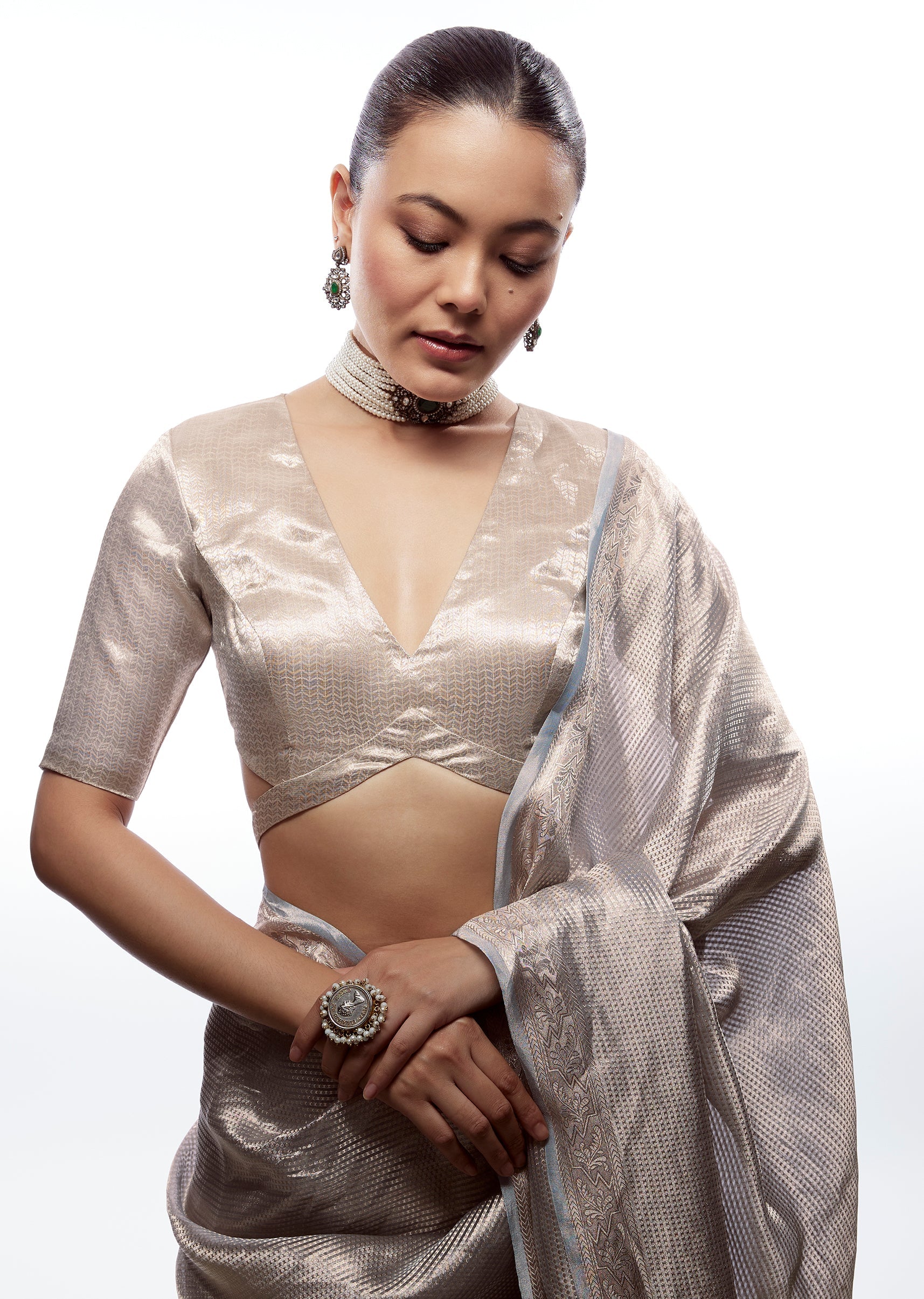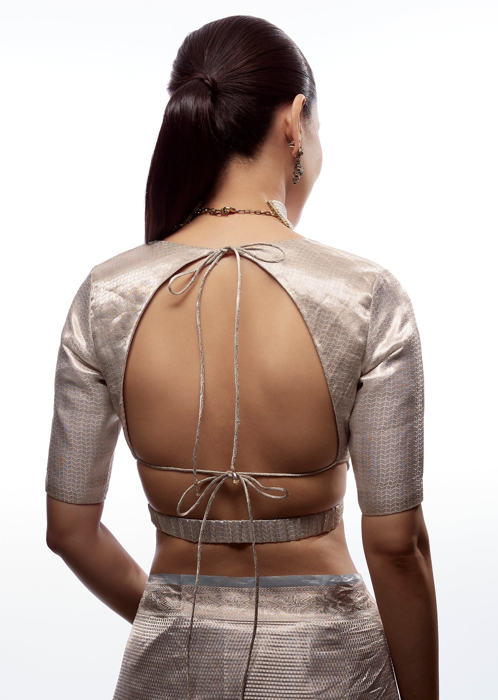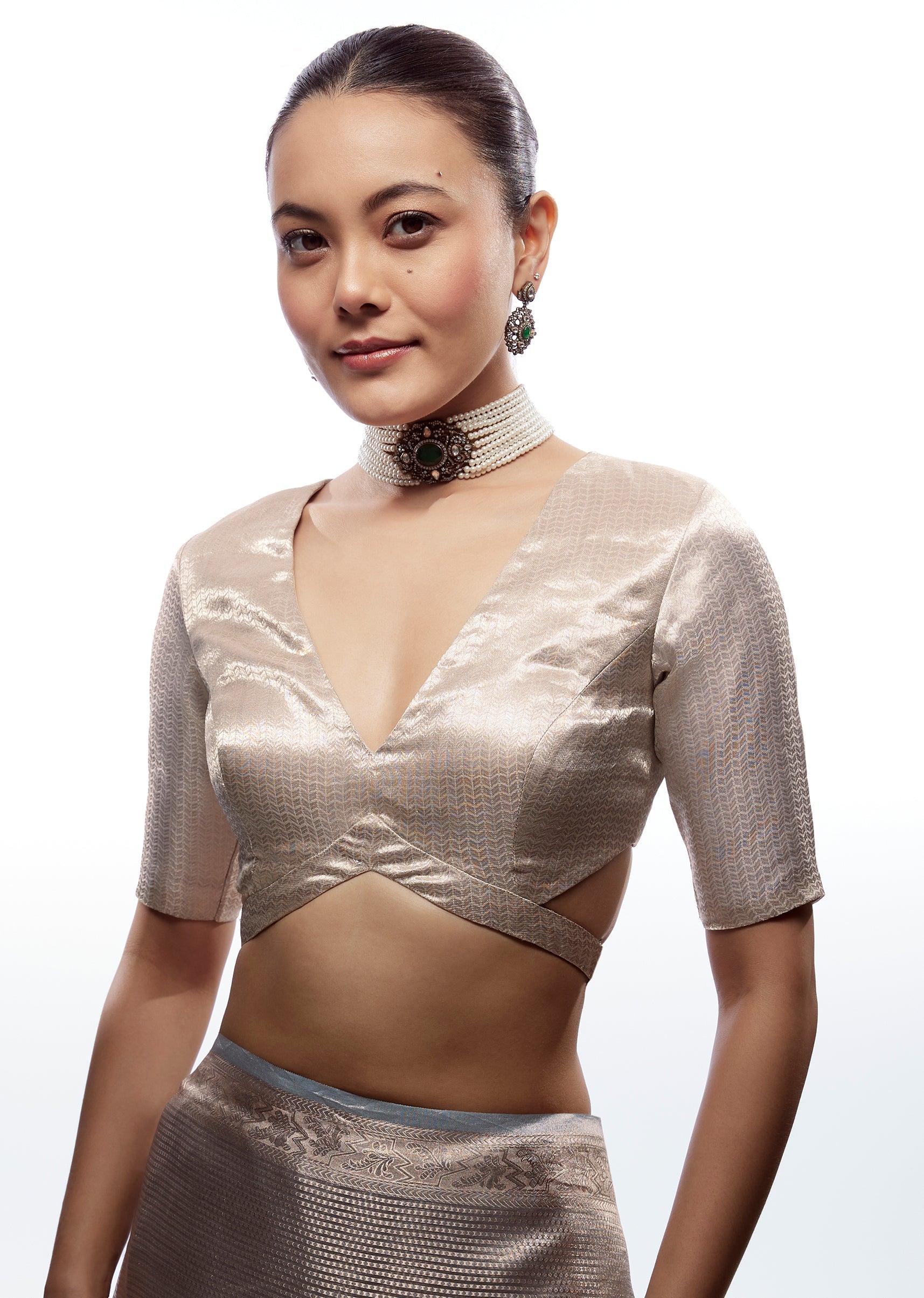 This silver brocade blouse features a V-neckline with half sleeves and a back dori opening for adjustability. Shimmery yet refined, it’s perfect for receptions and festive evenings. Awarded as the Most Trusted Brand, we're delivering styles you love,