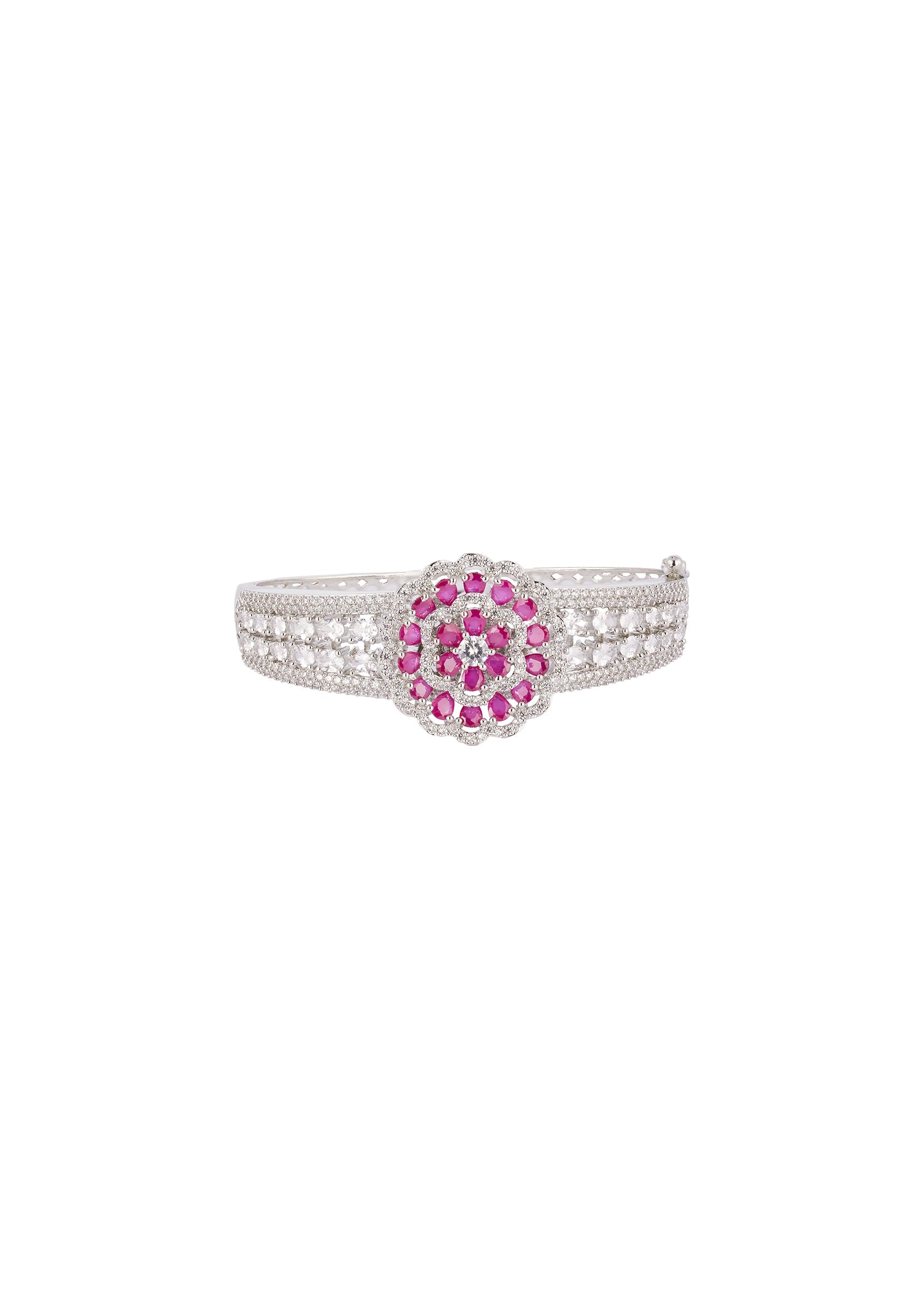 Silver Finish Bracelet In Mix Metal With Elegant Floral Style And Rani Pink Simulated Rubies And Cubic Zirconia Accents