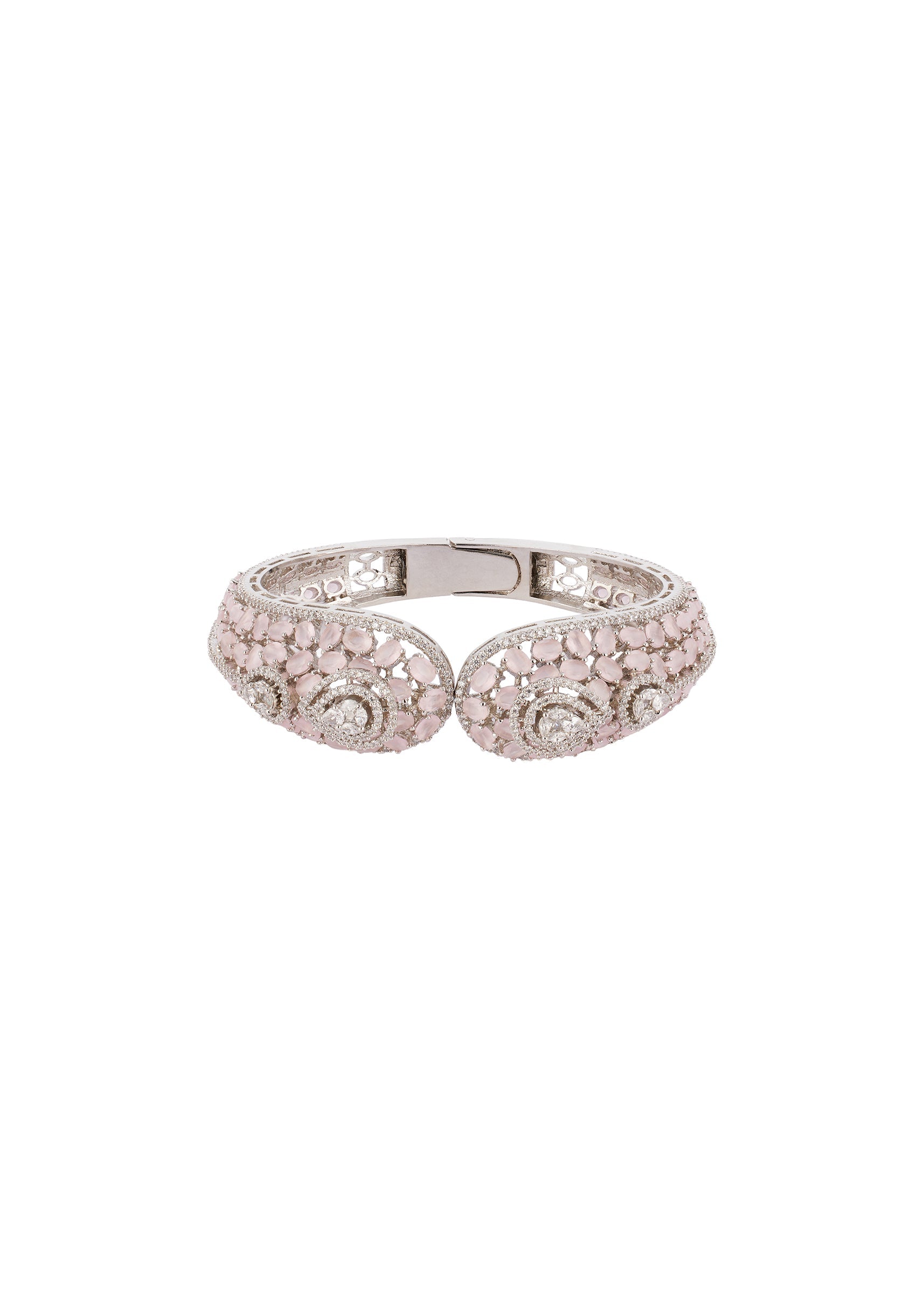 Pair this bracelet with a pastel saree, lehenga, or anarkali to highlight the rose design and light pink cubic zirconia accents.