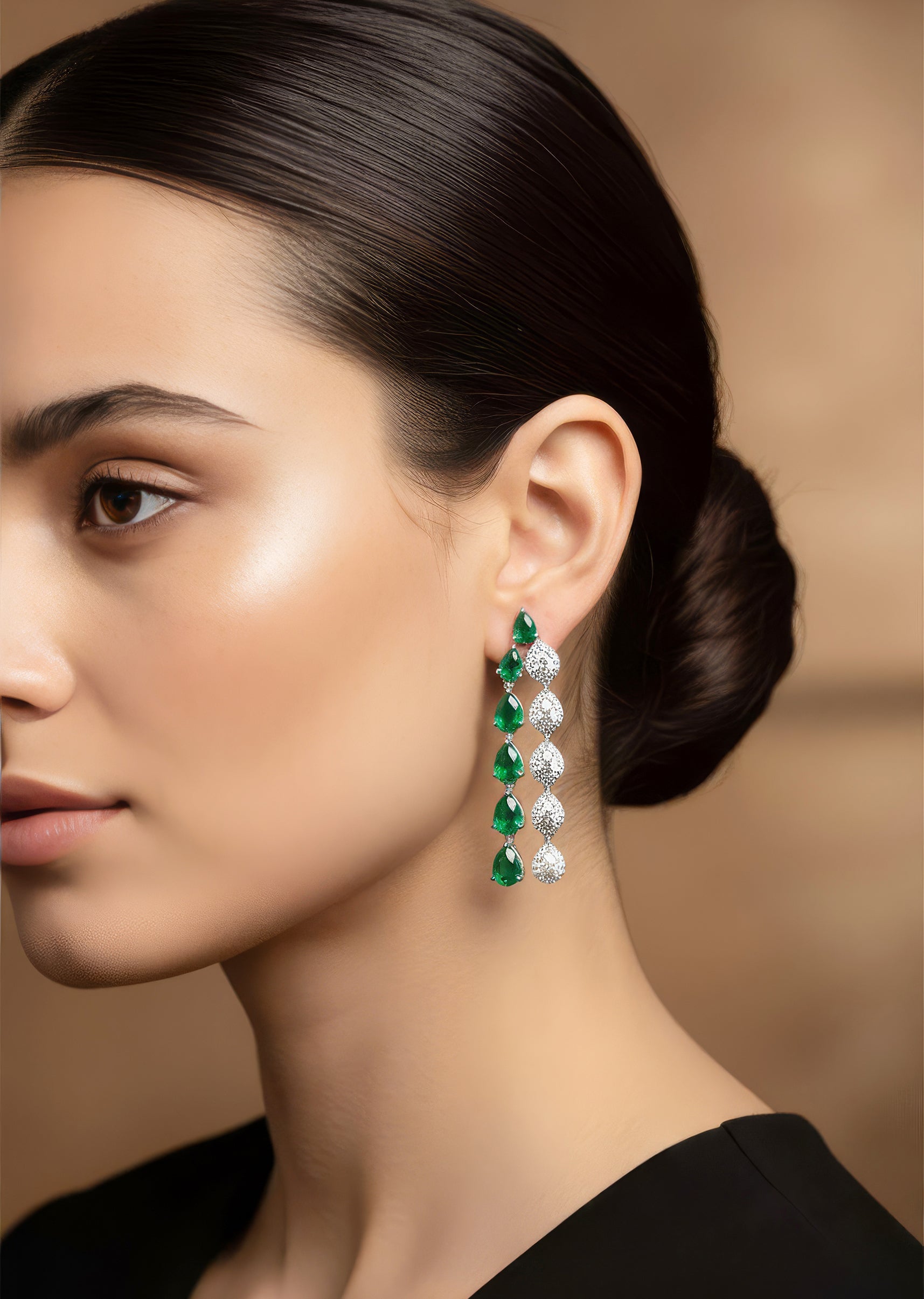 A modern pair of silver finish earrings designed with elegant graduated green simulated stones and refined mix metal detailing. The sleek silhouette makes them ideal for reception evenings, cocktail parties, and sangeet celebrations. A versatile statement choice for bridesmaids and wedding guests.