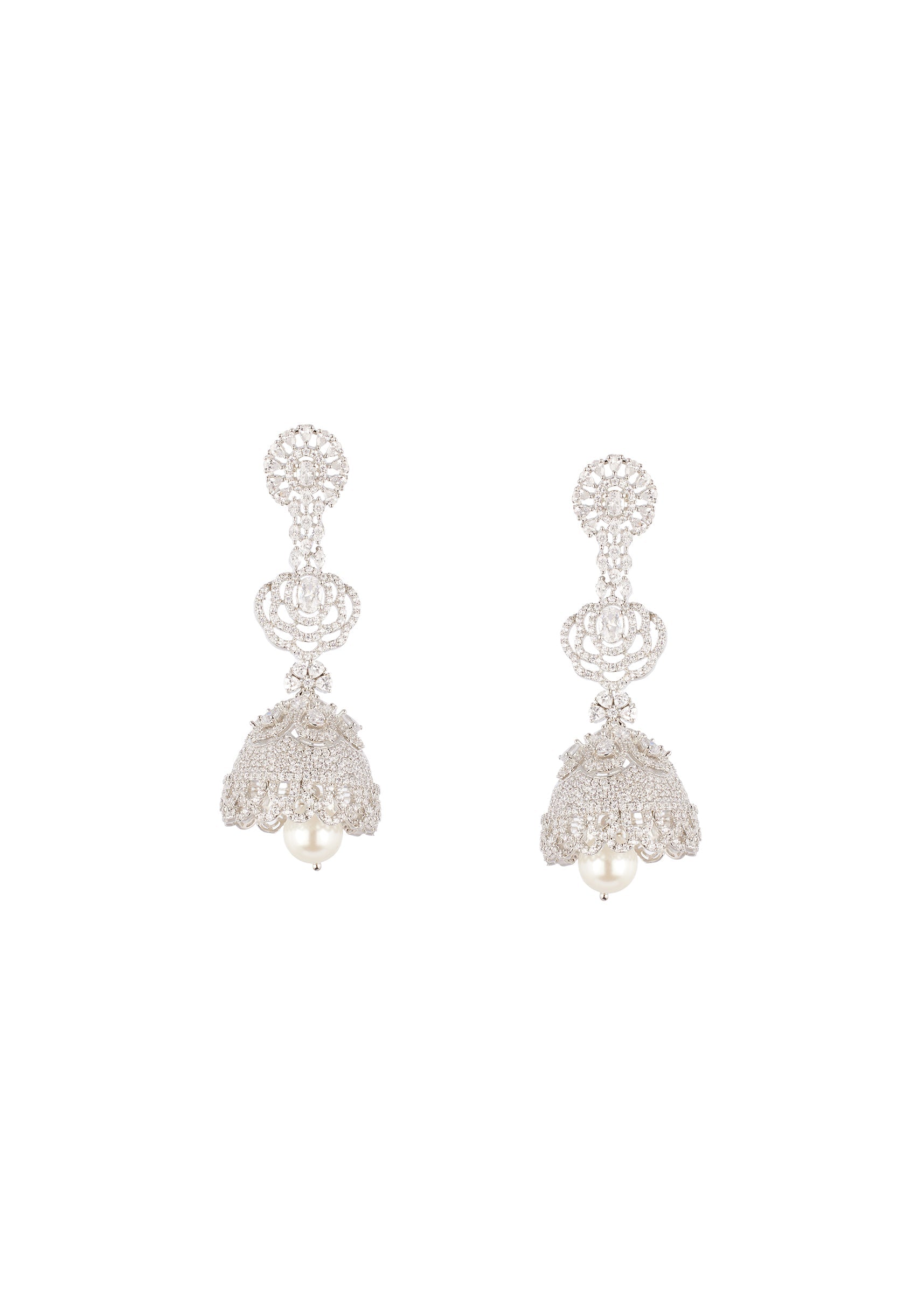 Silver Finish Earrings In Mix Metal With Jhumka Style Cubic Zirconia And Faux Pearl Drop