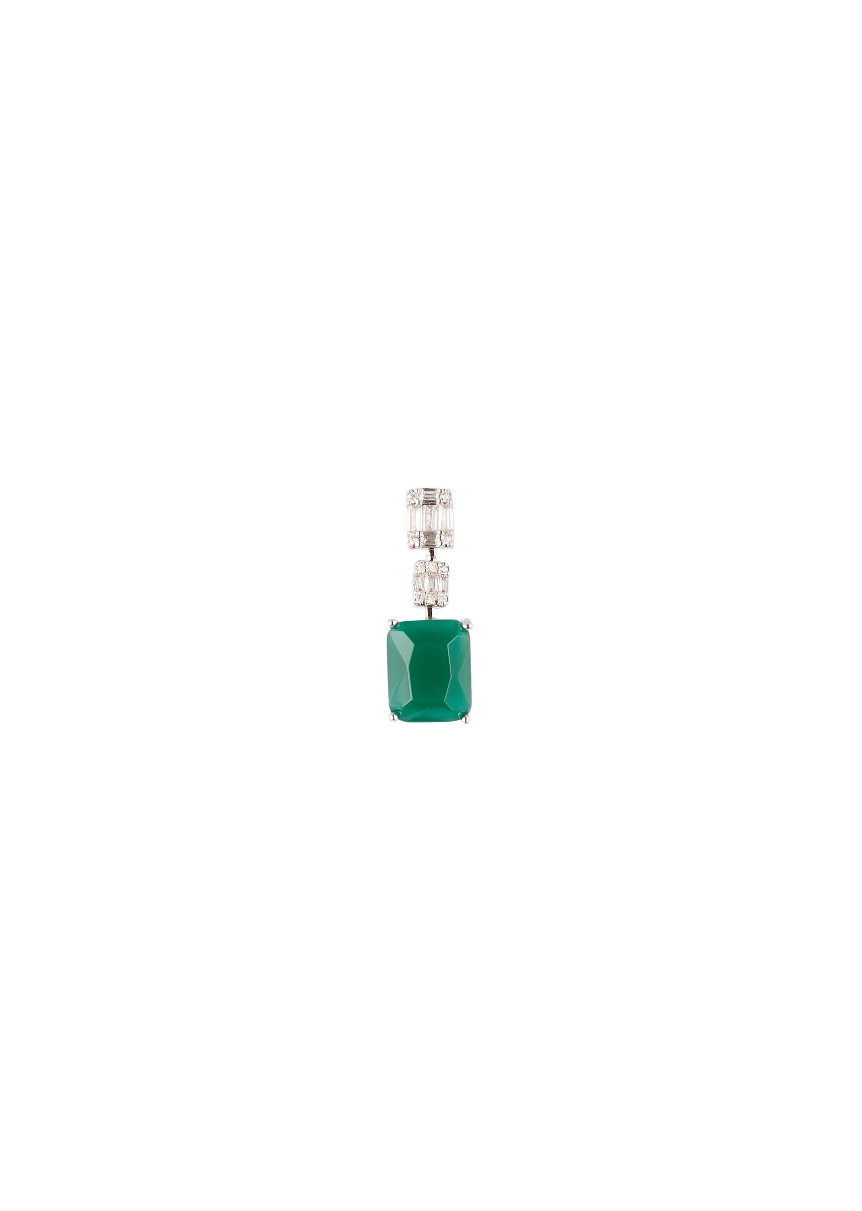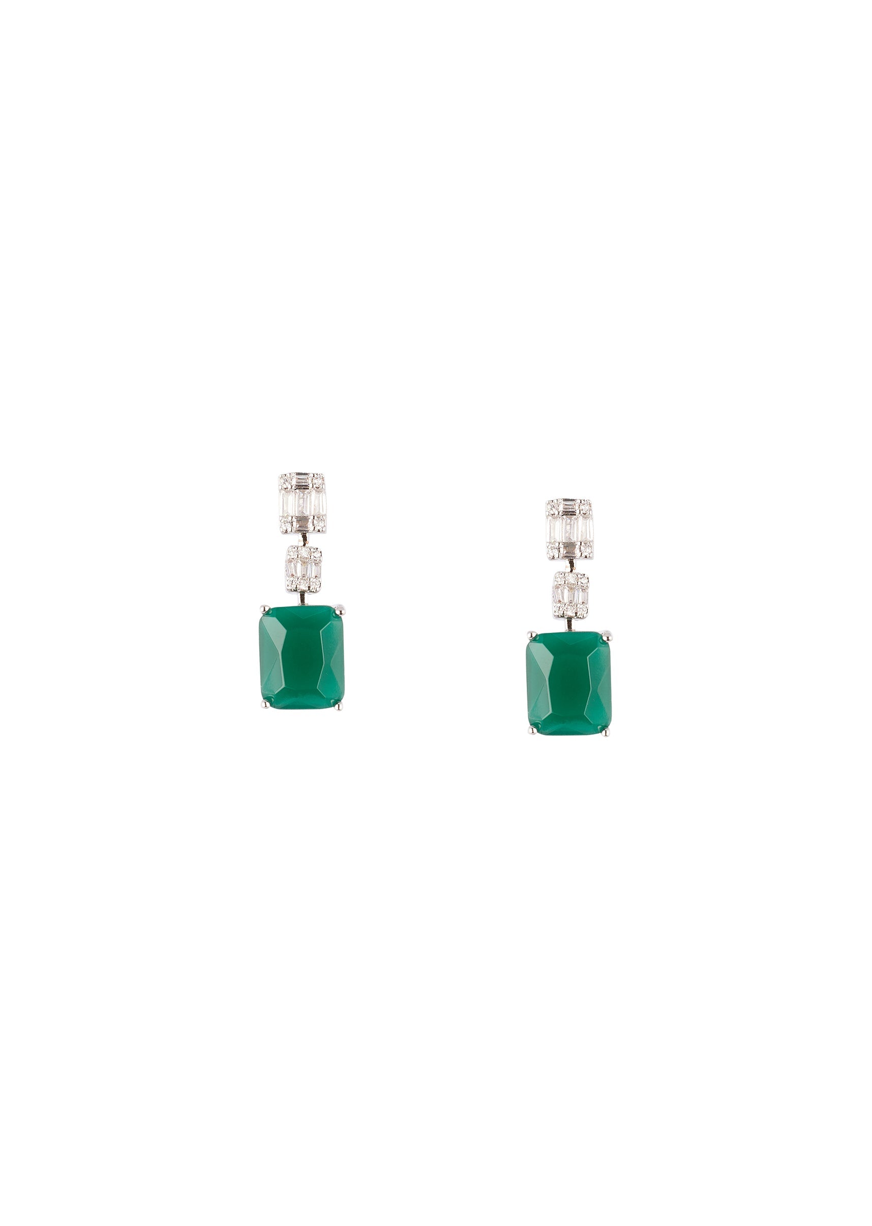 A modern pair of silver finish earrings featuring subtle mix metal detailing and a striking large green emerald style stone. The contemporary design adds a bold and elegant touch, perfect for reception evenings, cocktail parties, and festive celebrations for bridesmaids and wedding guests. Awarded as the Most Trusted Brand, we're delivering styles you love, just as promised.