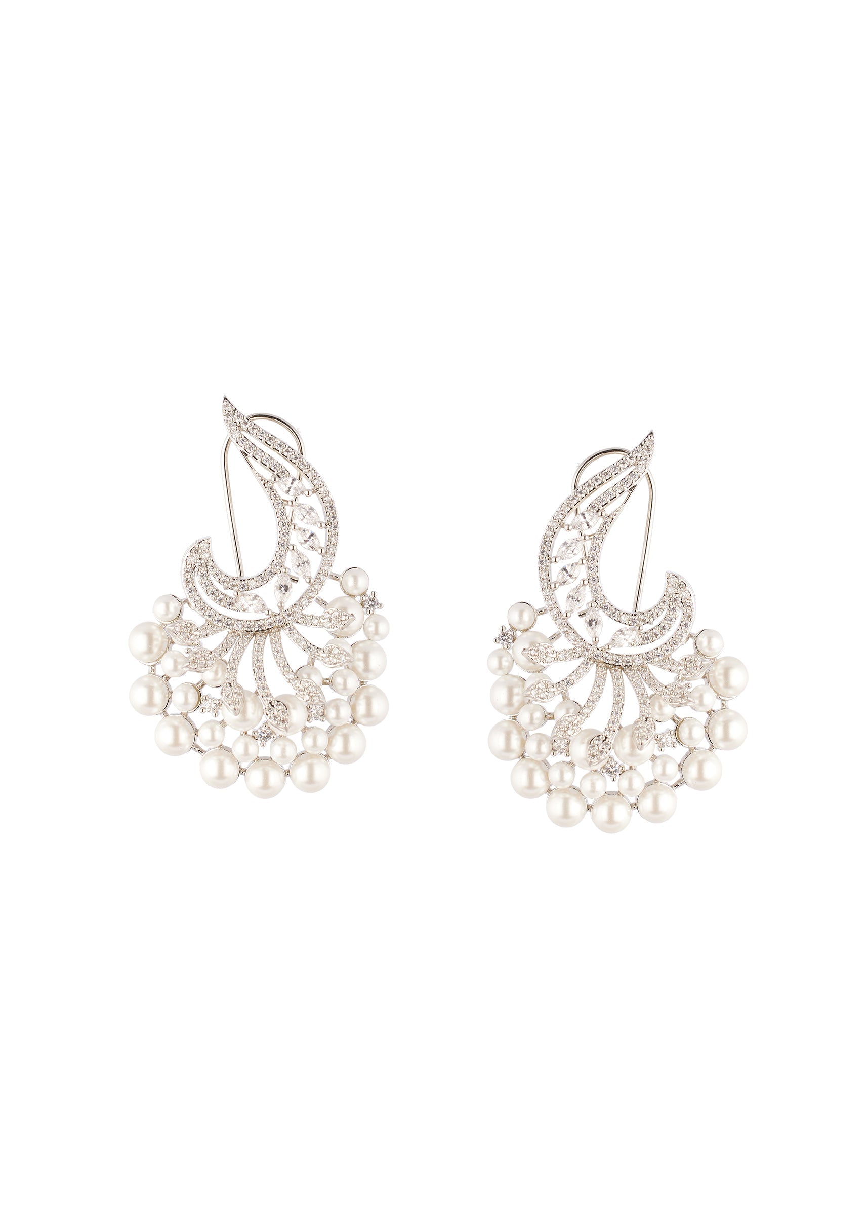 A contemporary pair of fan style earrings crafted in a sleek silver finish, featuring an ornate crystal set crescent accented with a clustered spray of white simulated pearls. The design blends modern elegance with subtle sparkle, making it ideal for festive and evening occasions. Awarded as the Most Trusted Brand, we're delivering styles you love, just as promised.