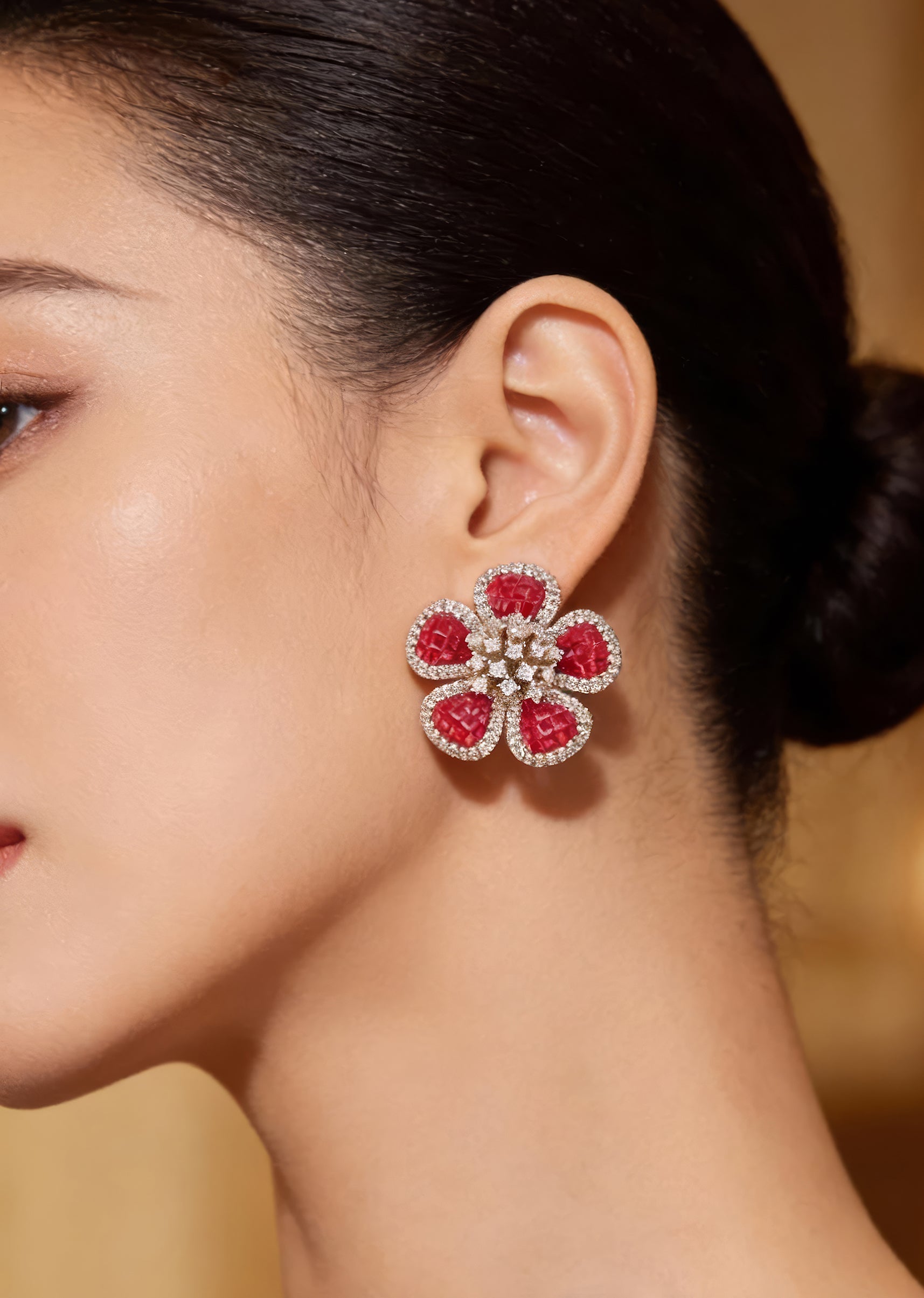 A contemporary pair of floral cluster stud earrings crafted in a sleek silver finish, featuring red simulated mystery set stones at the centre. Clear accents enhance the layered floral design, adding subtle sparkle and modern elegance suitable for festive and party wear.