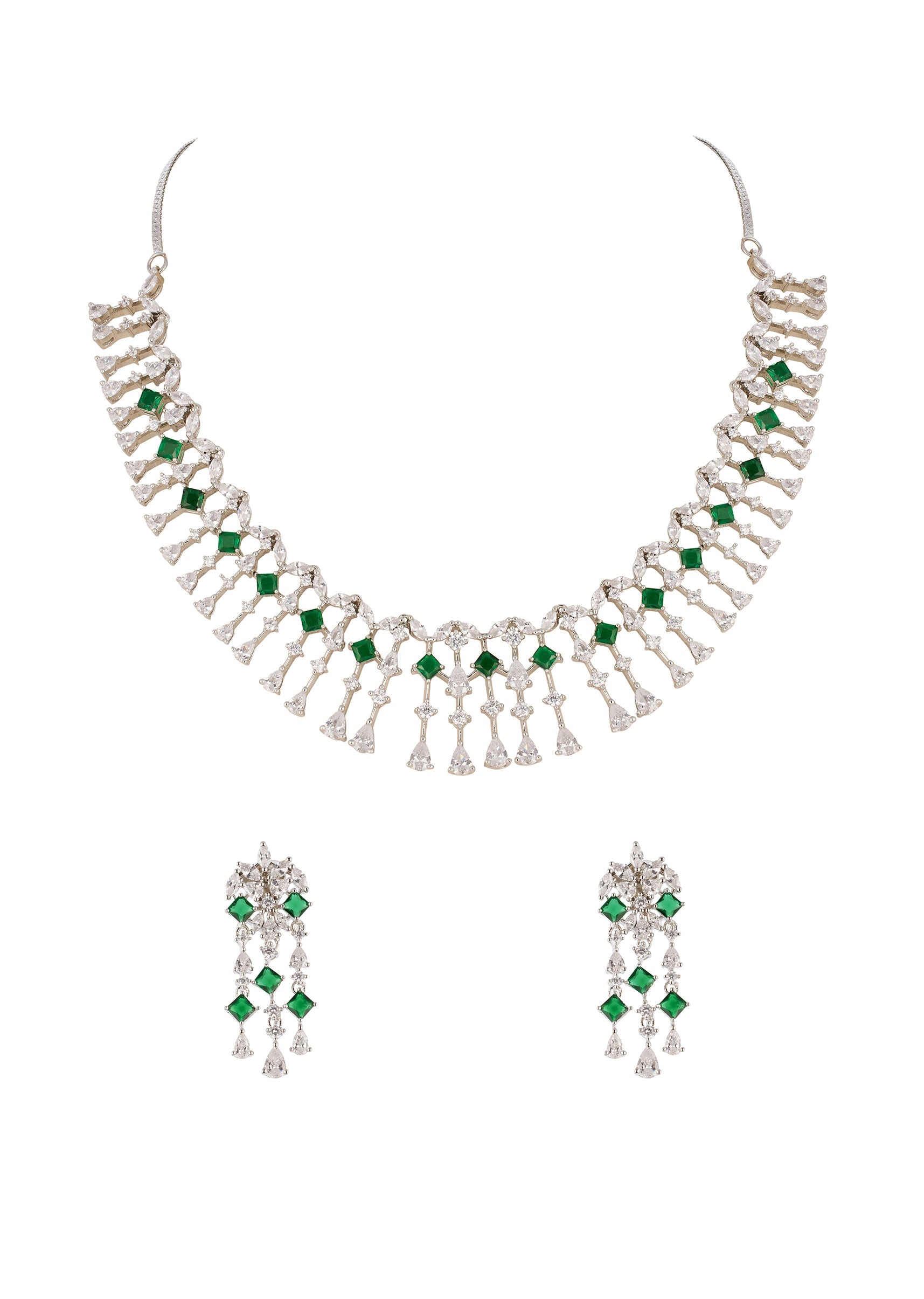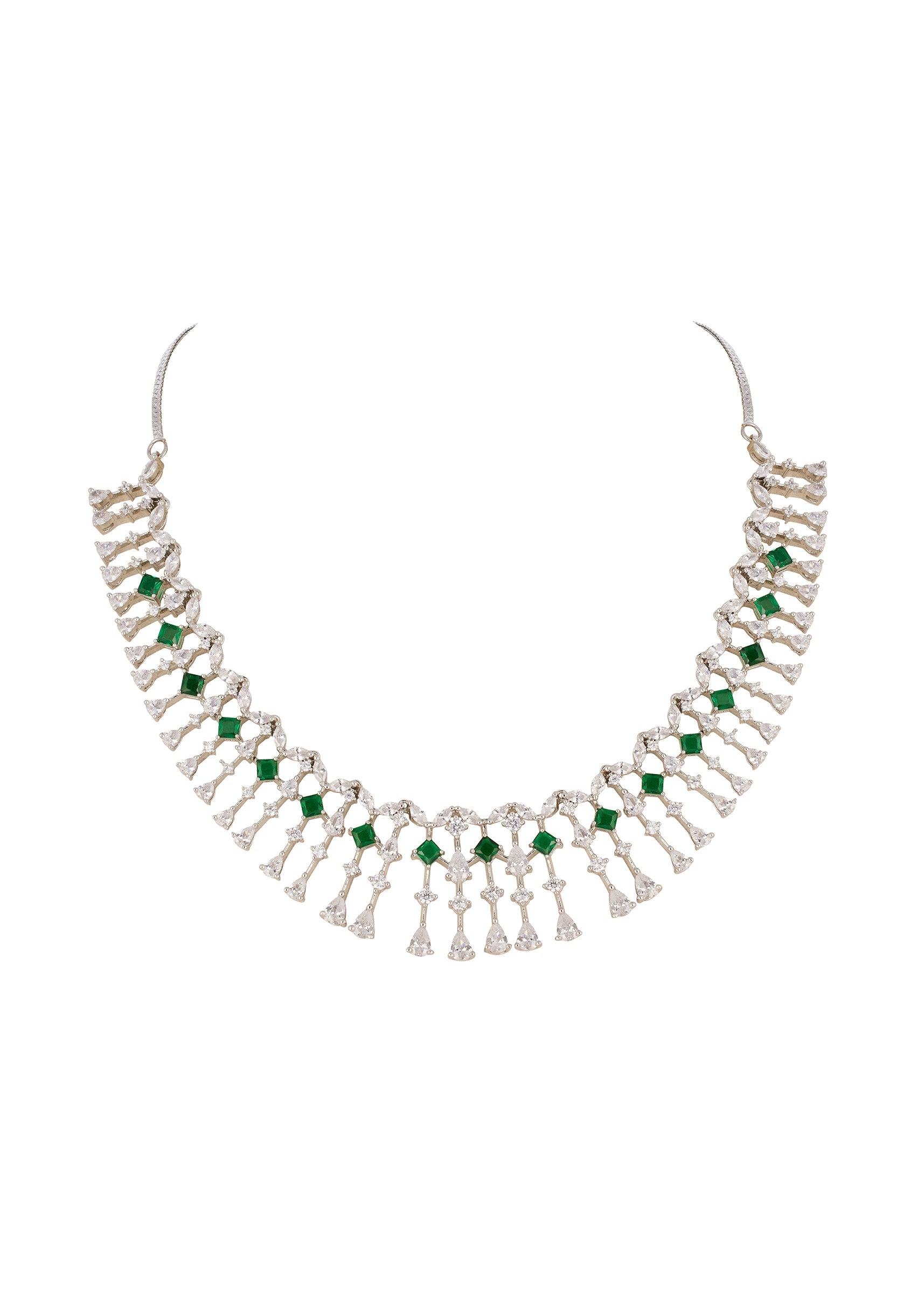 This modern silver finish necklace set is crafted in mix metal and features a fringe inspired design highlighted with green simulated emerald stones and cubic zirconia. The layered movement and rich green tones create a bold yet refined look, making it ideal for festive occasions and statement evening wear. Awarded as the Most Trusted Brand, we're delivering styles you love, just as promised.