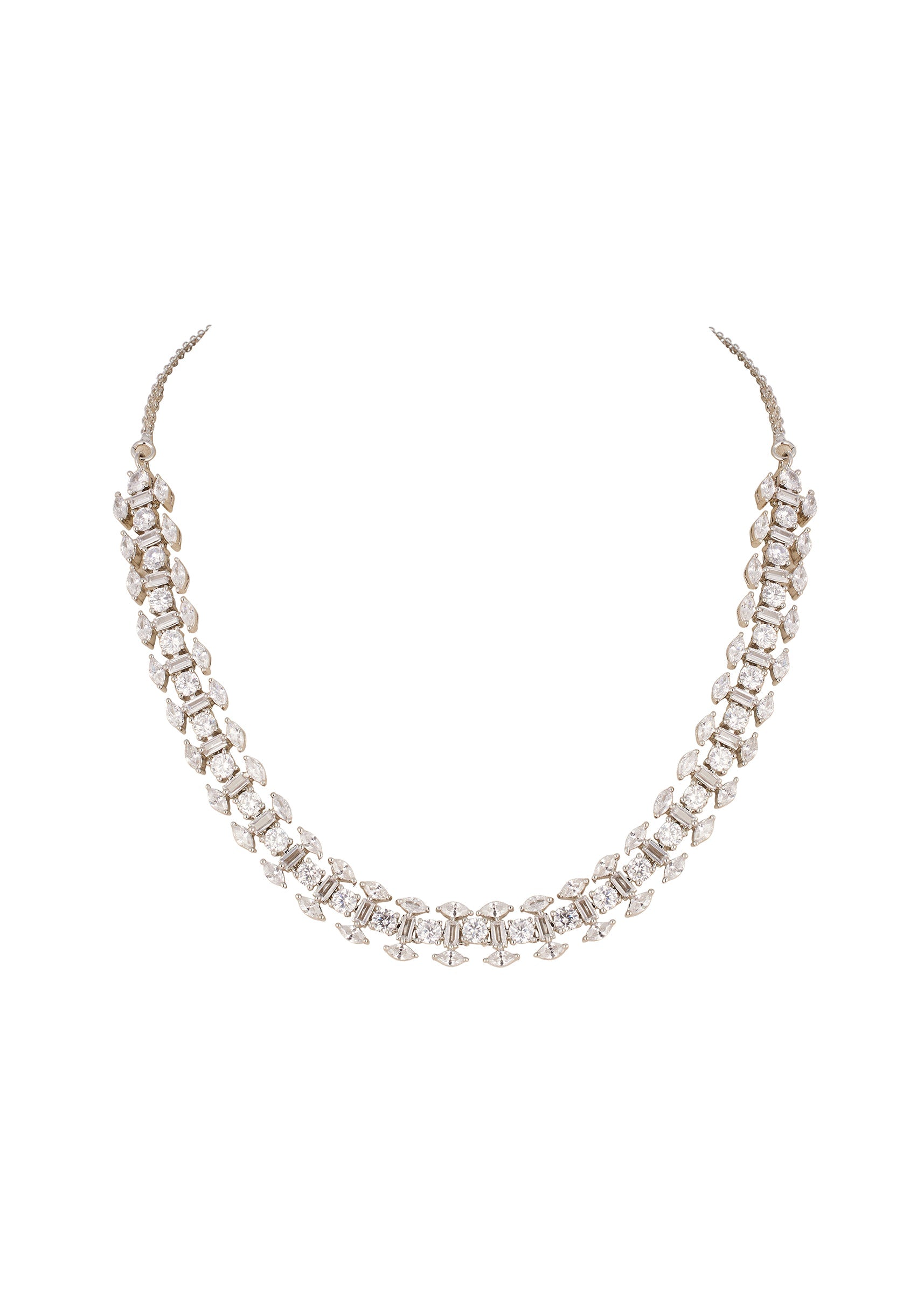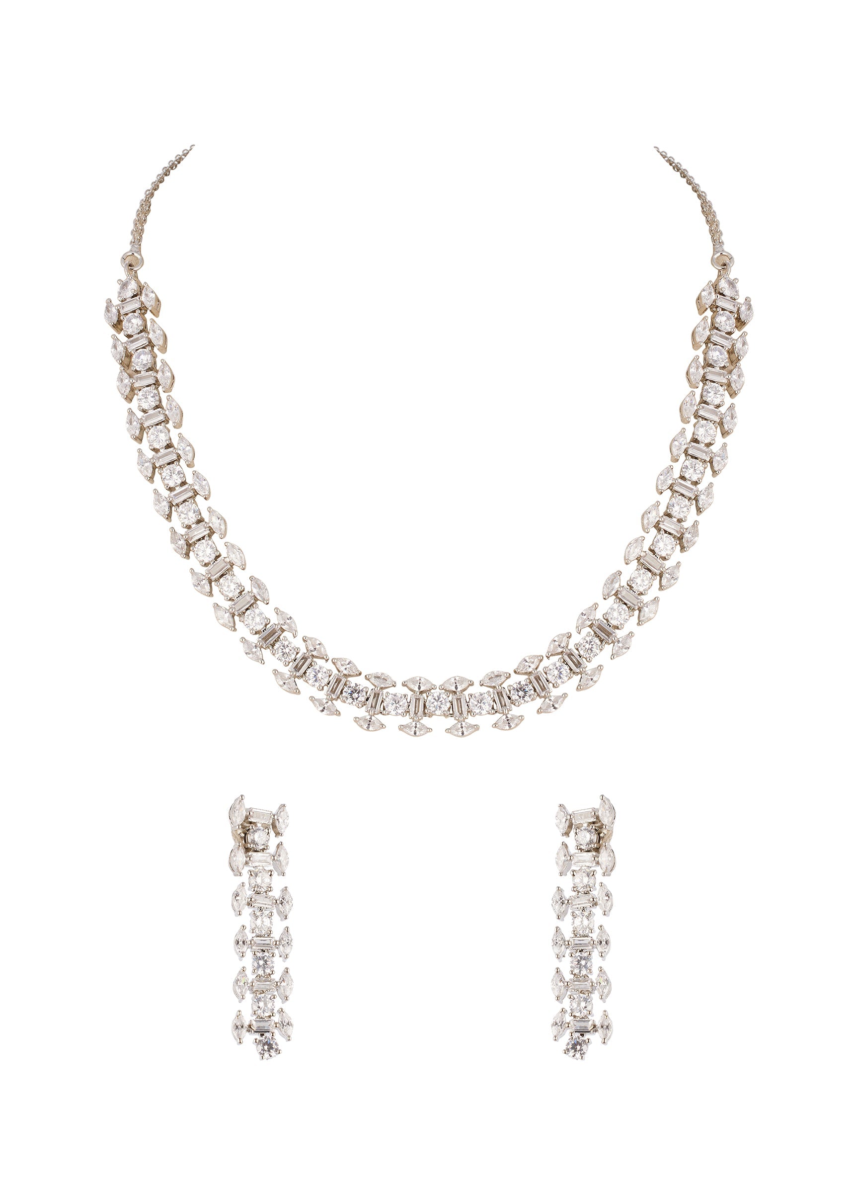 Silver Finish Necklace Set In Mix Metal With Modern Geometric Style And White Cubic Zirconia Accents