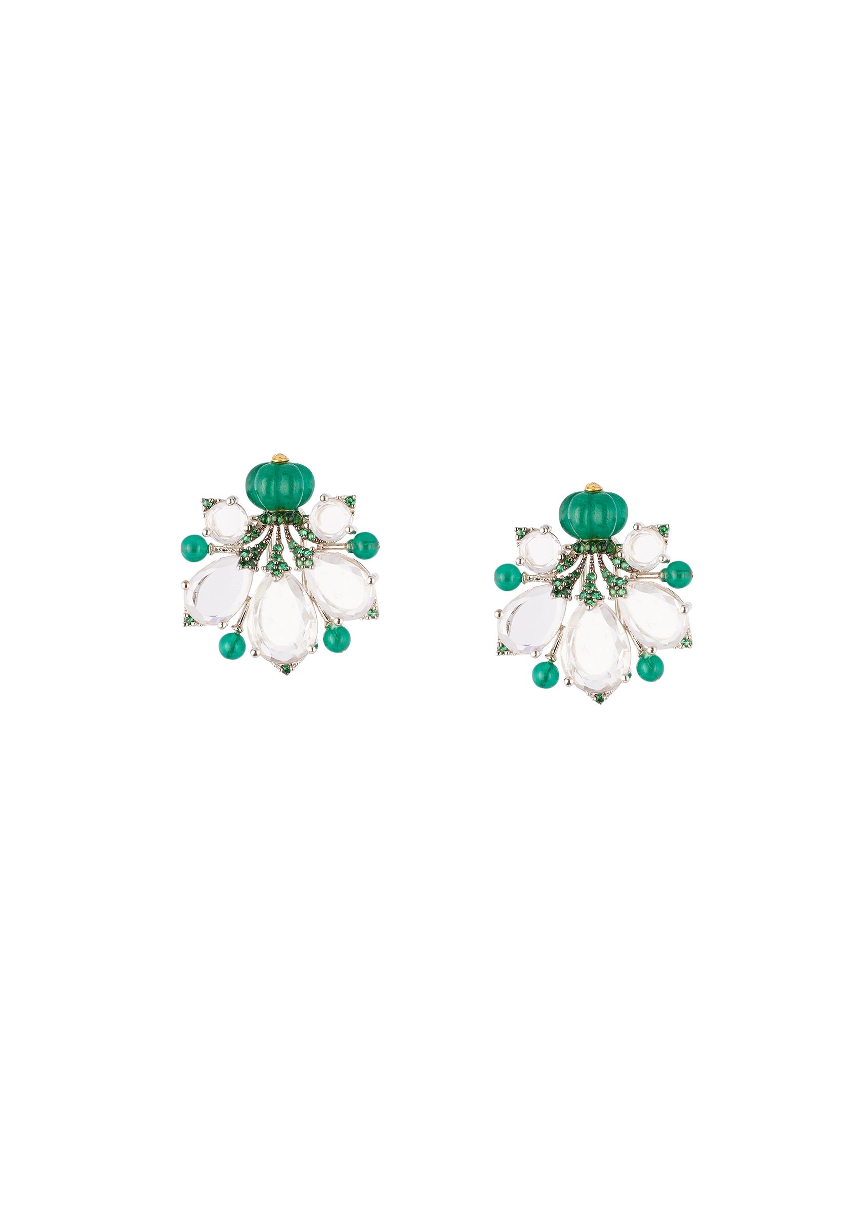 Silver Finish Whimsical Floral Stud Earrings With Green Carved Stone and Clear Pear Cut Simulated Stones