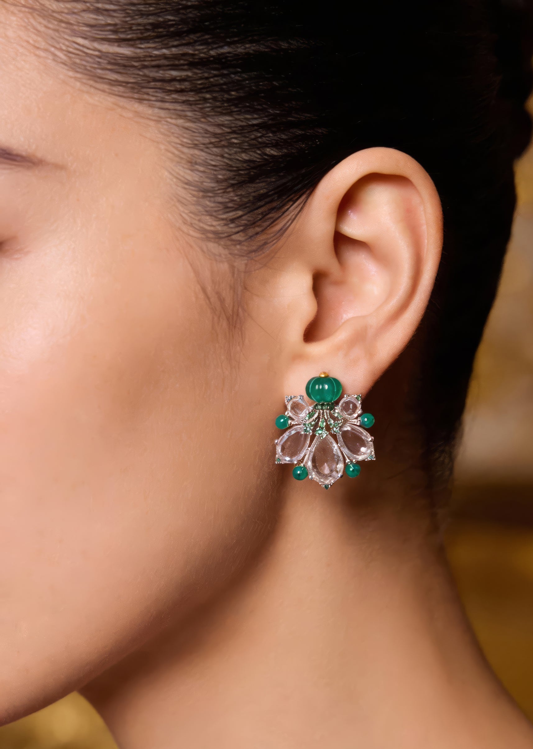 Pair these earrings with pastel sarees, solid kurtas or elegant dresses in neutral or soft green tones to highlight the green carved stone and clear accents.