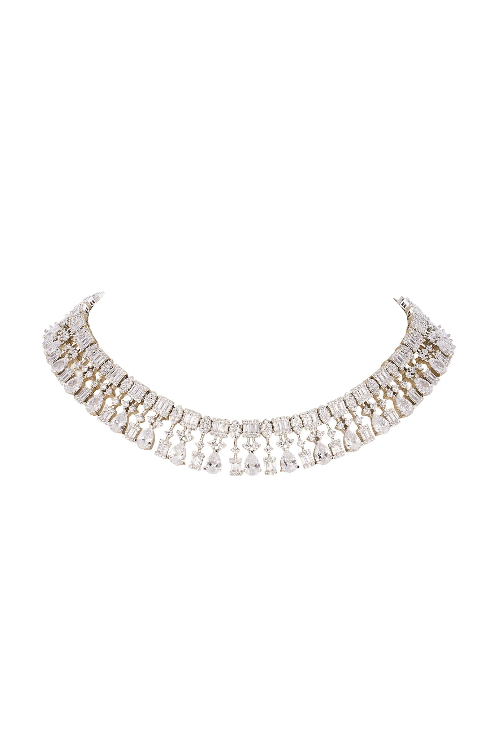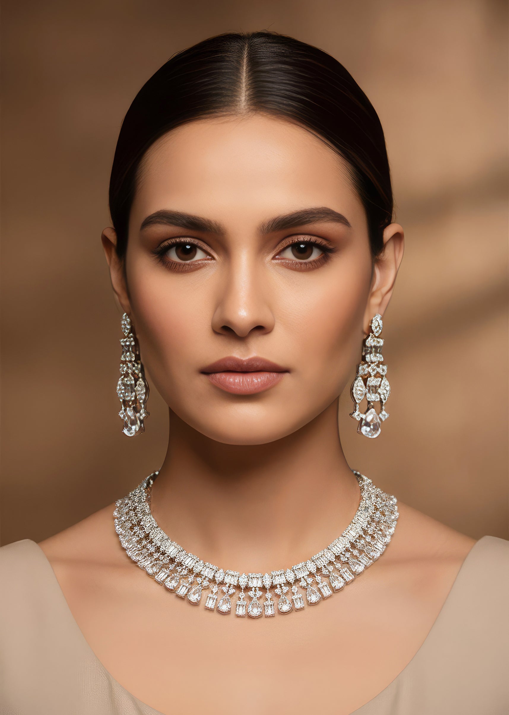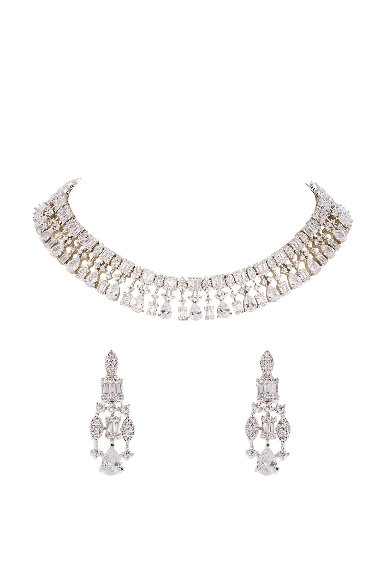 A refined silver and white necklace set adorned with shimmering zircons crafted in a modern contemporary technique. This handcrafted piece brings a polished sparkle that suits reception, cocktail nights, and elegant wedding guest looks. Its clean finish and radiant stones make it a versatile accessory for elevated festive styling. Awarded as the Most Trusted Brand, we're delivering styles you love, just as promised.