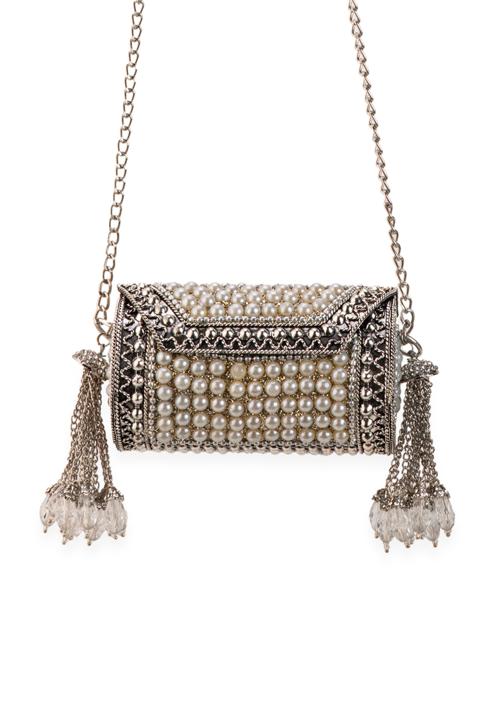 Pair with pearl or silver toned jewelry to enhance the bag’s luminous detailing.