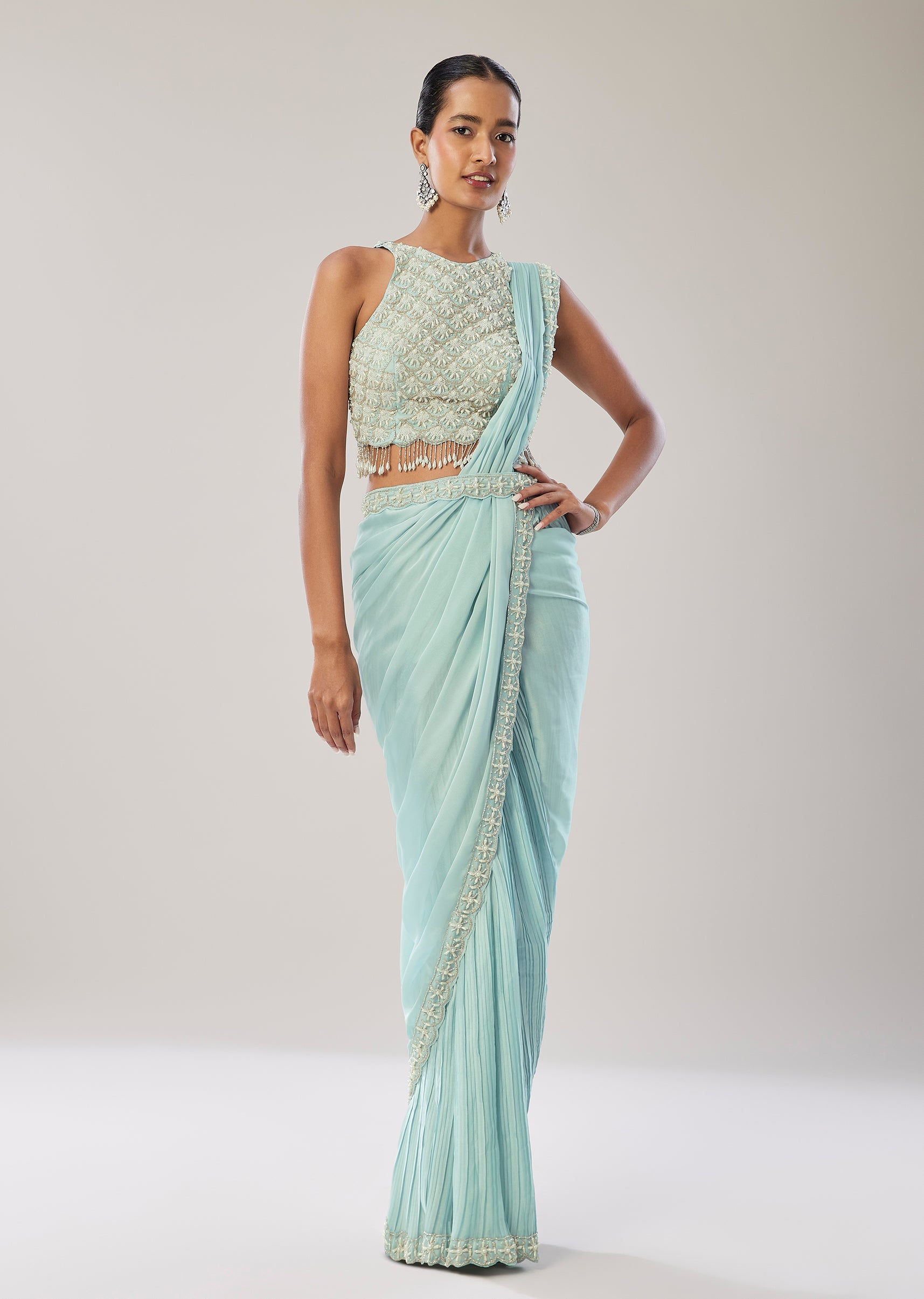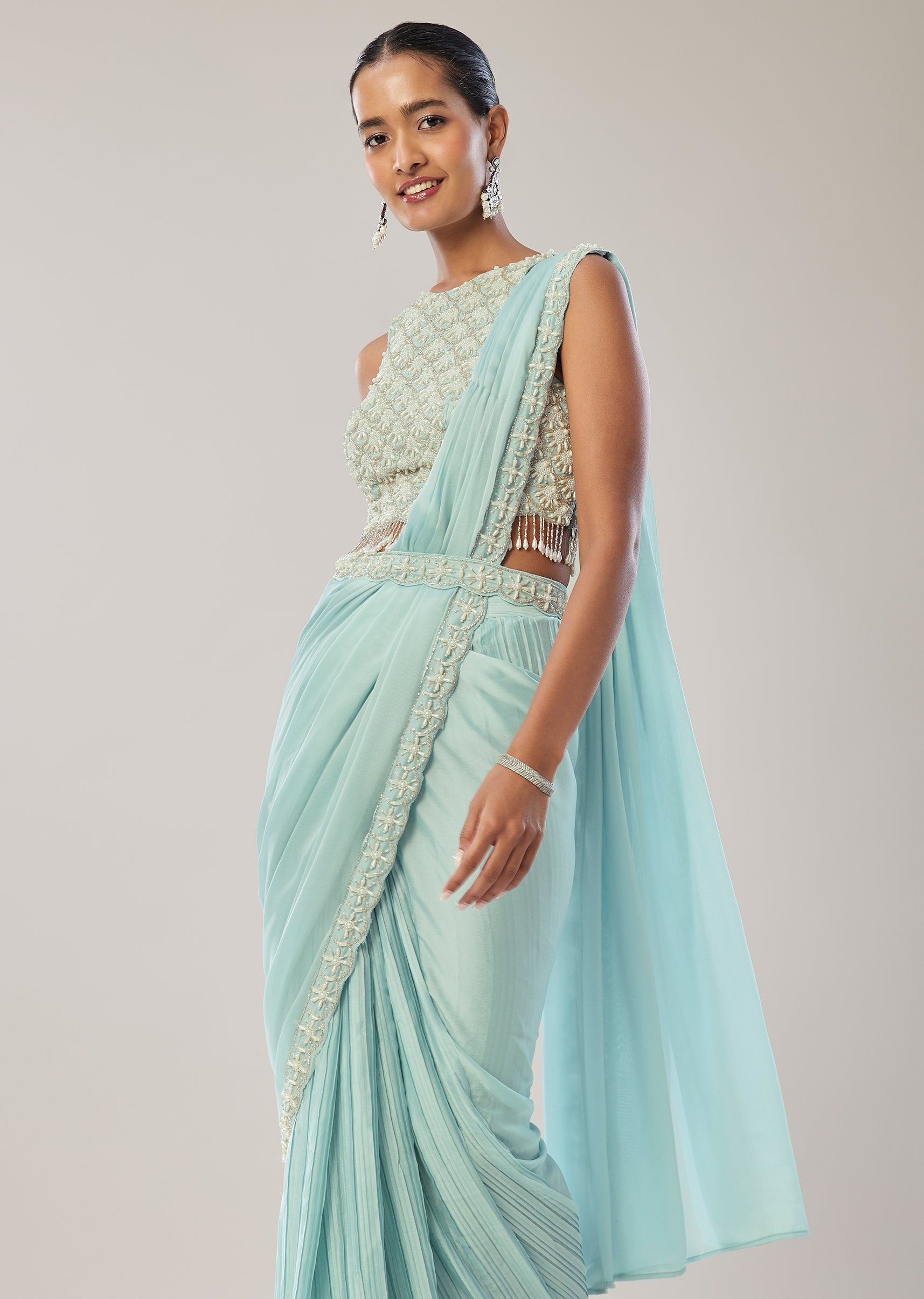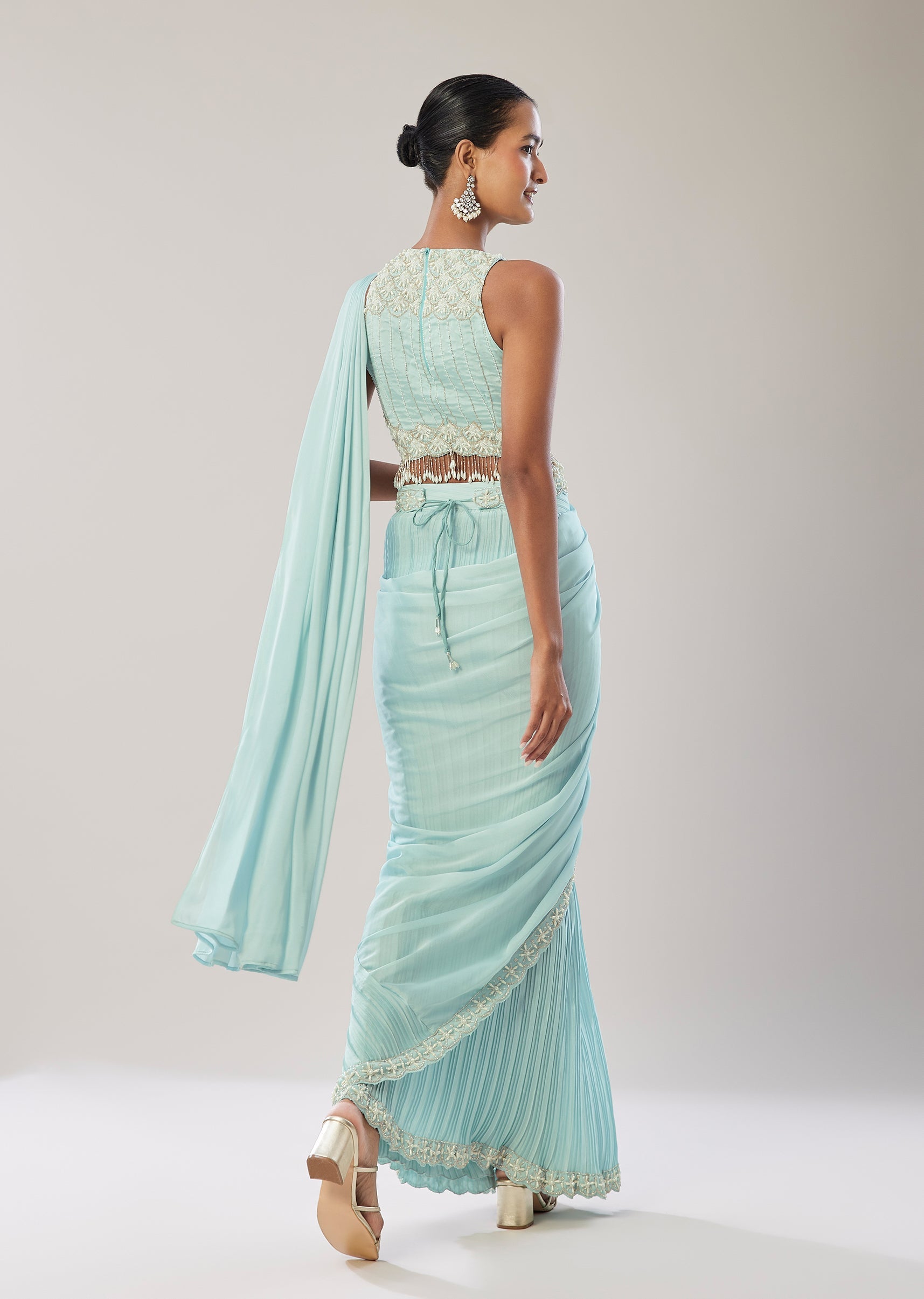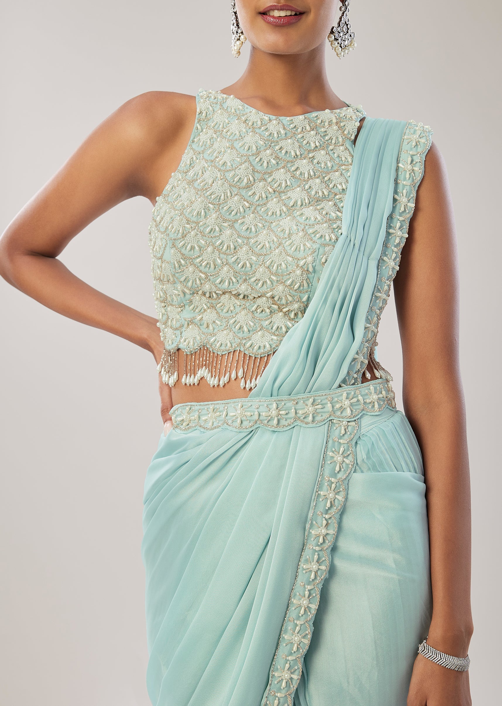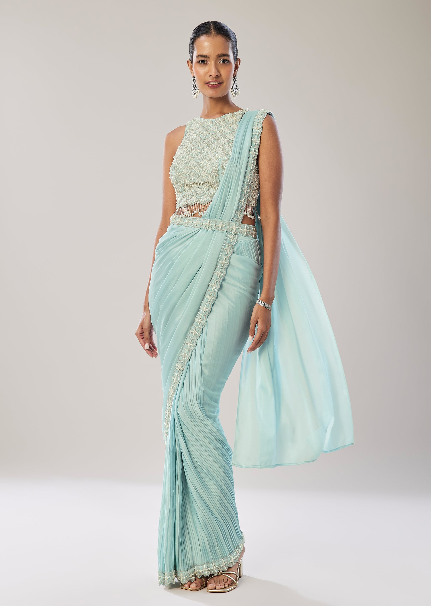 Fresh, feminine, and festive, this sky blue ready pleated saree is perfect for modern celebrations. The high-neck stitched blouse is detailed with moti and cut dana work for refined sparkle,... More Product Details