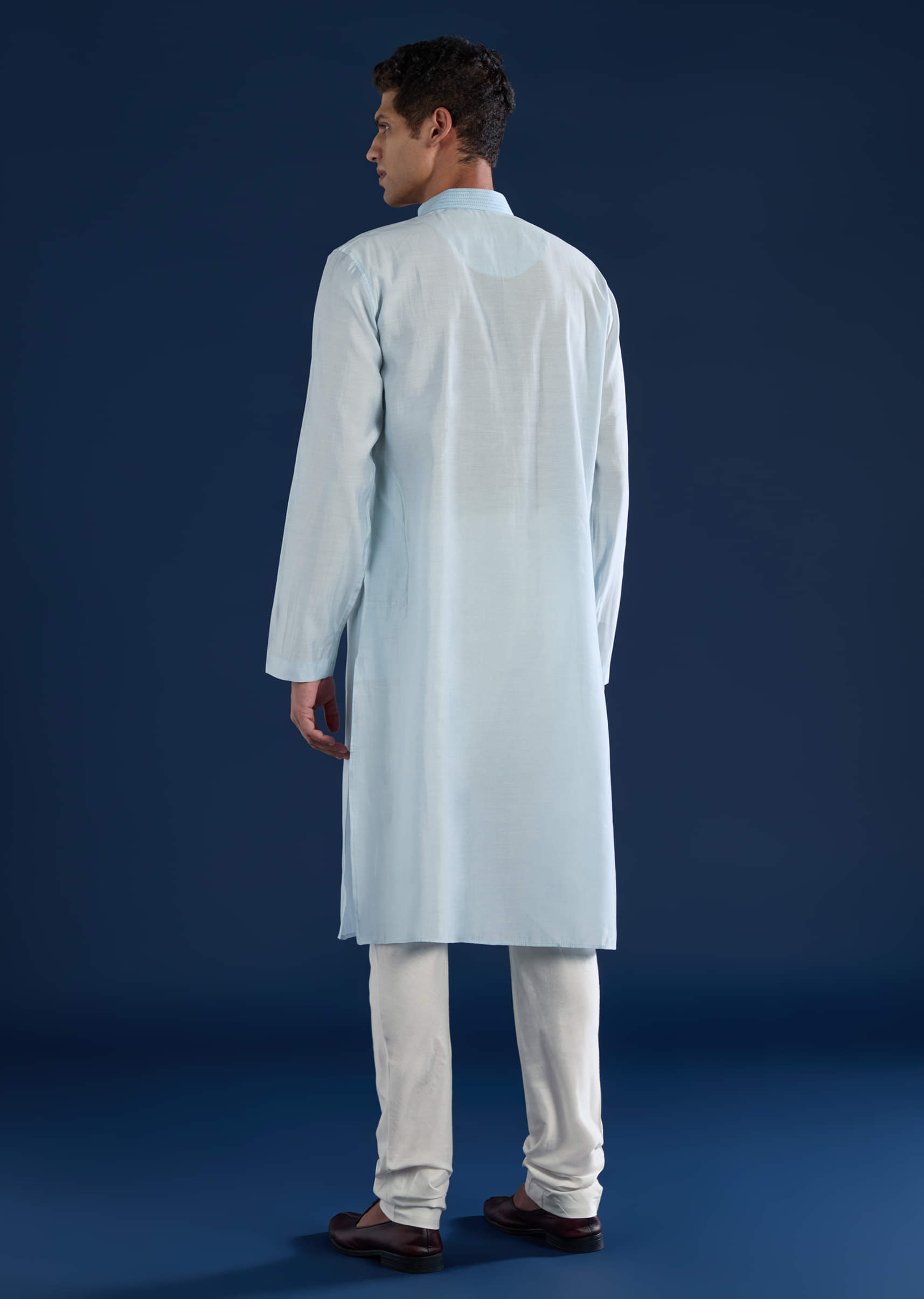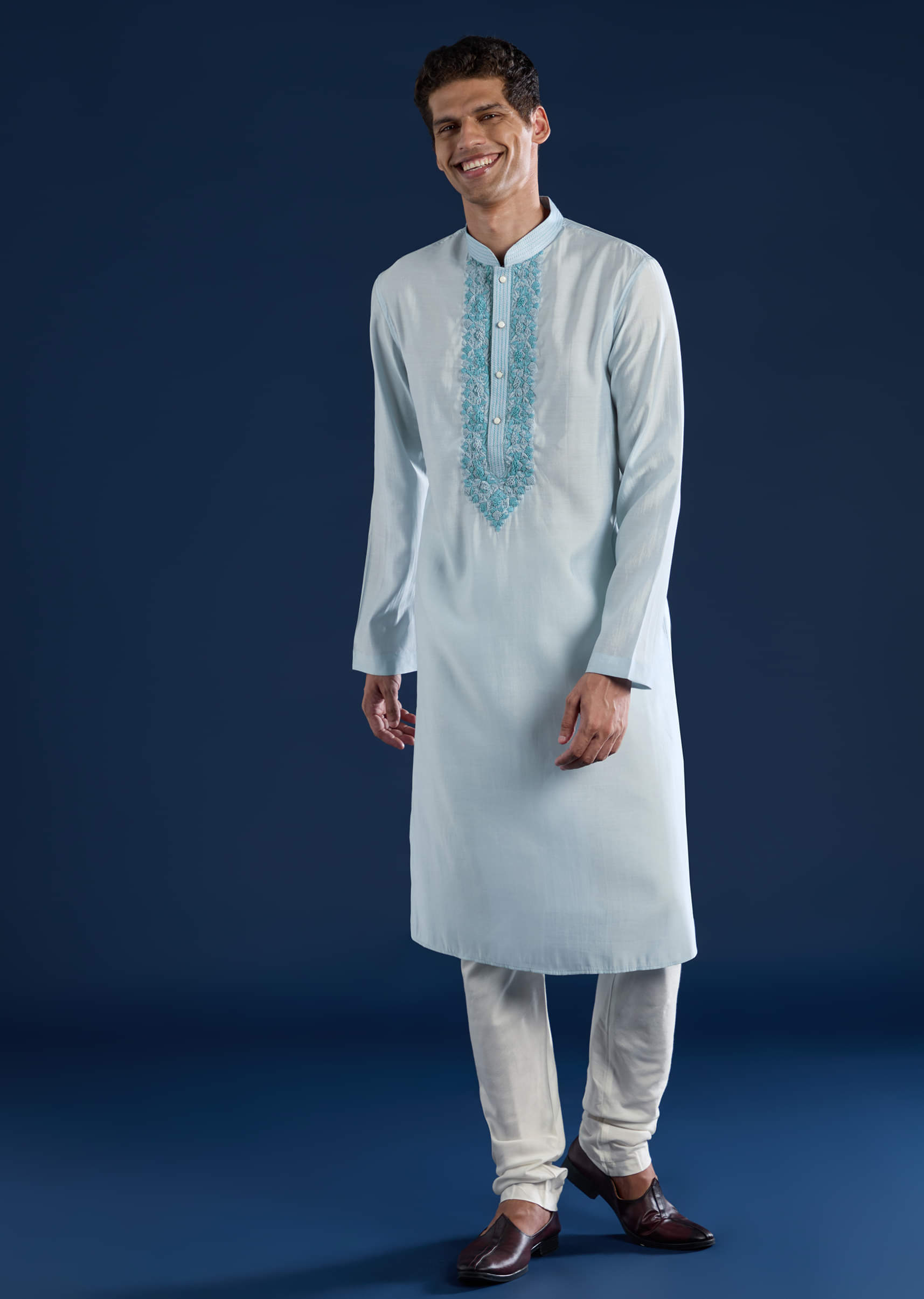 Sky Blue Viscose Resham Work Mens Kurta and Pant Set