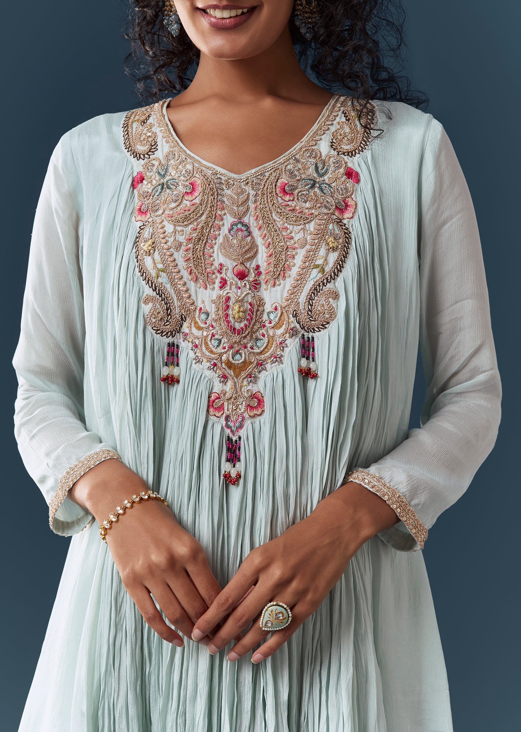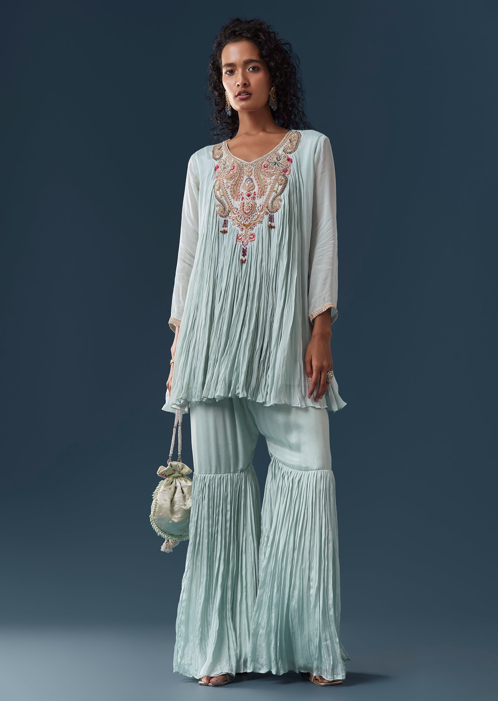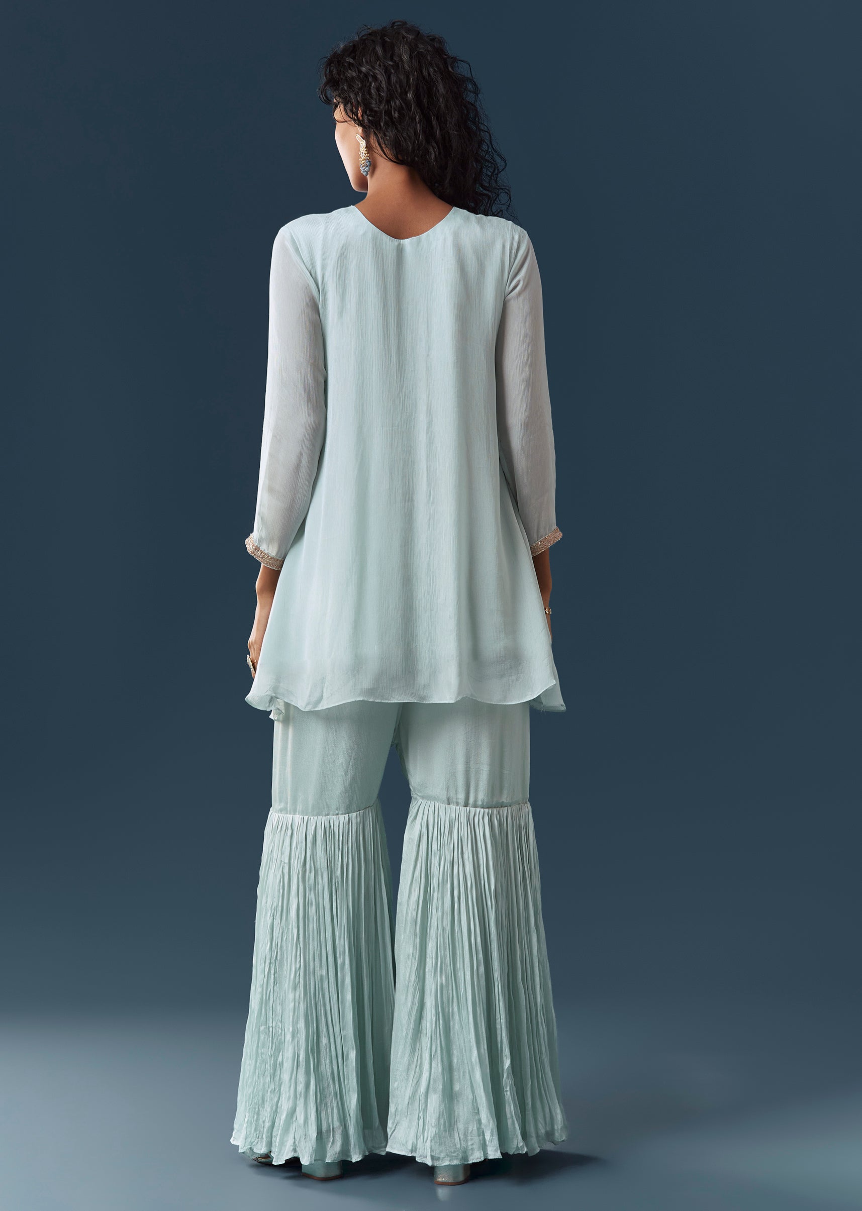 Crafted in lightweight chinon, this pastel sharara set features a cape-style A-line top with zardosi embroidery for a subtle festive finish. Designed with a V-neckline and 3/4th sleeves, it is... More Product Details
