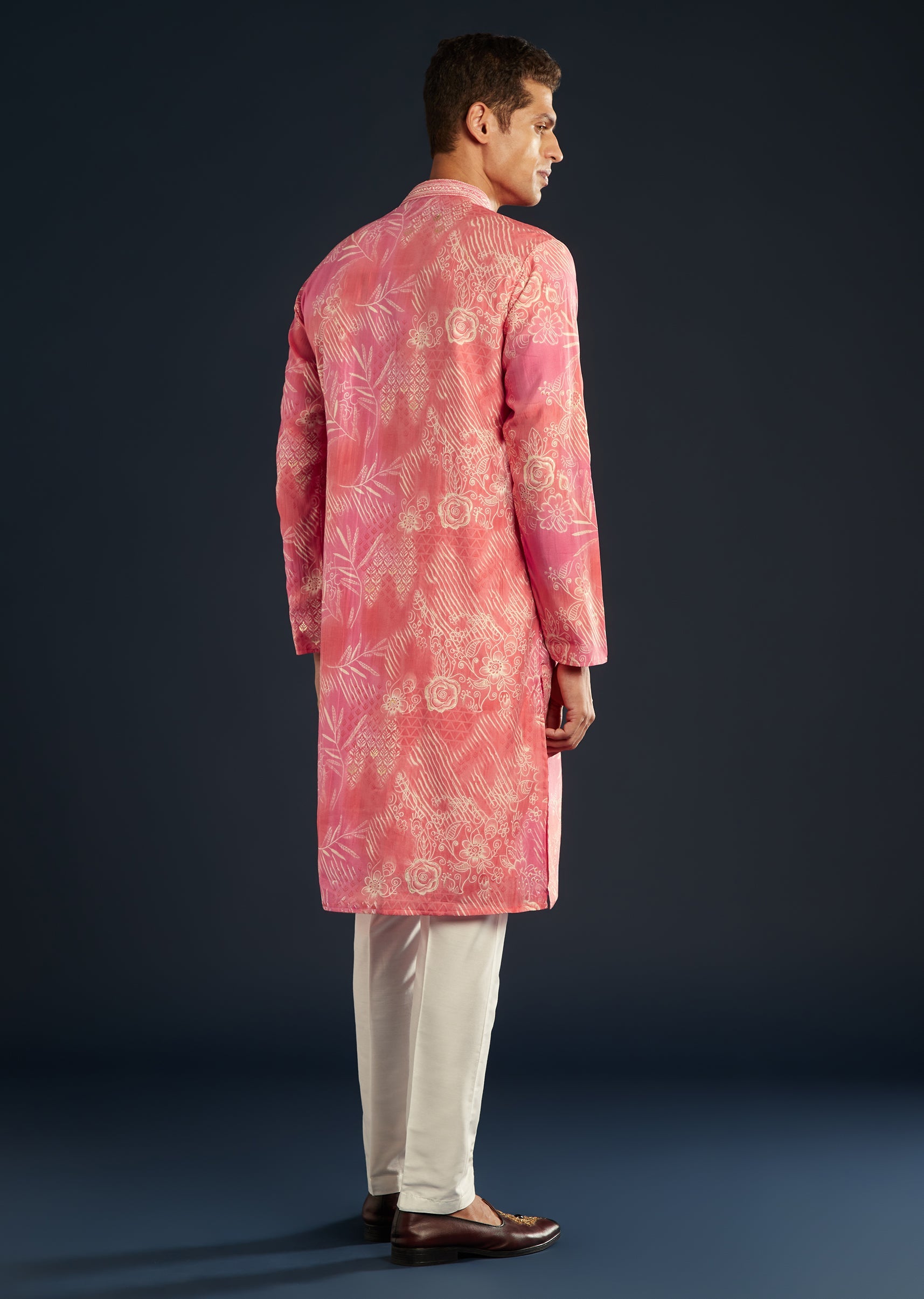 Light and festive, this pink floral print art silk kurta pant set adds charm with its easy silhouette. Ideal for coordinated daytime festivities.