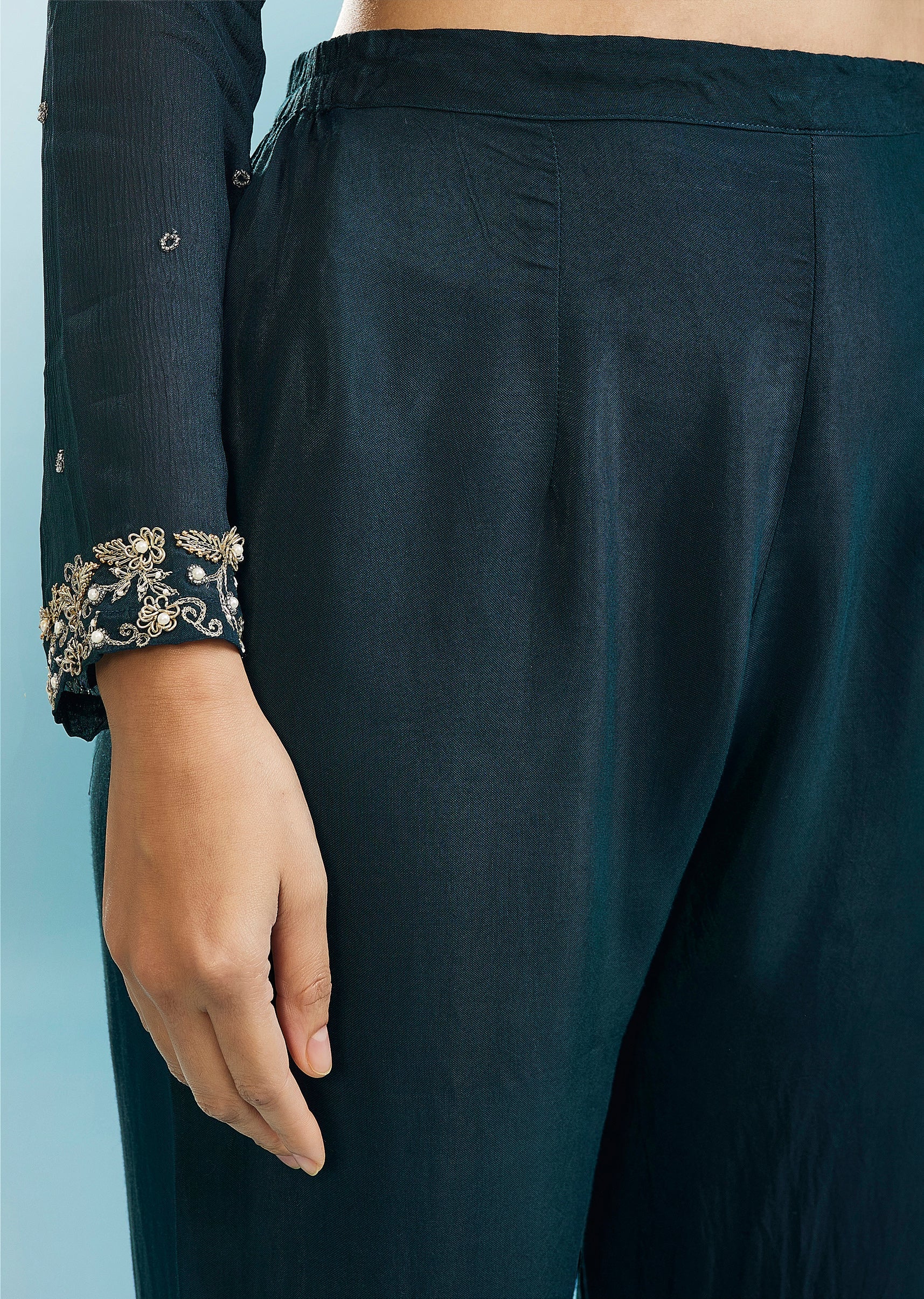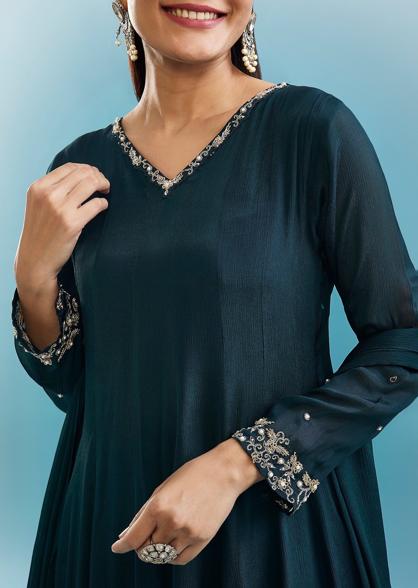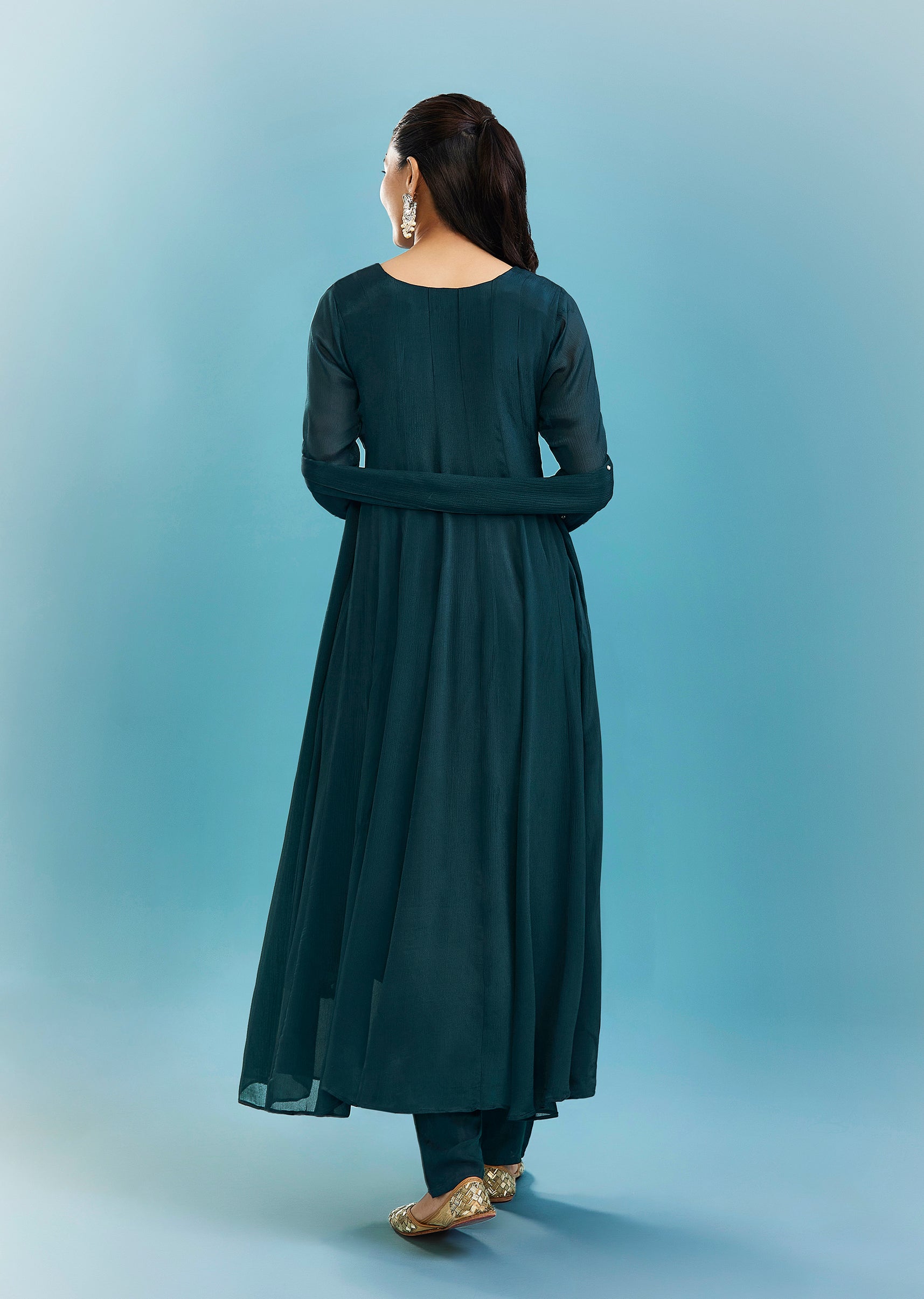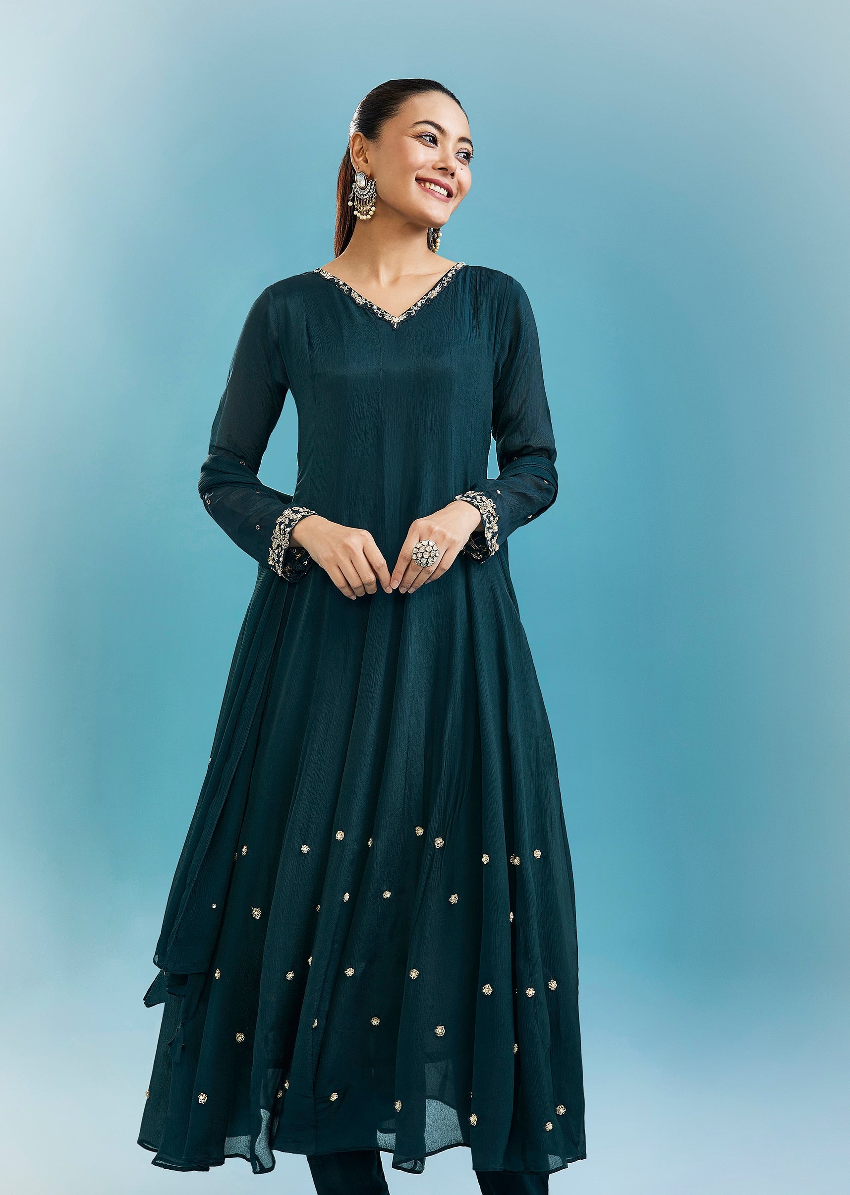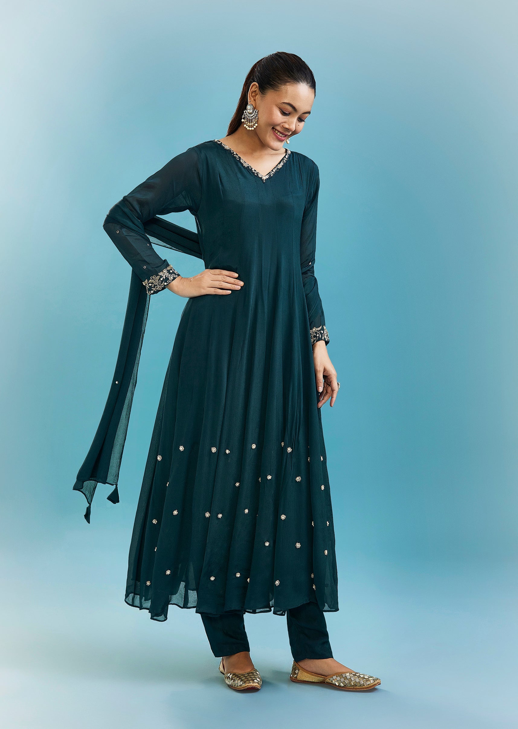Elegant and timeless, this teal anarkali set features detailed zardosi work that enhances its rich tone. The flowing silhouette and full sleeves make it a standout evening ensemble. Awarded as... More Product Details