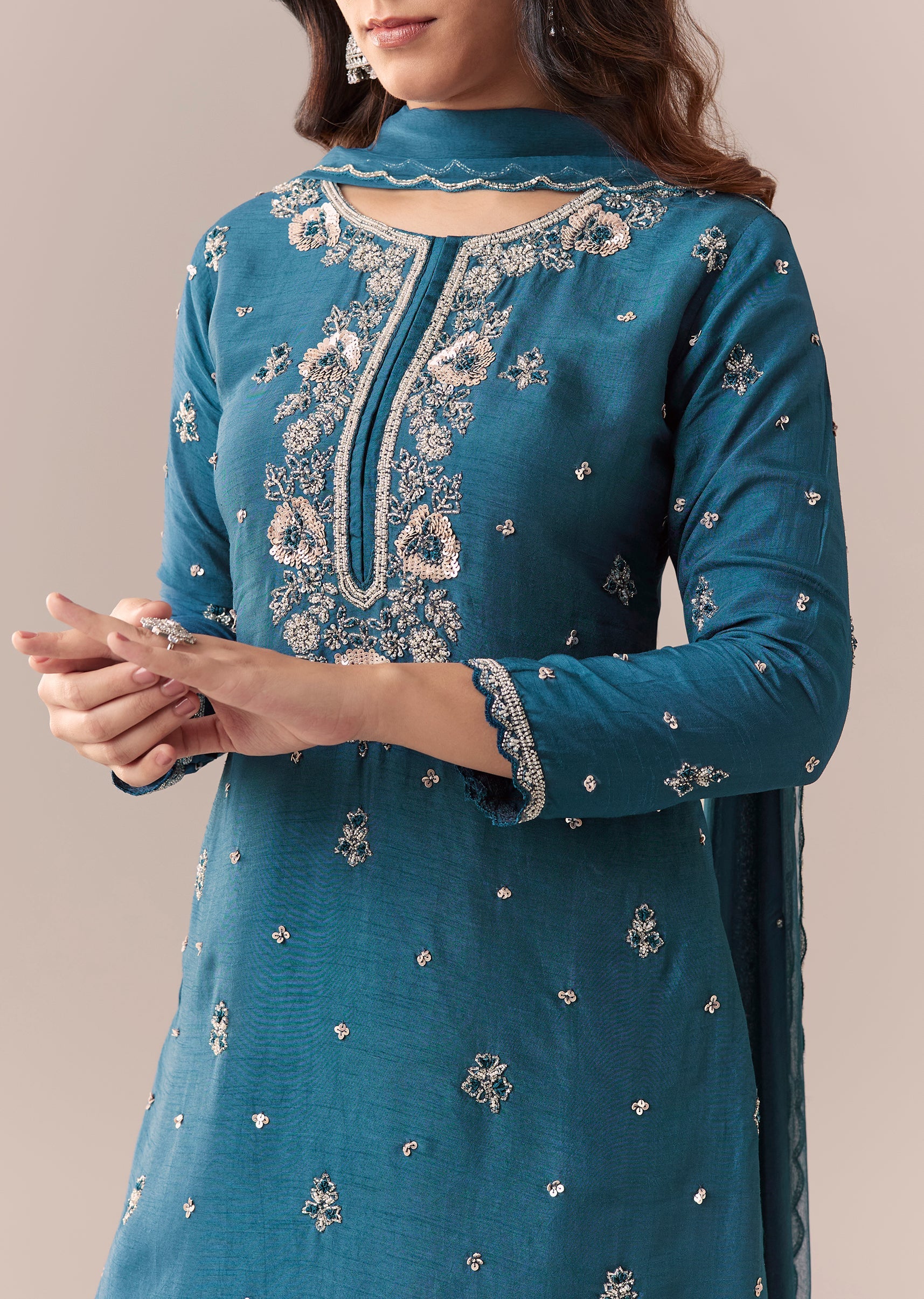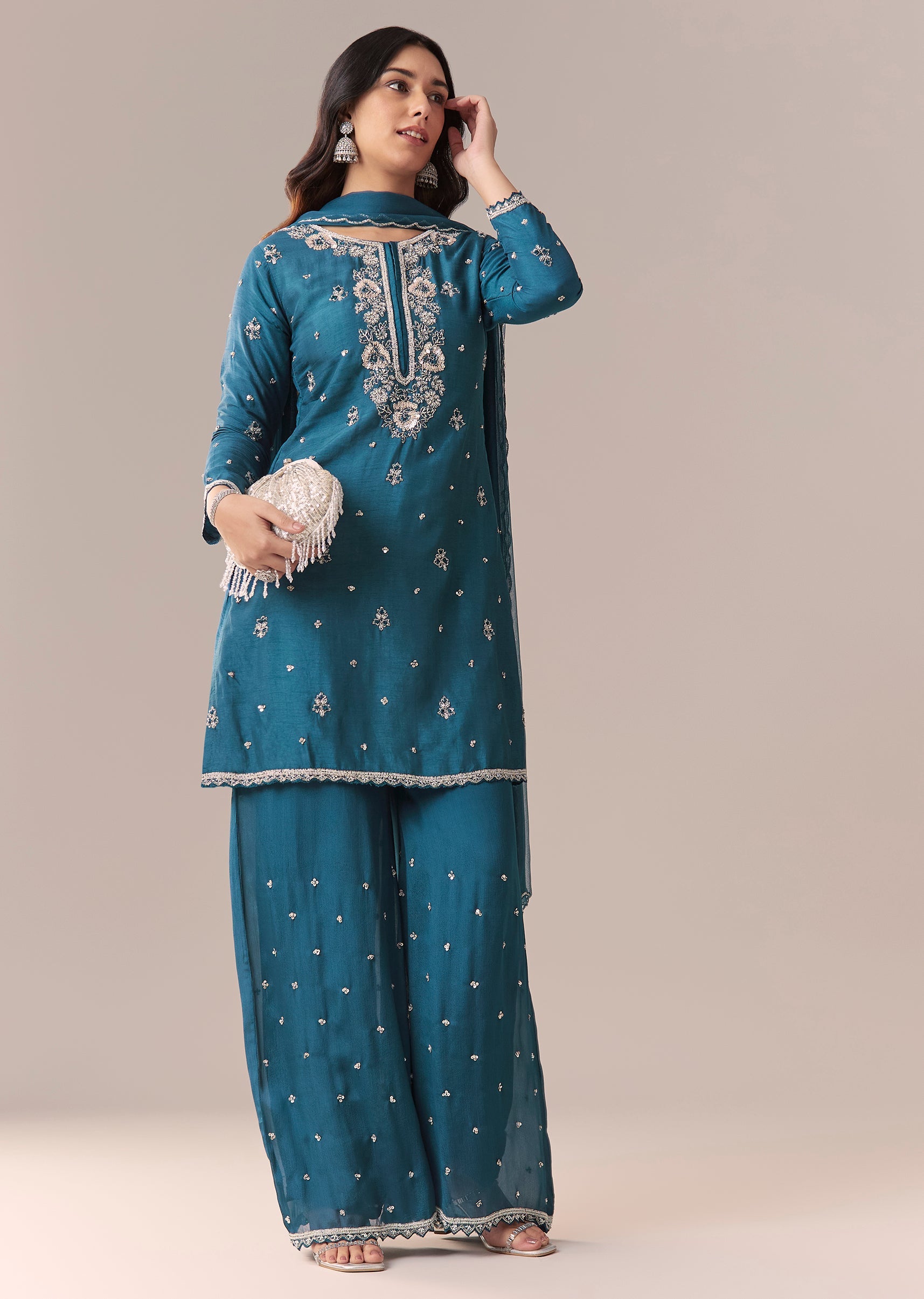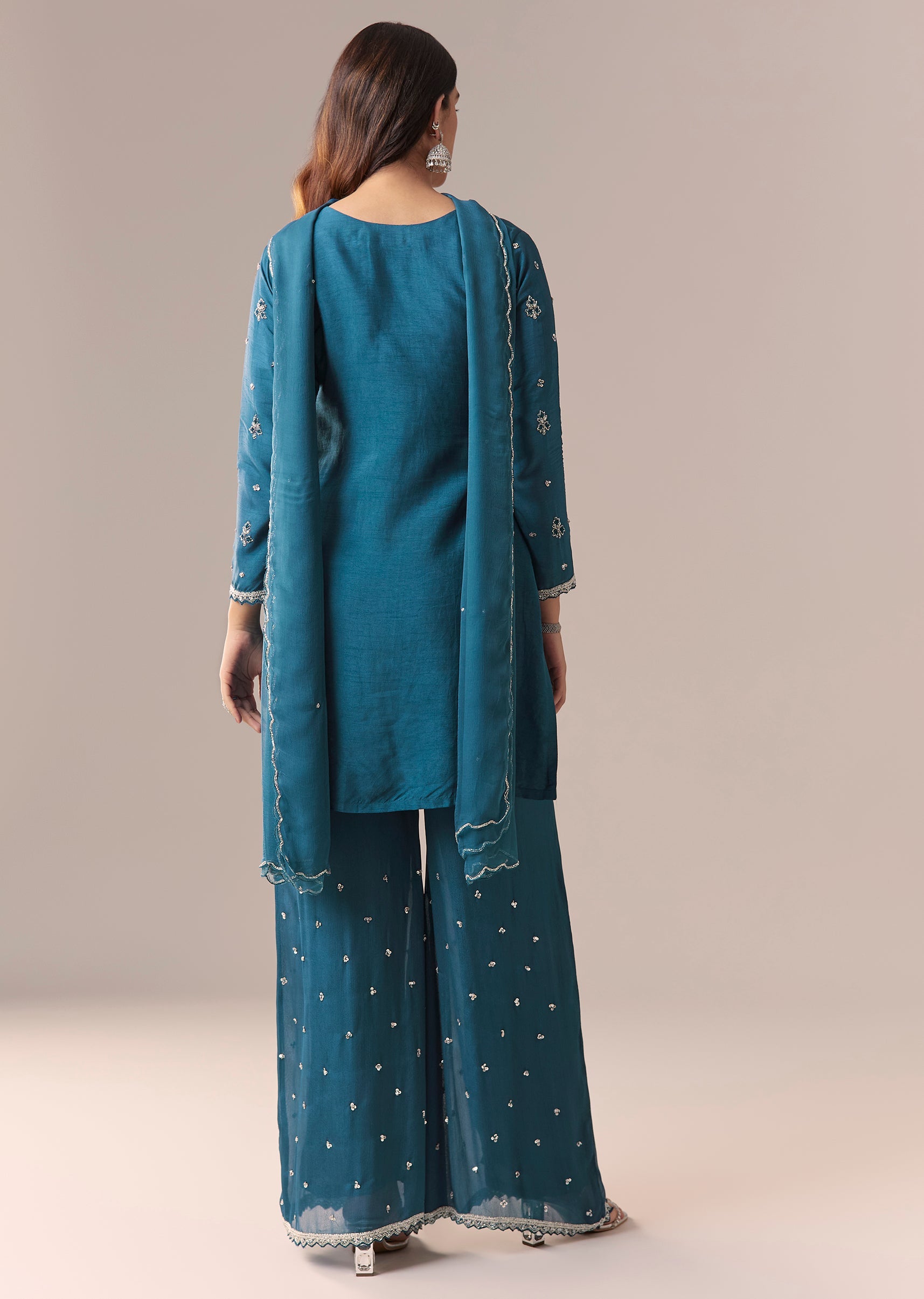 Teal Blue Embellished Palazzo Suit Set With Dupatta