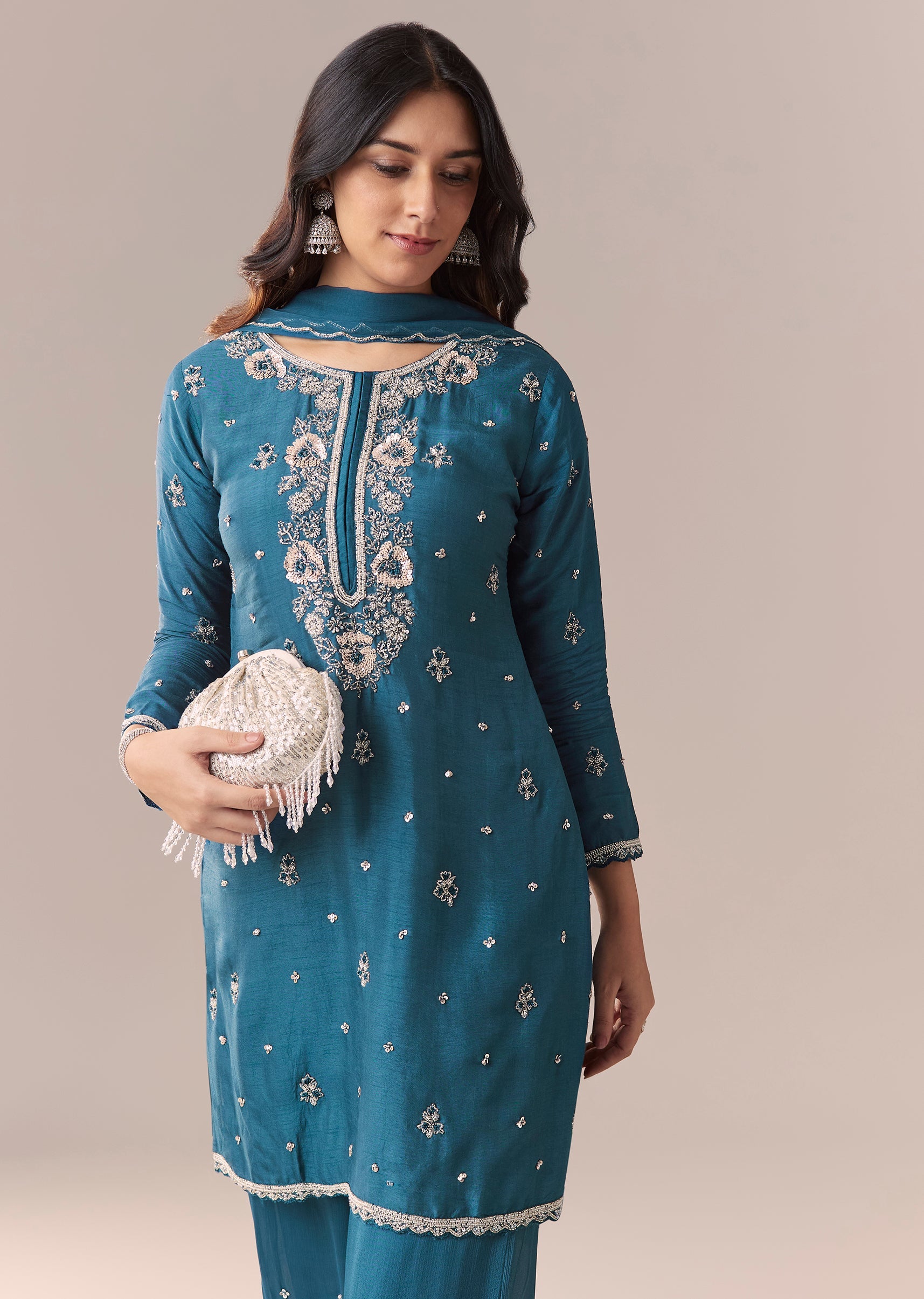 Crafted in chinon, this straight kurta features sequin and cut dana detailing with a round neckline and 3/4th sleeves. Paired with a mid-waist palazzo (partially elasticated) and matching dupatta, it’s... More Product Details