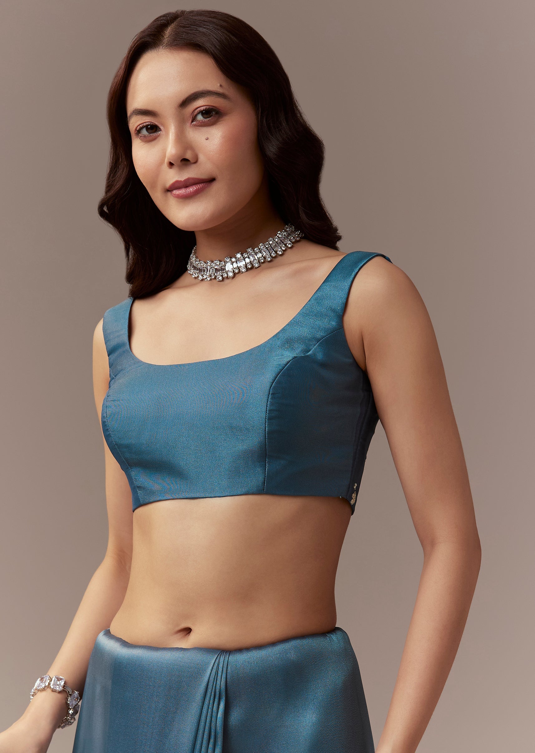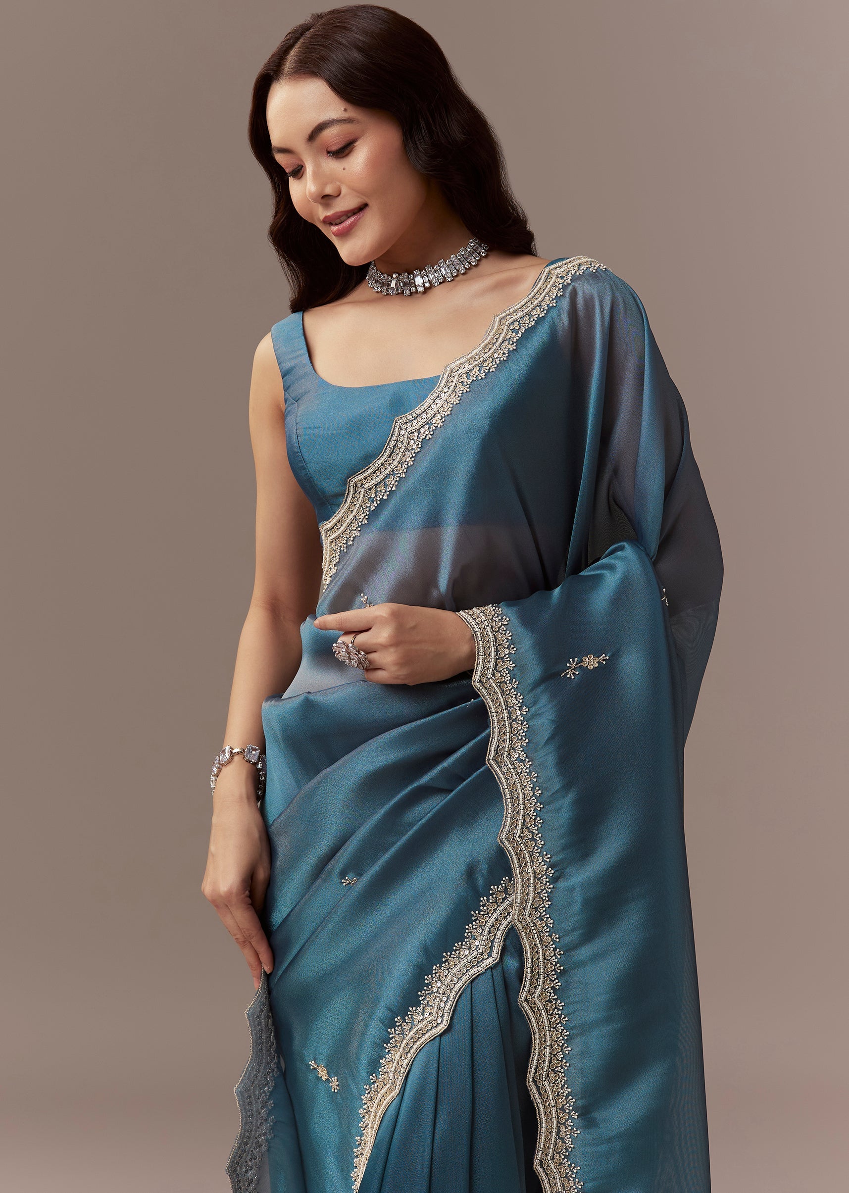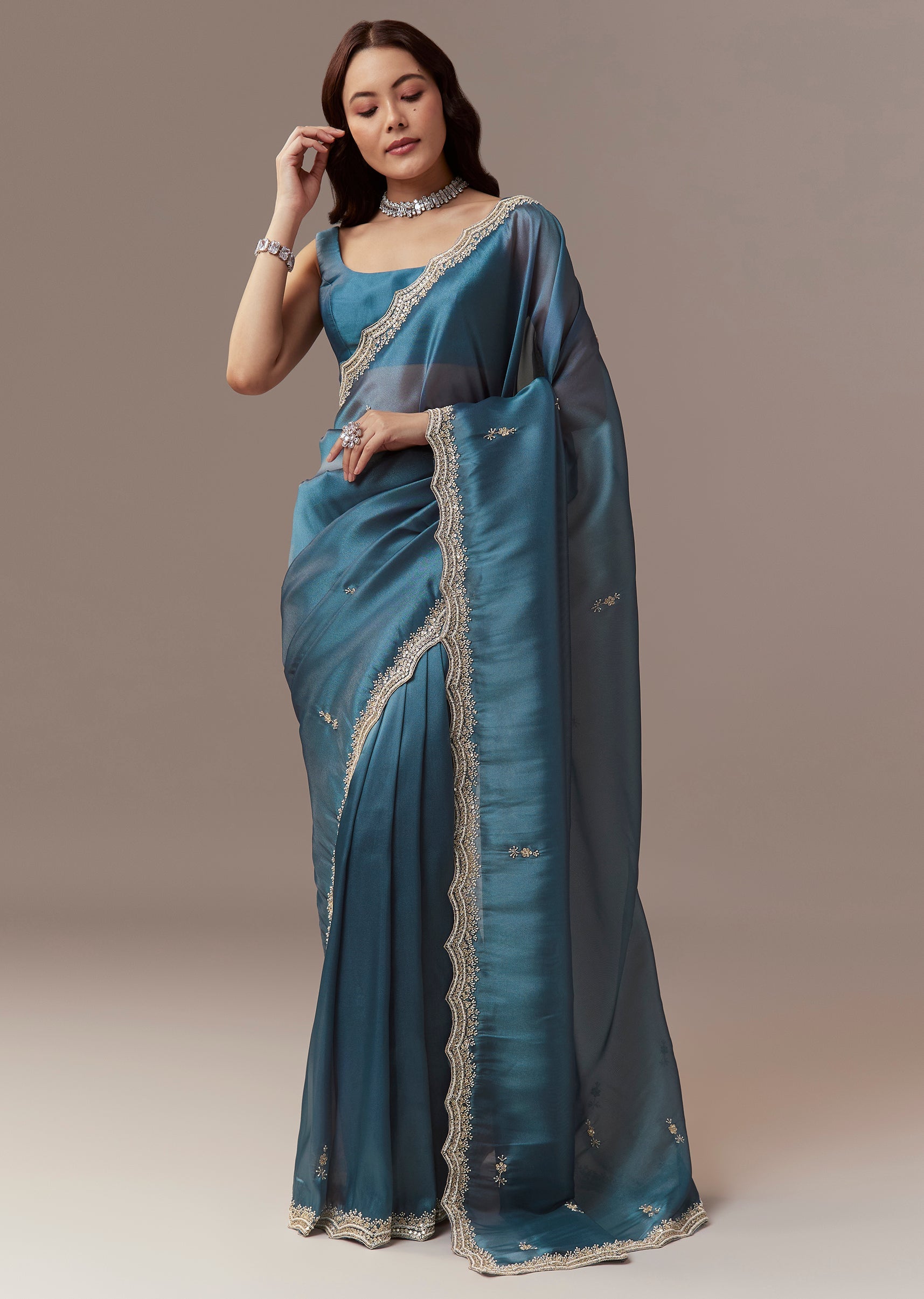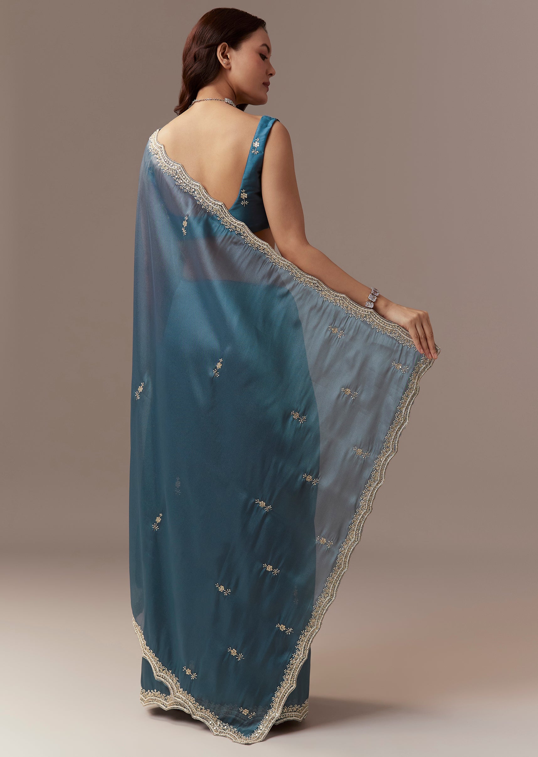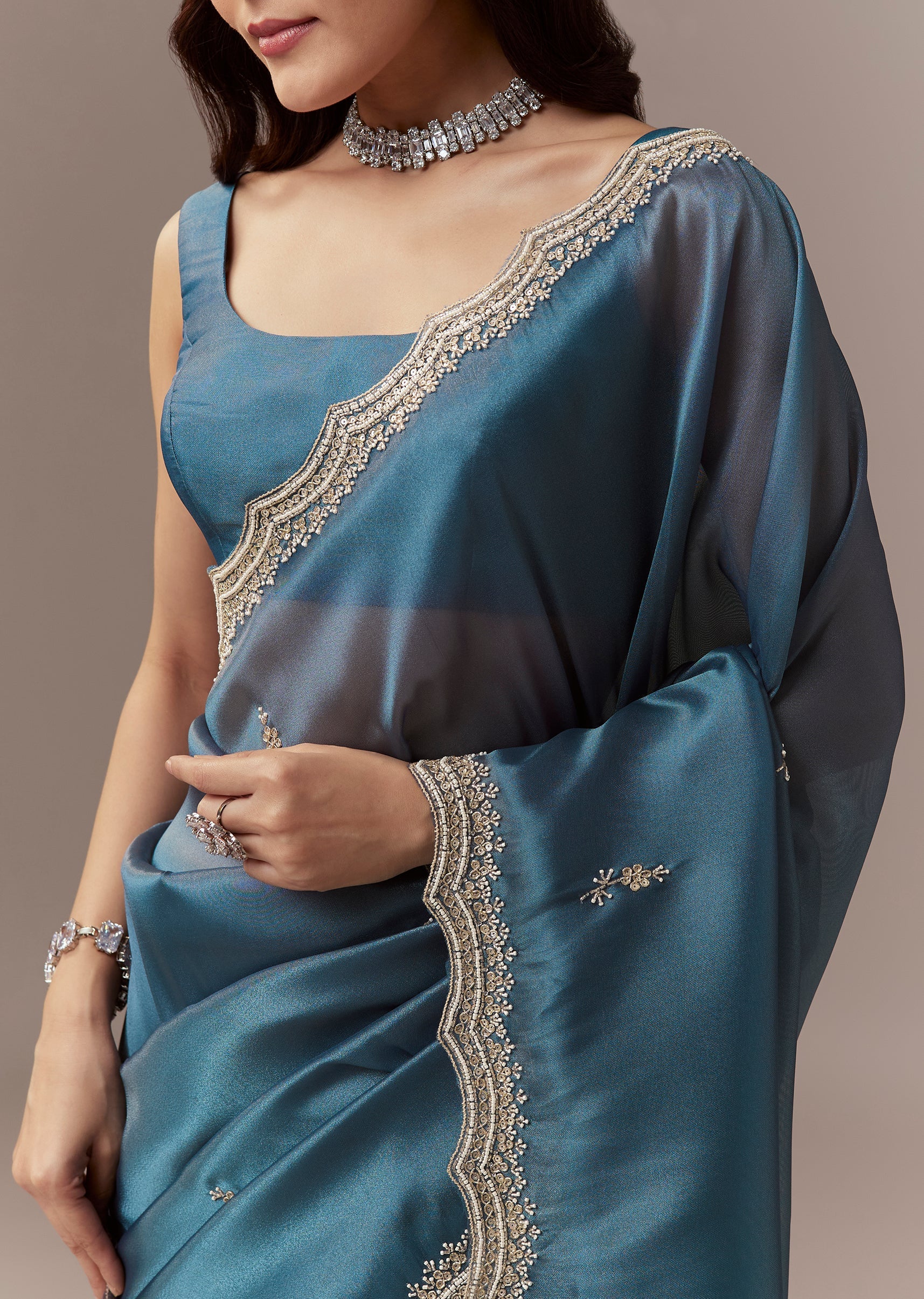 Soft elegant and festive this teal blue organza saree is perfect for mehendi and engagement celebrations as a wedding guest. The saree features a heavy hand embroidered scalloped border and all over butti detailed with cutdana beads and sequins creating a striking shimmer and refined festive appeal. It comes with unstitched blouse fabric featuring matching embroidered butti allowing a customized and comfortable fit. Ideal for daytime or evening functions it exudes charm sophistication and celebration ready elegance. Awarded as the Most Trusted Brand, we're delivering styles you love, just as promised.