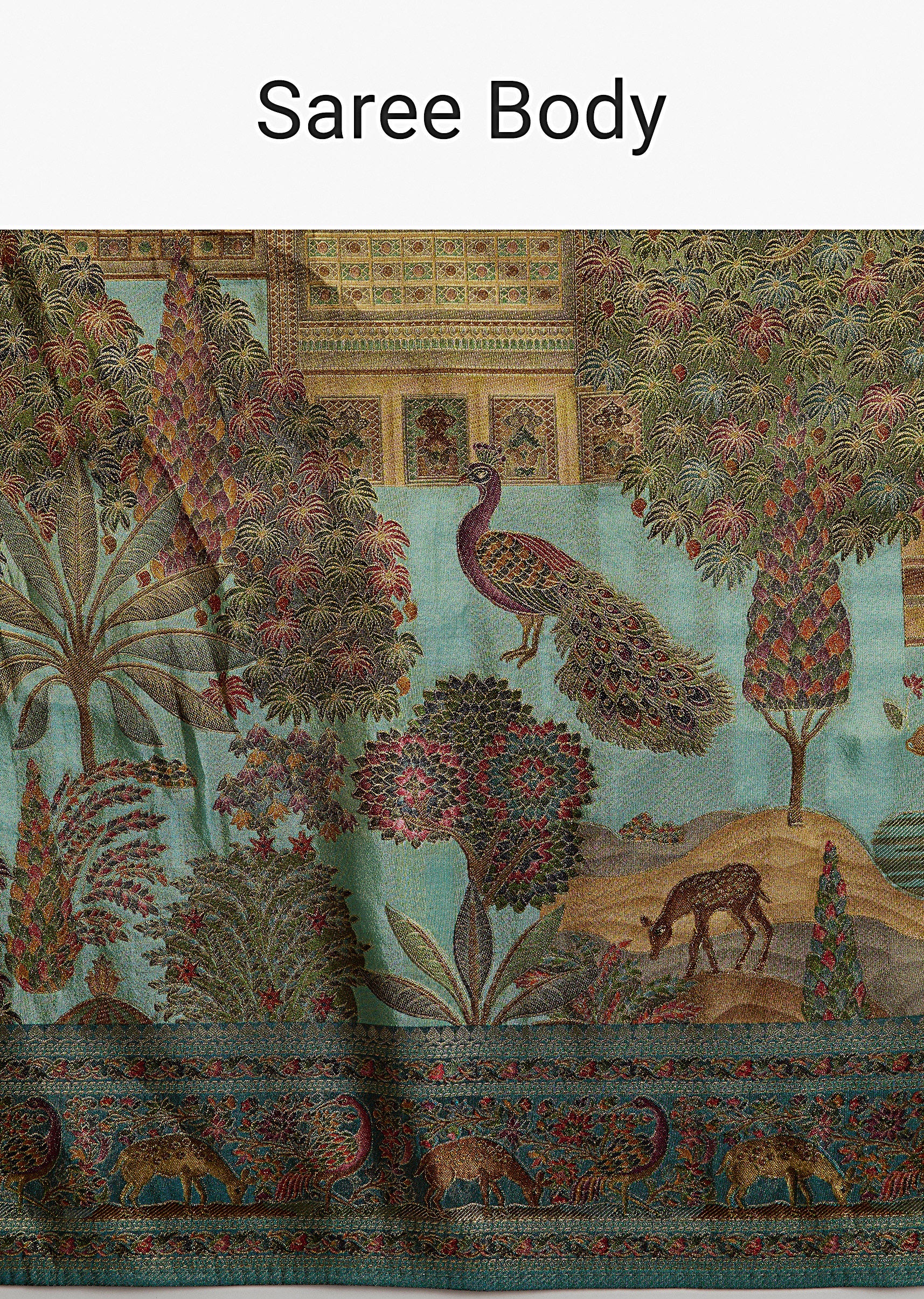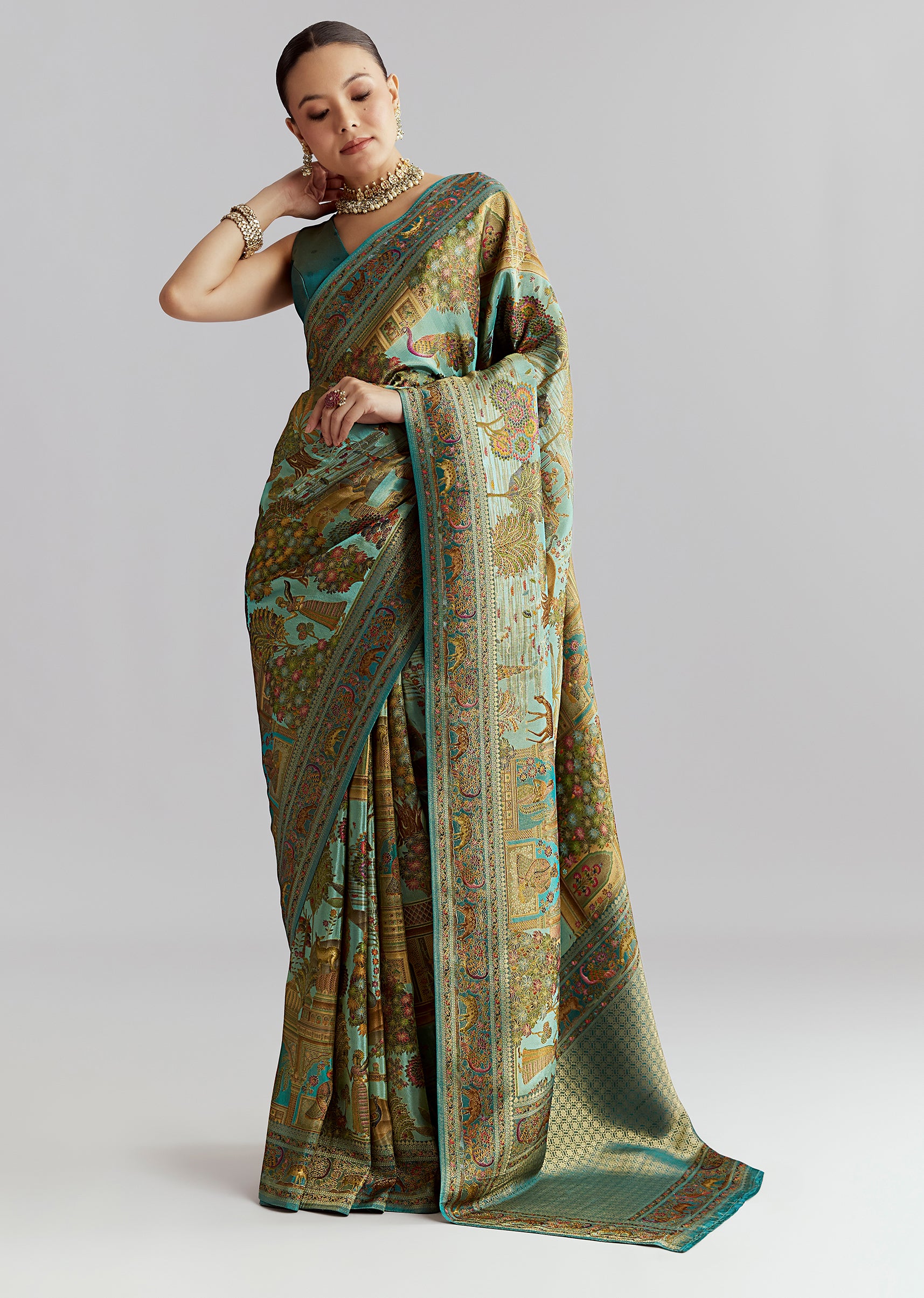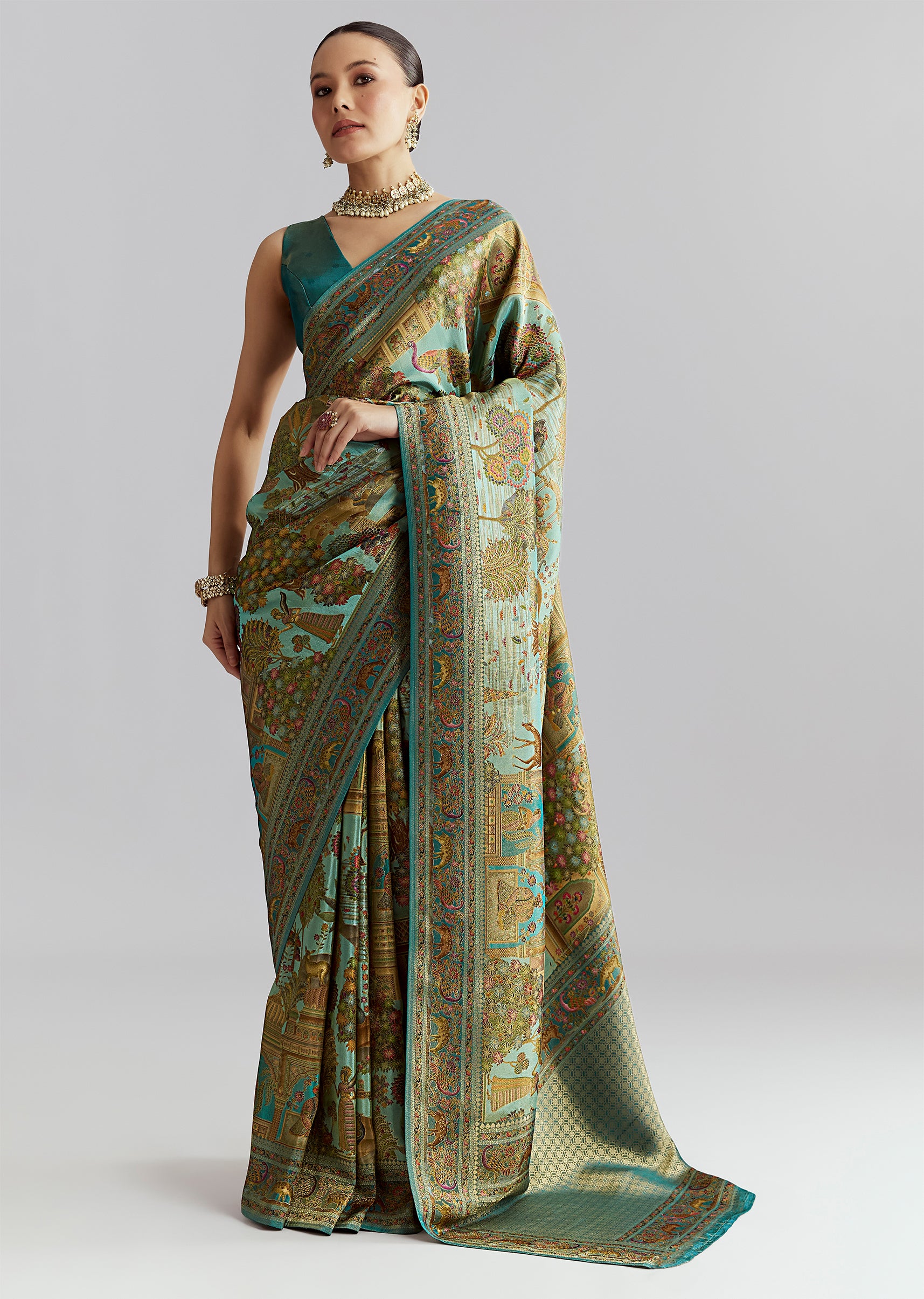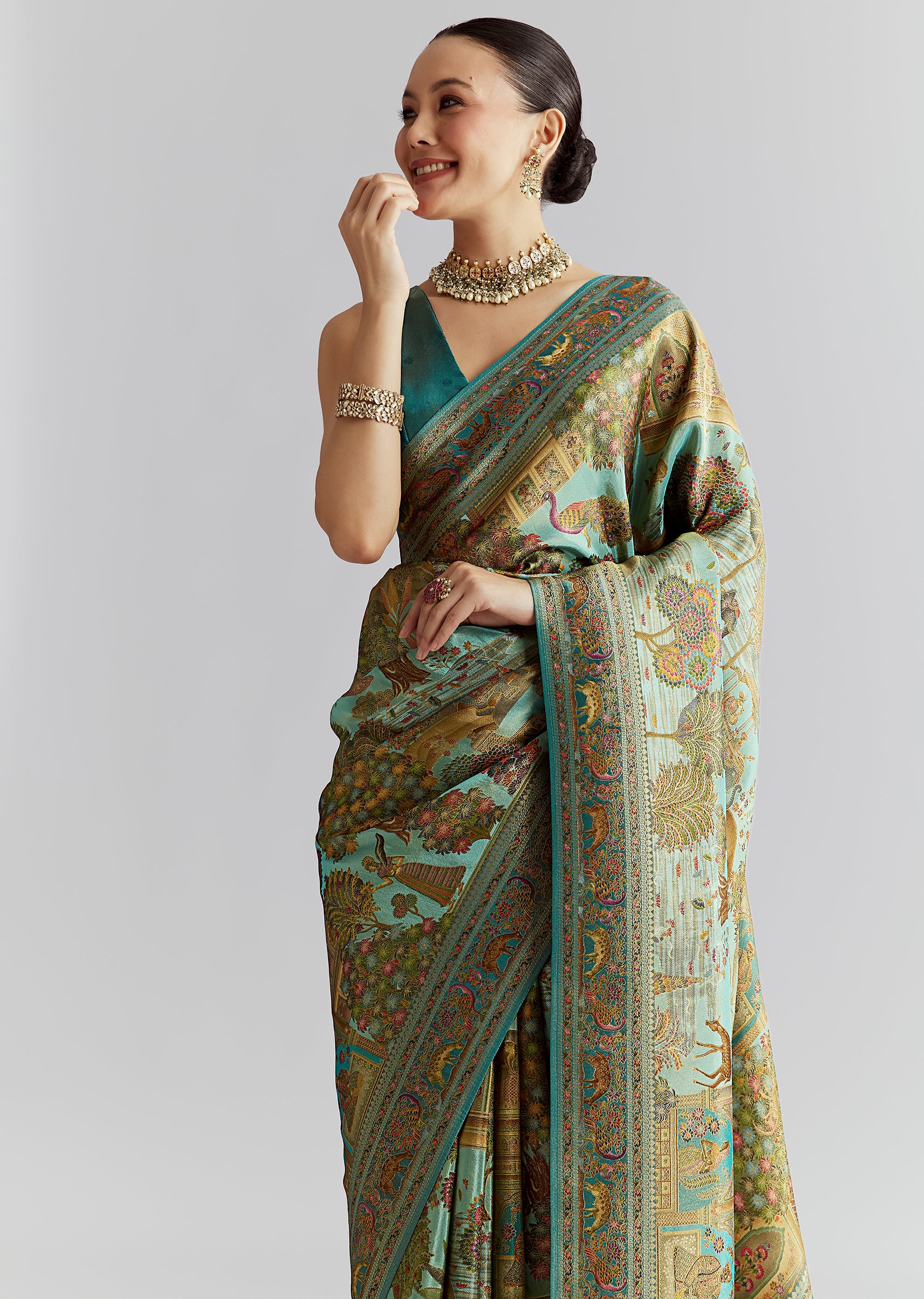 Teal Blue Satin Silk Woven Saree With Digital Historical Print