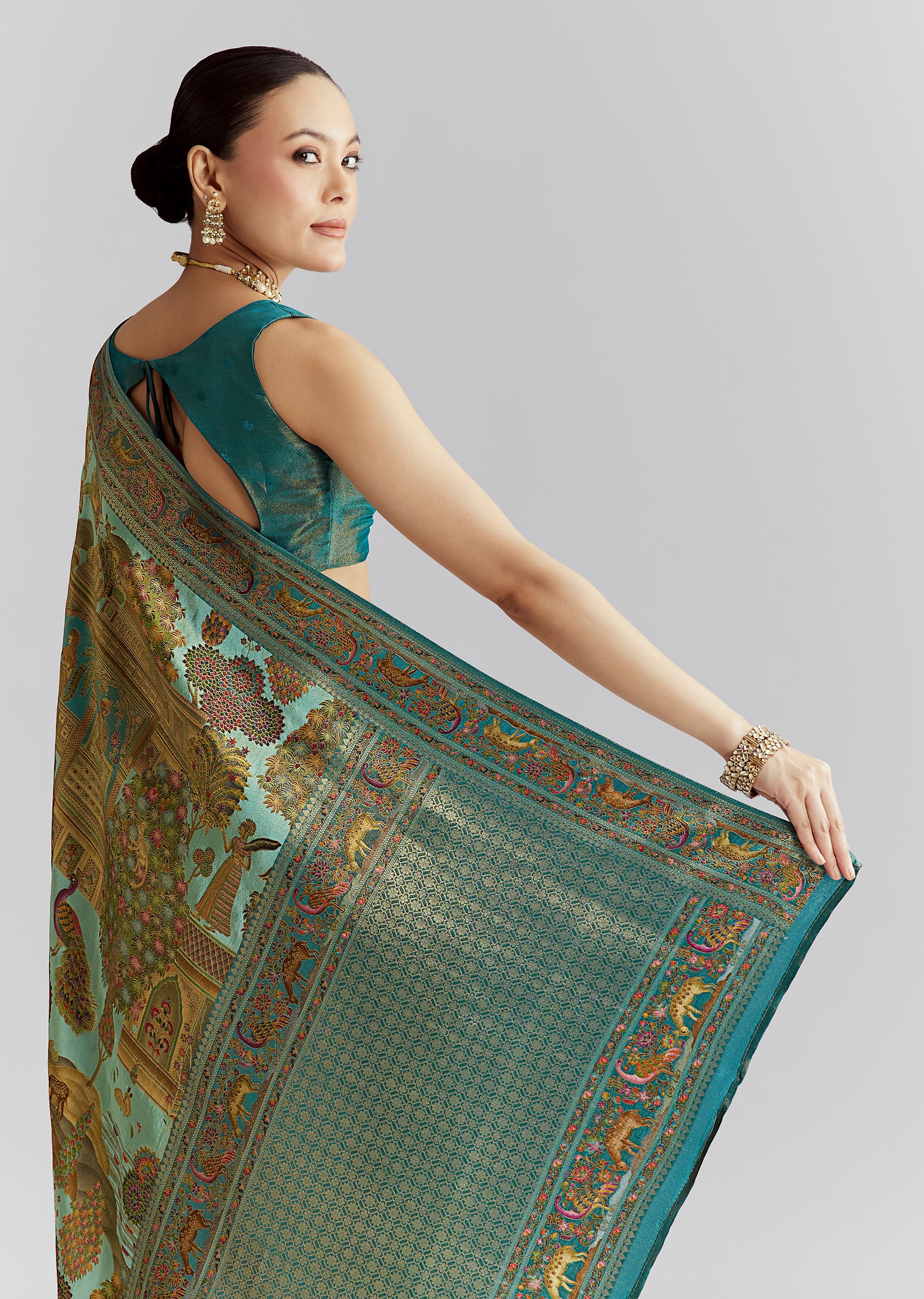Like a page from an archive, this teal blue satin silk woven saree carries a digital historical print across the drape. The artwork continues through the border and pallu with... More Product Details