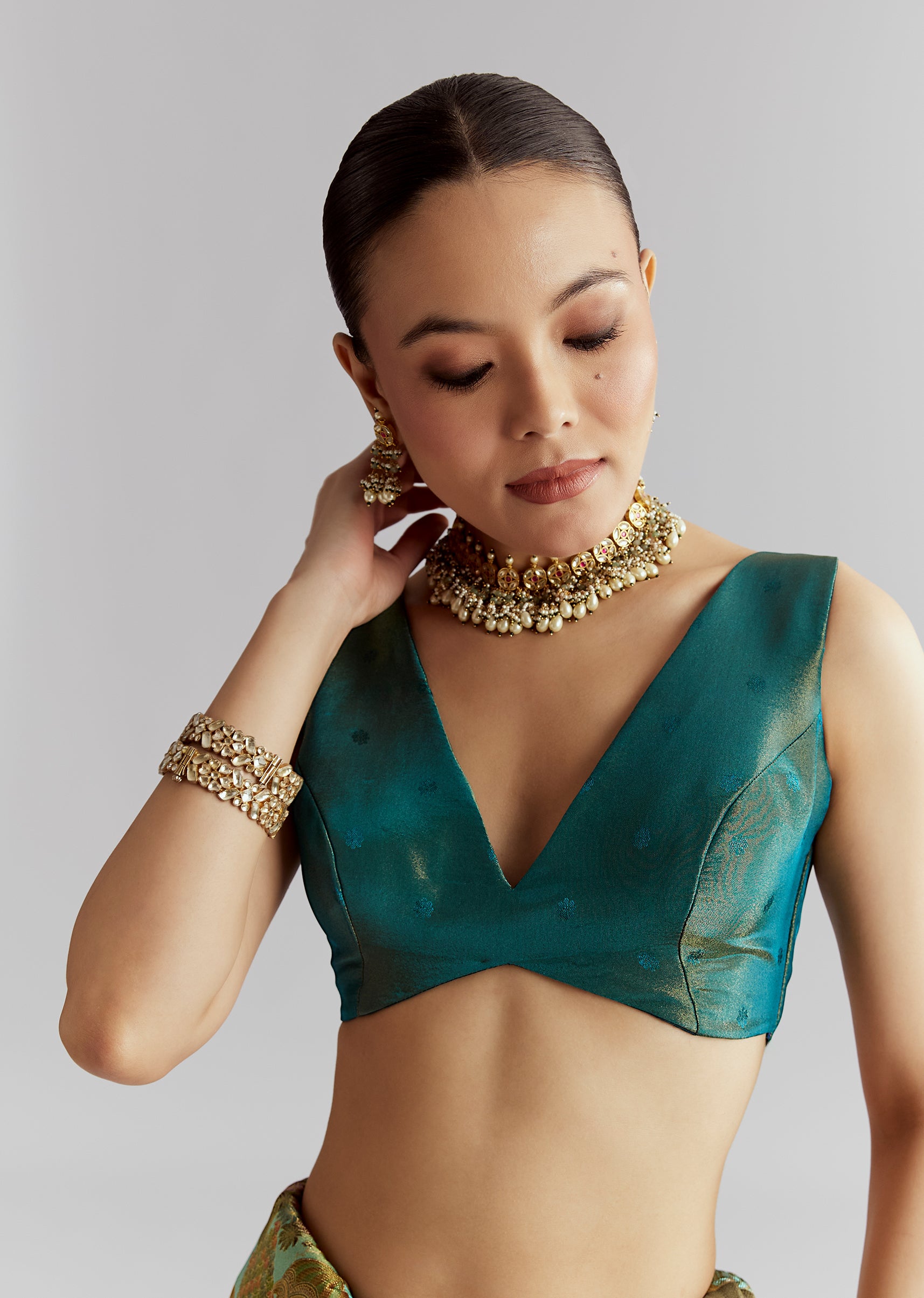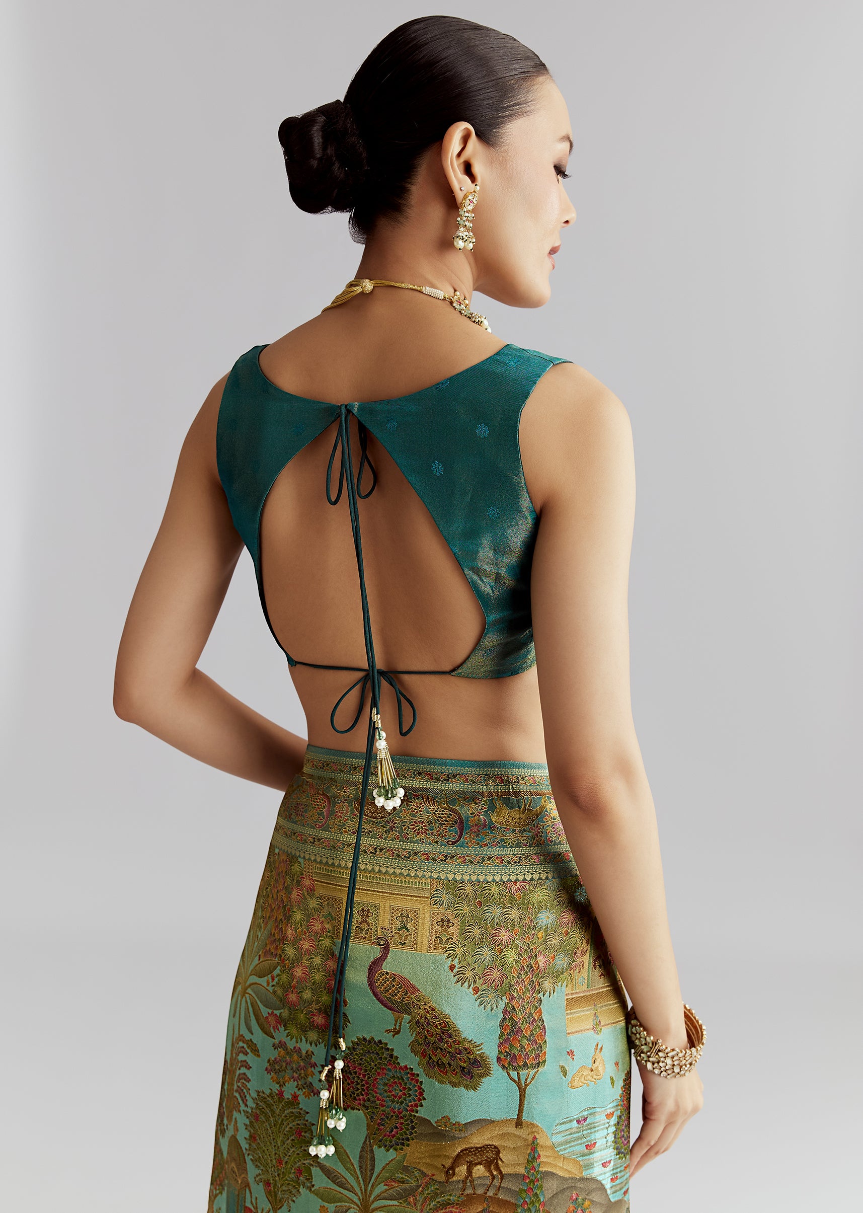 Fit Tips:The blouse should feel fitted and smooth, while the satin pleats hold their line and the pallu stays set.