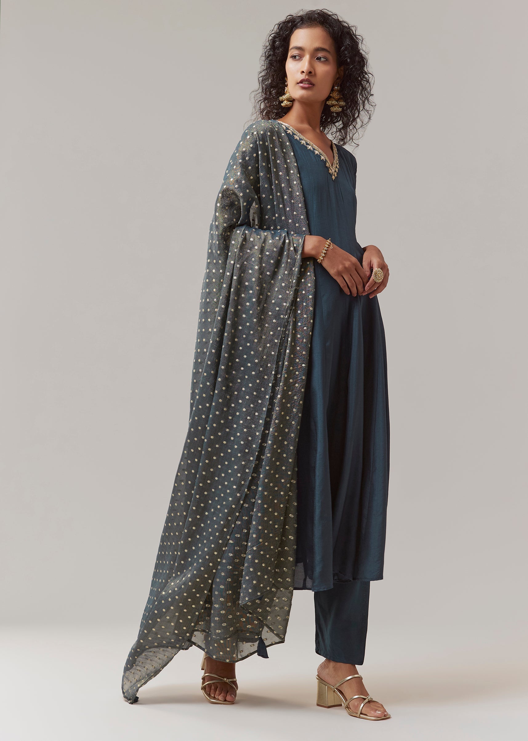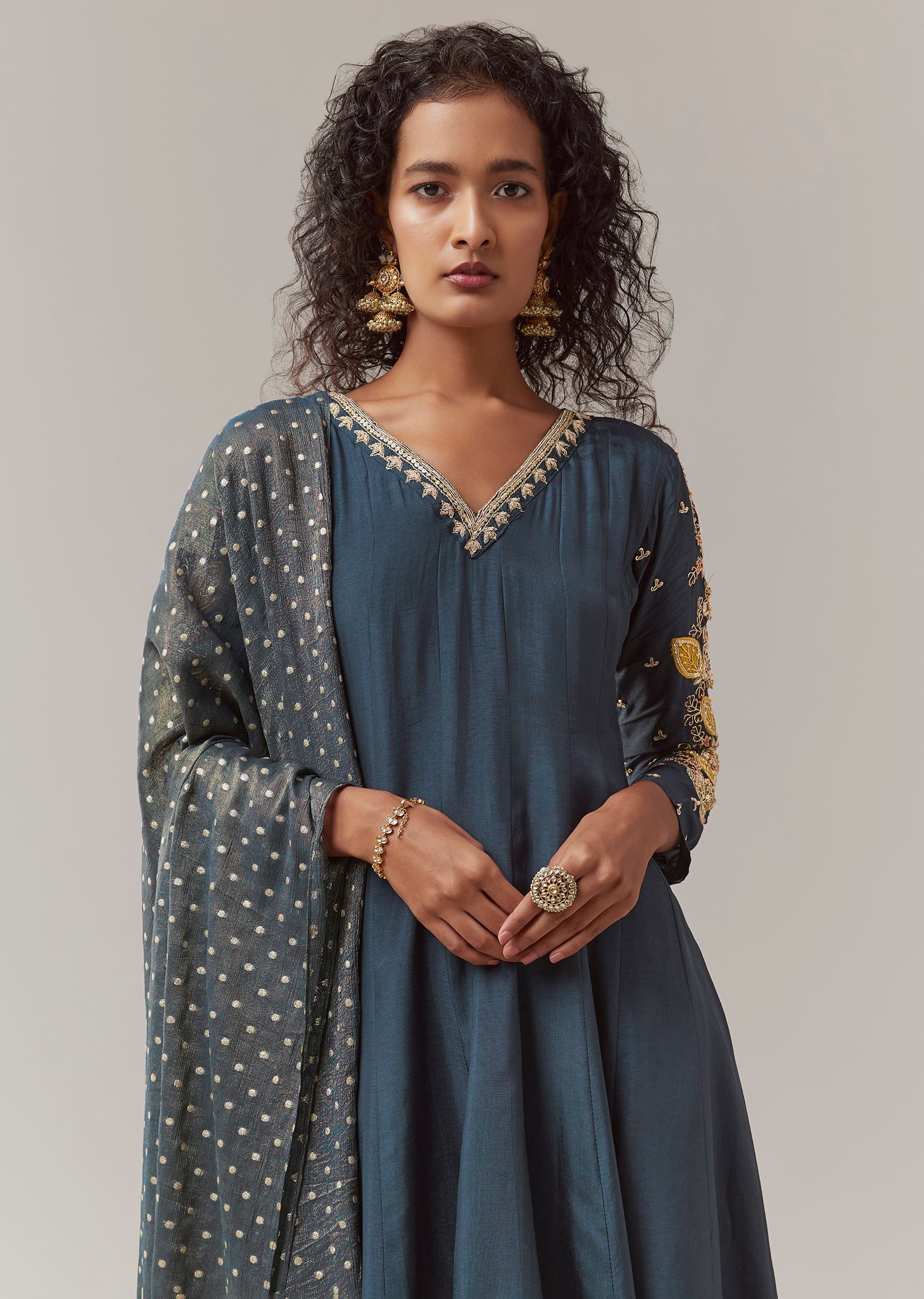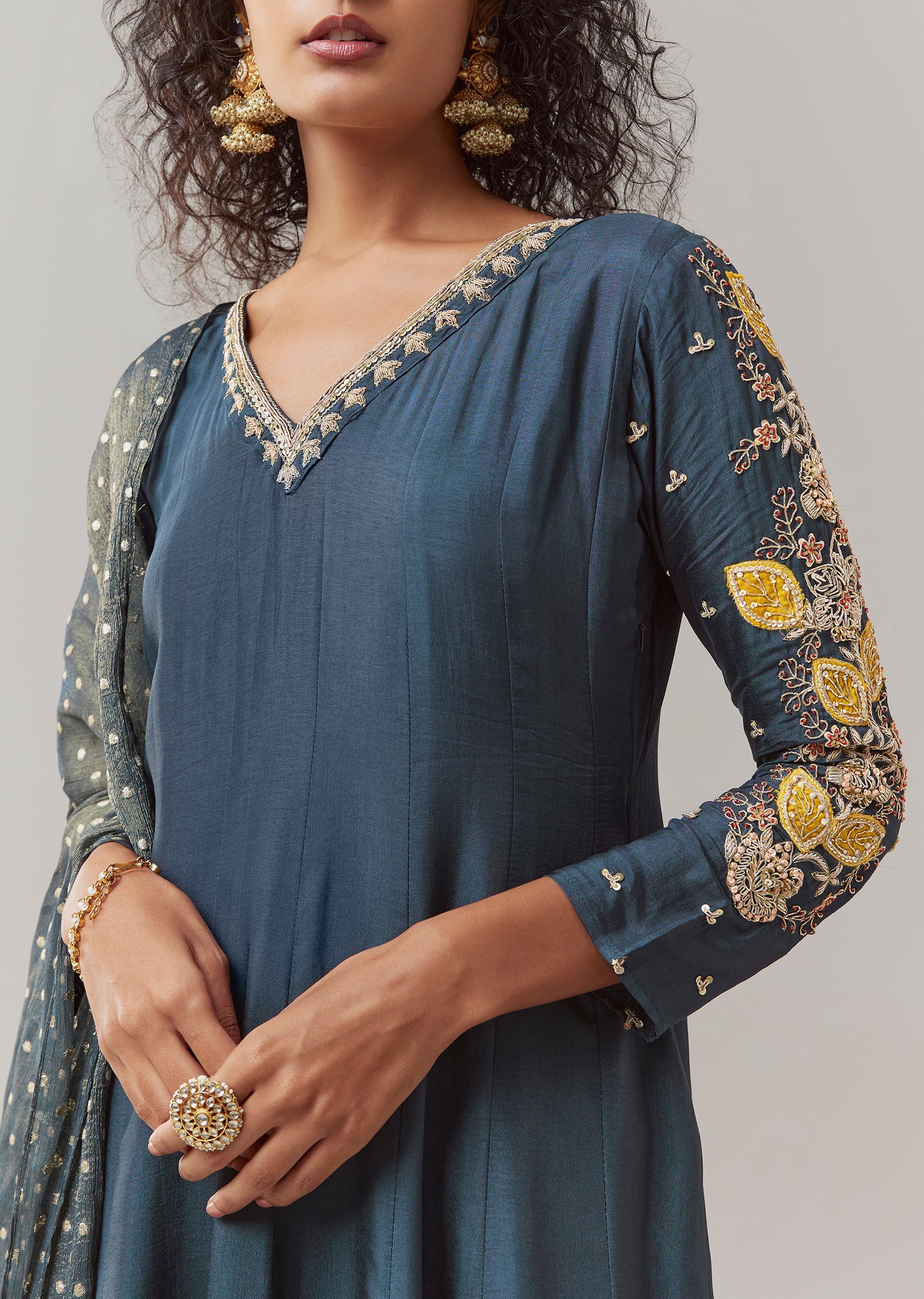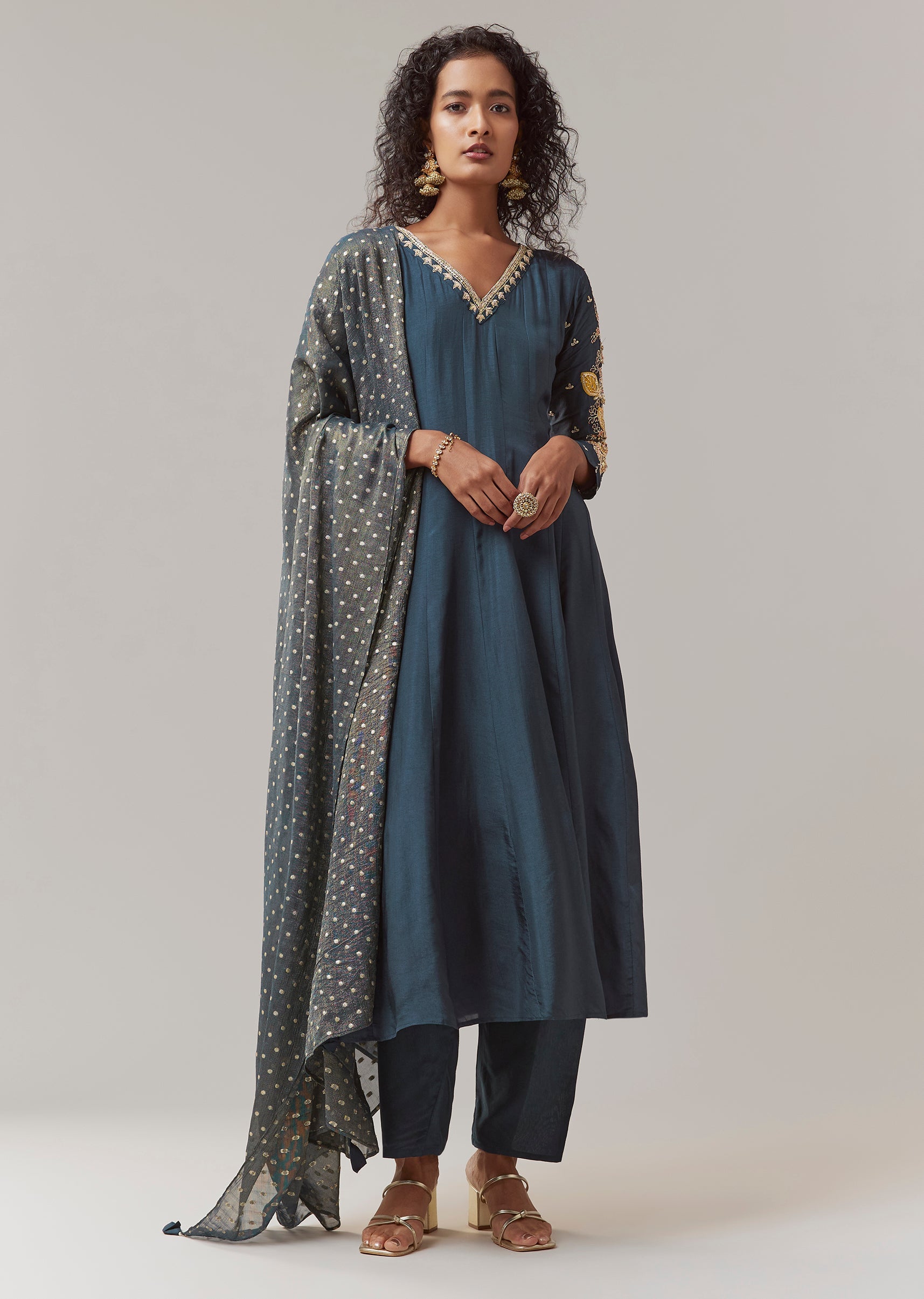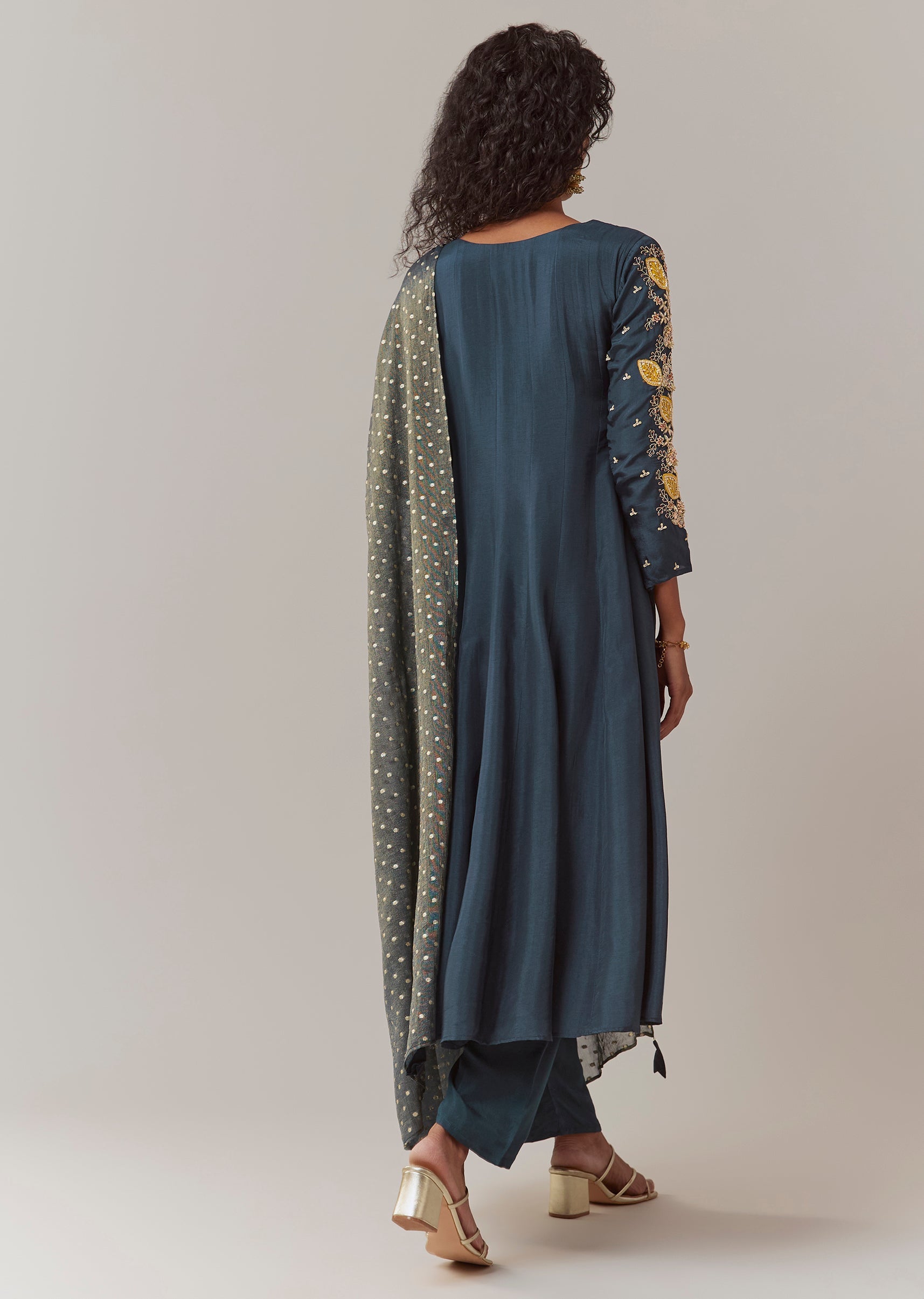 Style Tip Pair with antique gold jewelry and embellished heels to enhance the richness of the zardosi work. Fit Tip The side zip ensures a clean and flattering fit at the bodice, while the anarkali flare provides comfort and effortless movement throughout wear.