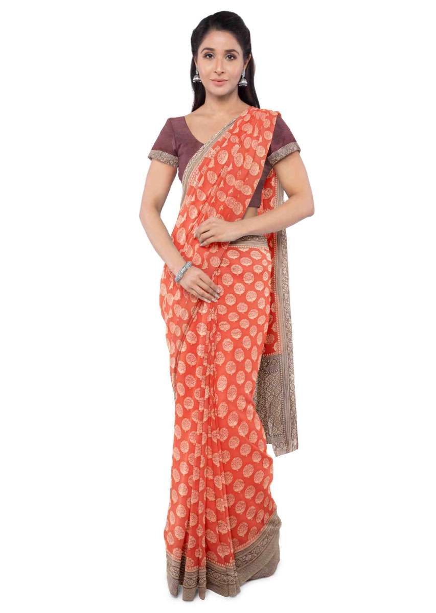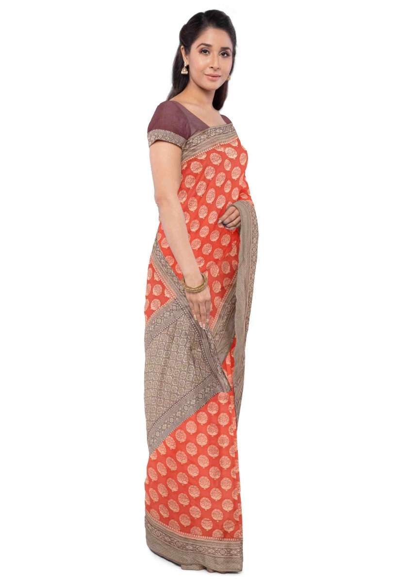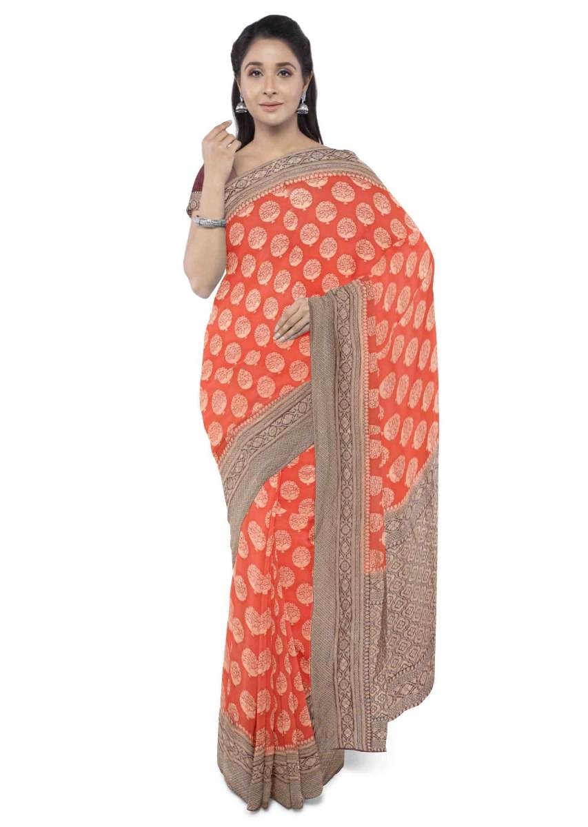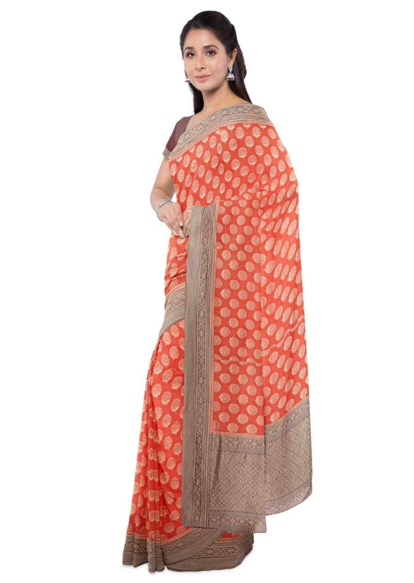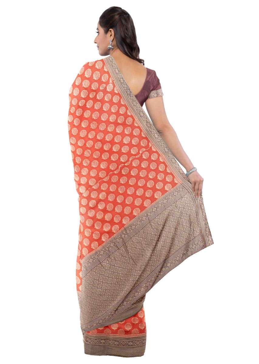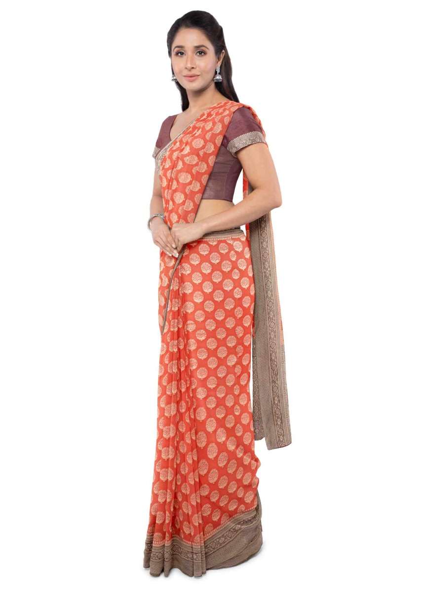 Tiger Orange Banarasi Saree In Georgette With Brown Blouse Piece Online - Kalki Fashion