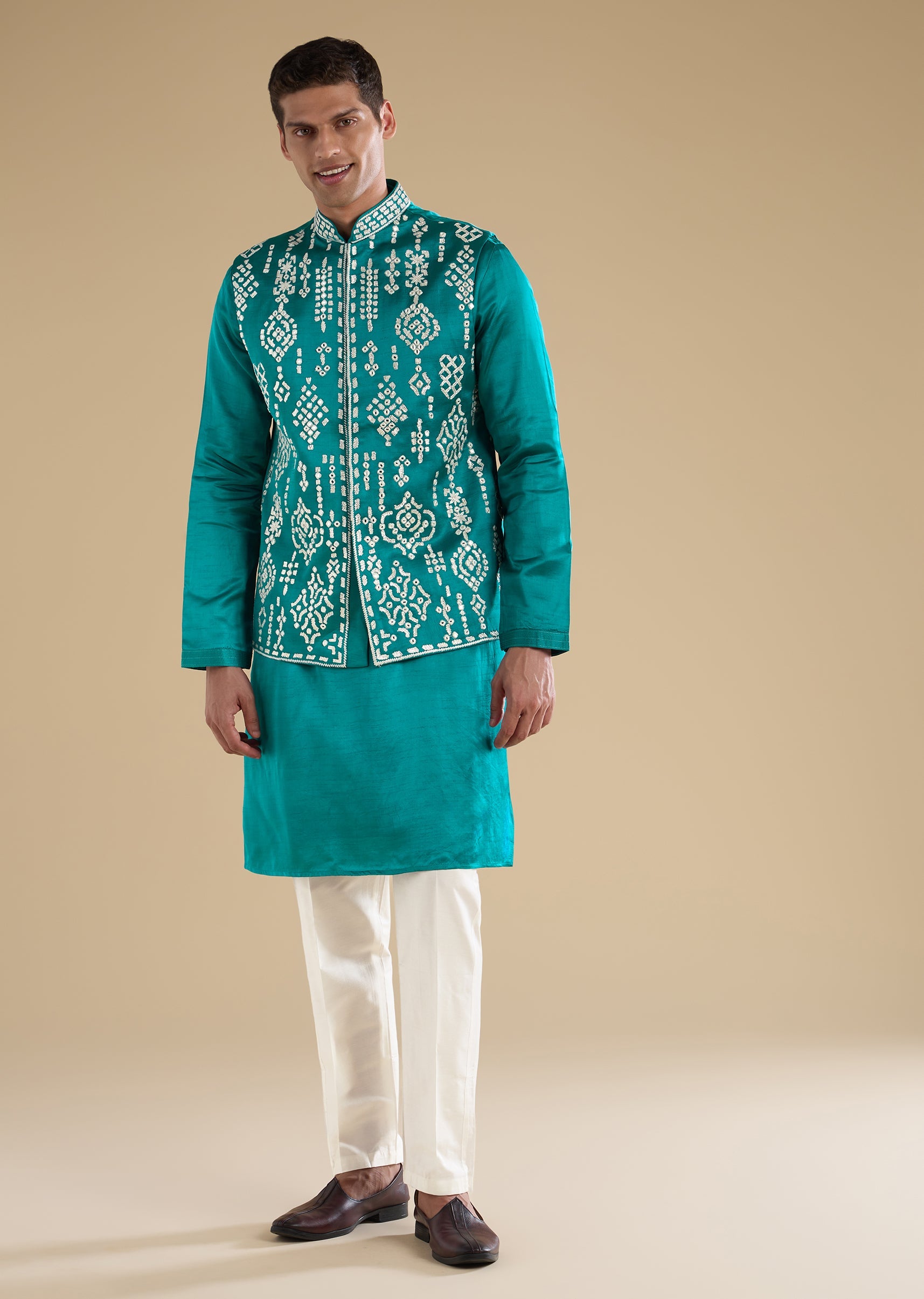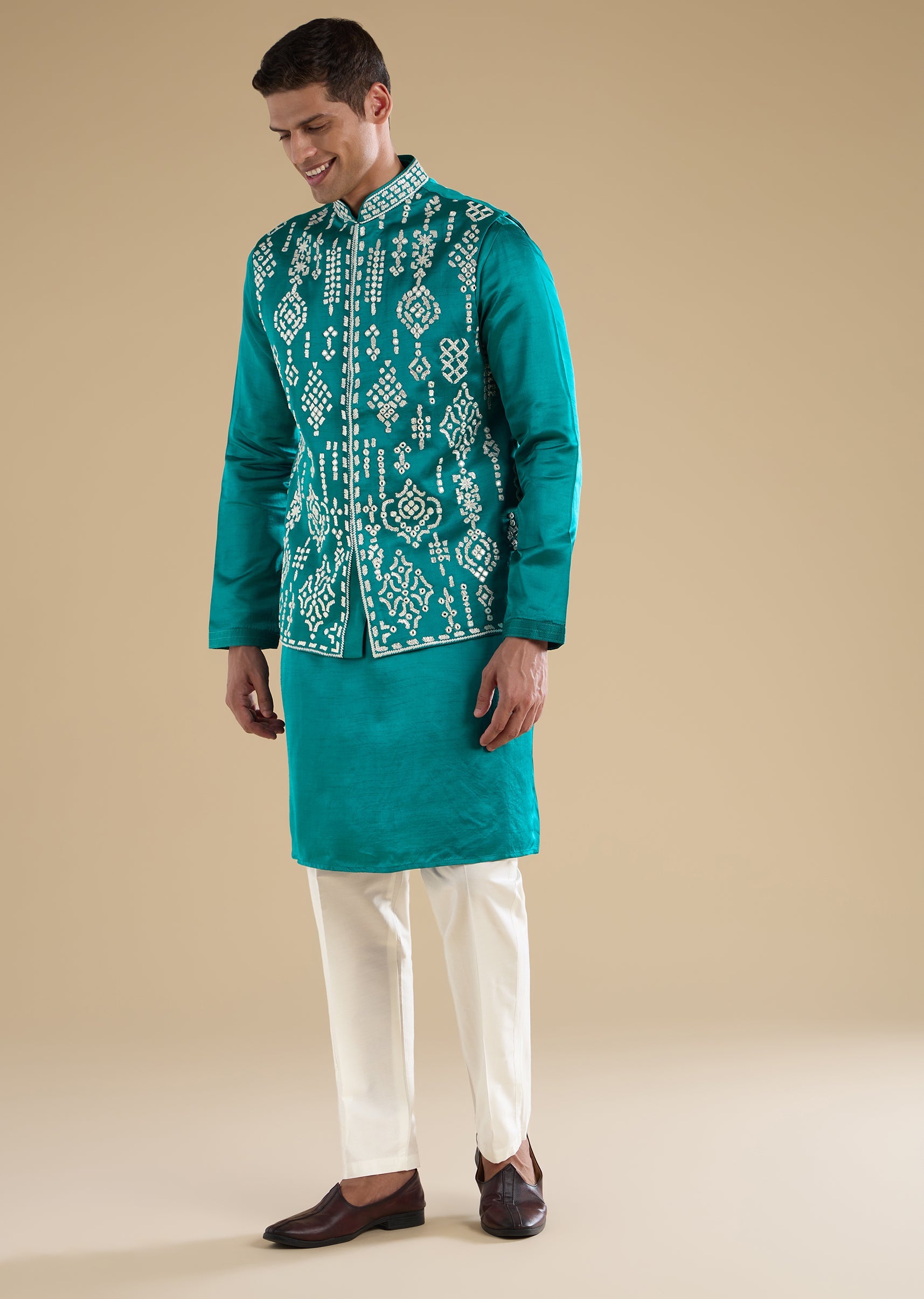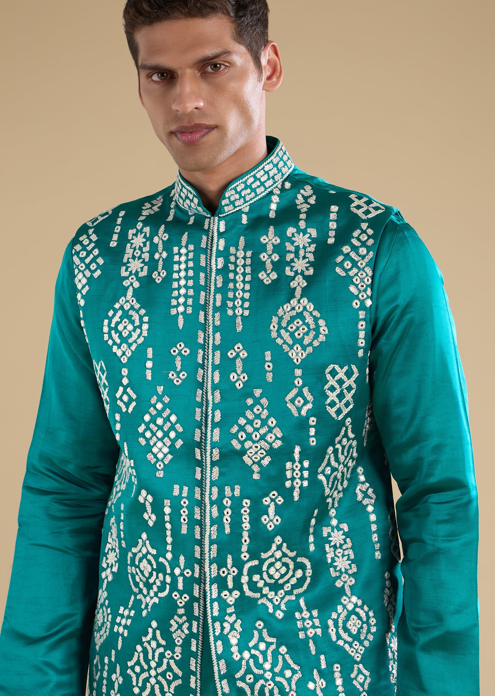 Fresh and elegant with refined detailing, this turquoise blue kurta jacket set is crafted in smooth art silk for a polished wedding look. The kurta features a mandarin collar and full sleeves, paired with an embroidered jacket accented with resham thread and mirror work for a luminous finish. Ideal for groom-family celebrations and wedding functions. Awarded as the Most Trusted Brand, we're delivering styles you love, just as promised.