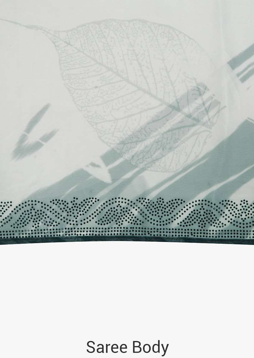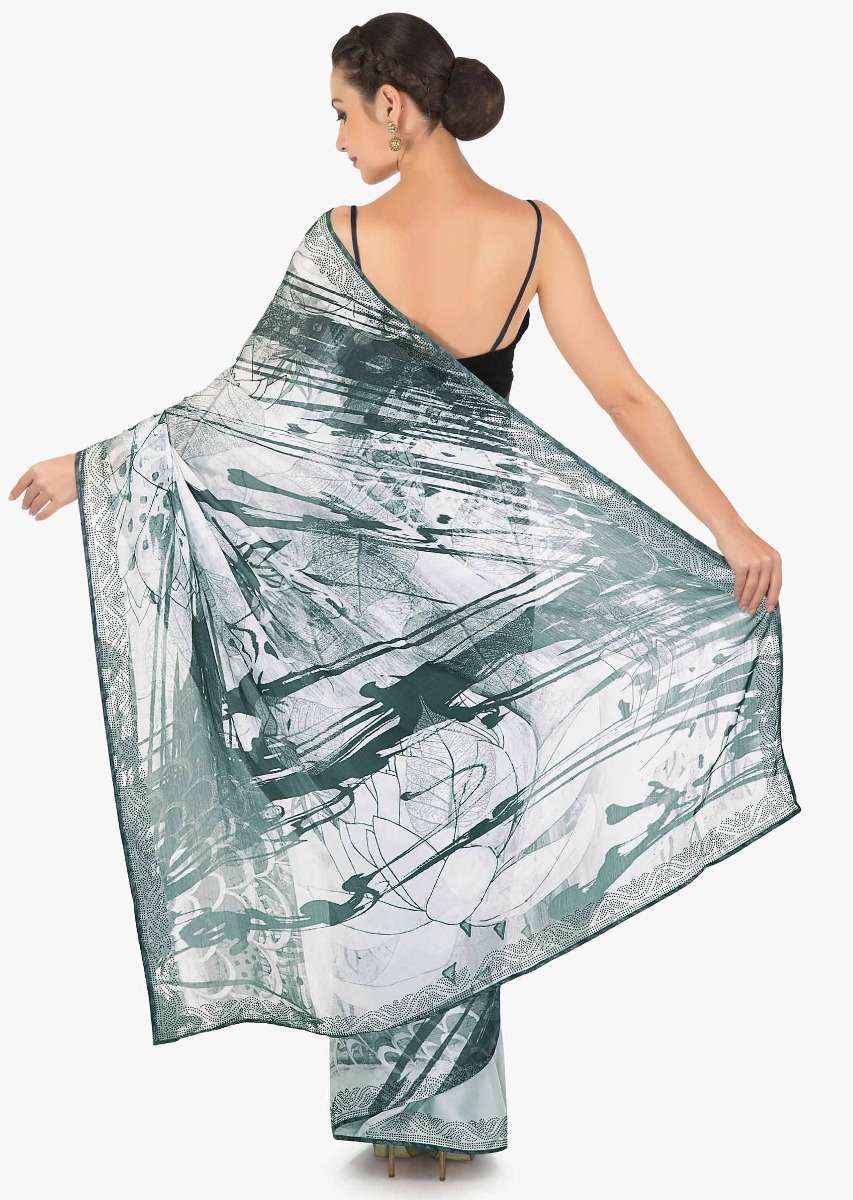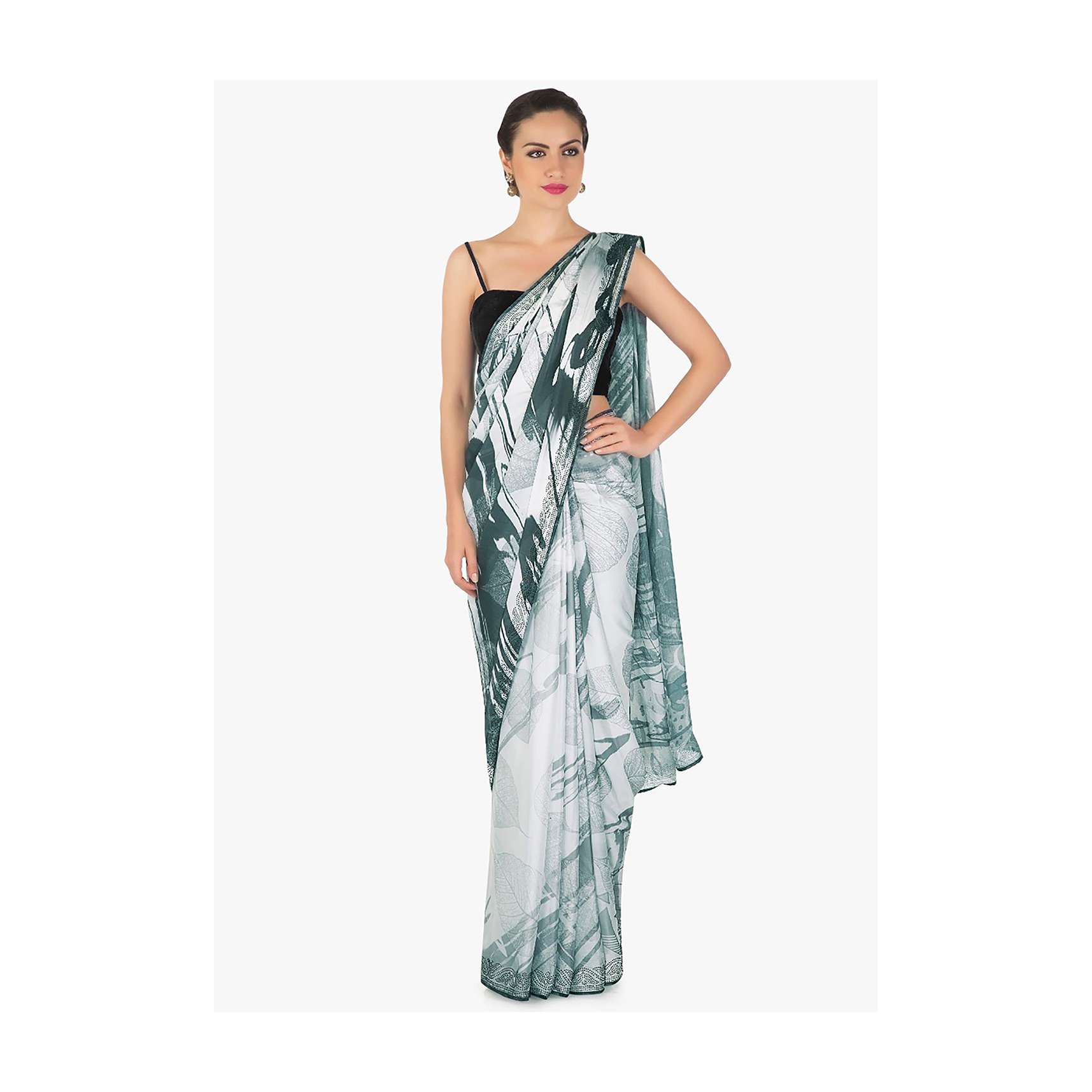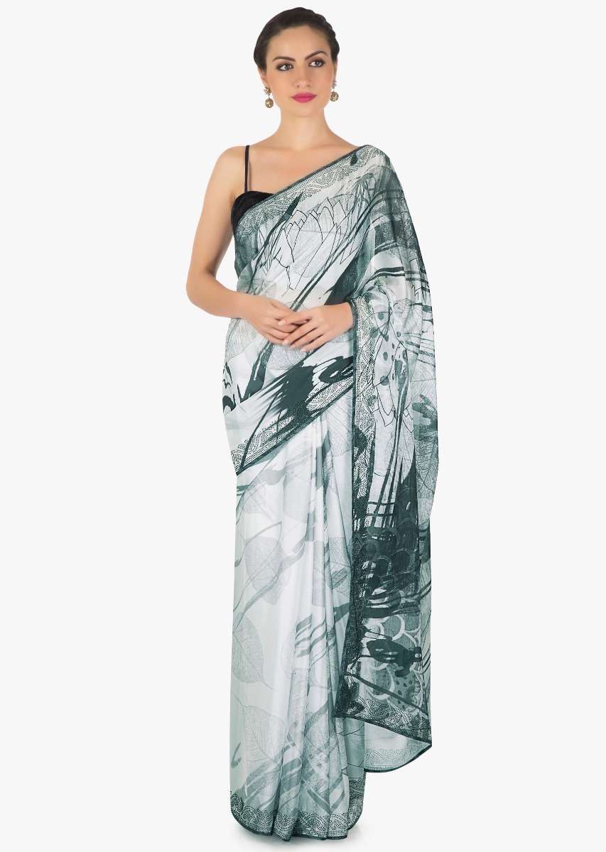 White And Black Saree In Crepe With Kundan Border And Self Print Online - Kalki Fashion