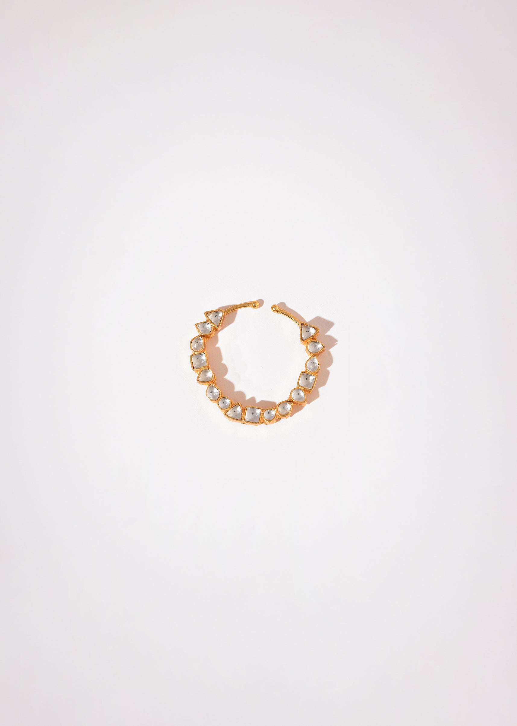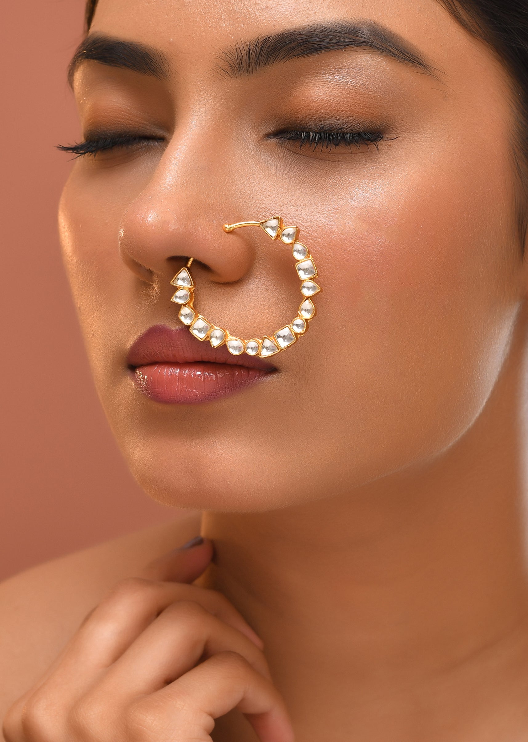 Add a refined touch to your traditional look with this white and gold kundan nath, featuring a sleek geometric motif for a modern yet classic appeal. Perfect for weddings and... More Product Details
