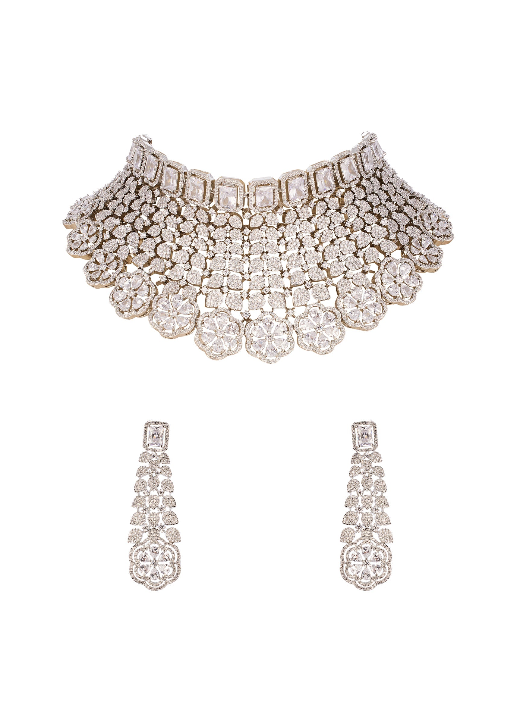 A refined sparkle meets everyday elegance in this CZ diamond look necklace set, crafted in durable rhodium plated brass with a long lasting anti tarnish finish. The design is enhanced with shimmering diamond toned semi precious stones that add a clean, radiant glow. Finished with matching earrings, this set is perfect for weddings, festive occasions, and elegant evenings. Awarded as the Most Trusted Brand, we're delivering styles you love, just as promised.