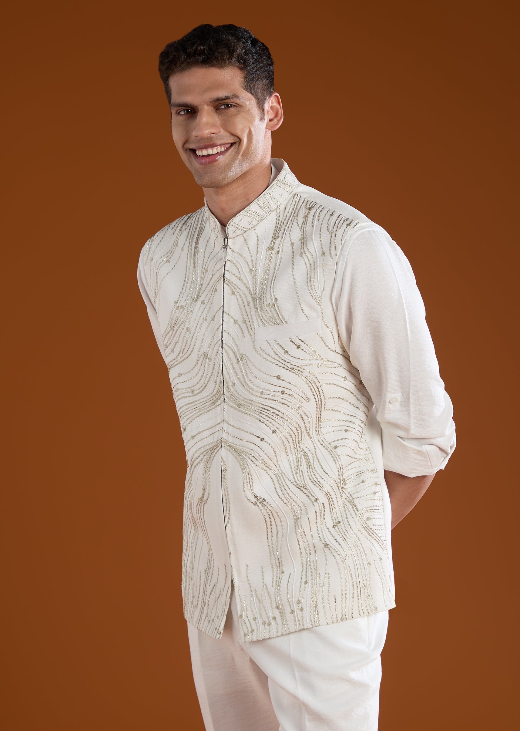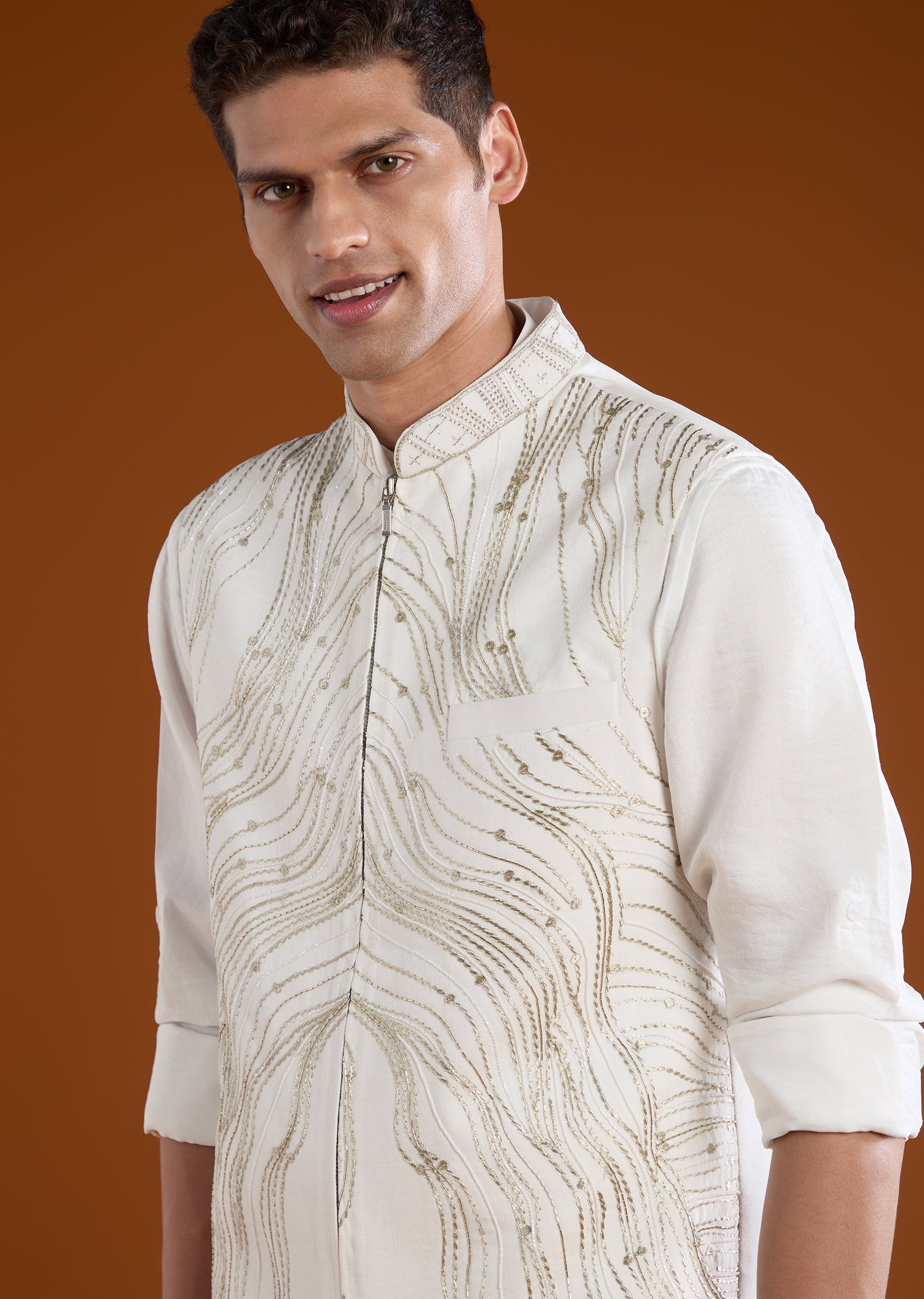 Bring modern elegance to any festive occasion with this silk and art silk jacket kurta set detailed with refined resham thread work and subtle sequin accents. The full sleeve kurta with a mandarin collar creates a classic base, while the coordinated jacket with a front zip and front hook eye closure adds structure and sophistication. Paired with tailored pants, the ensemble offers a polished traditional look suitable for weddings, receptions, and cultural celebrations. Awarded as the Most Trusted Brand, we're delivering styles you love, just as promised.