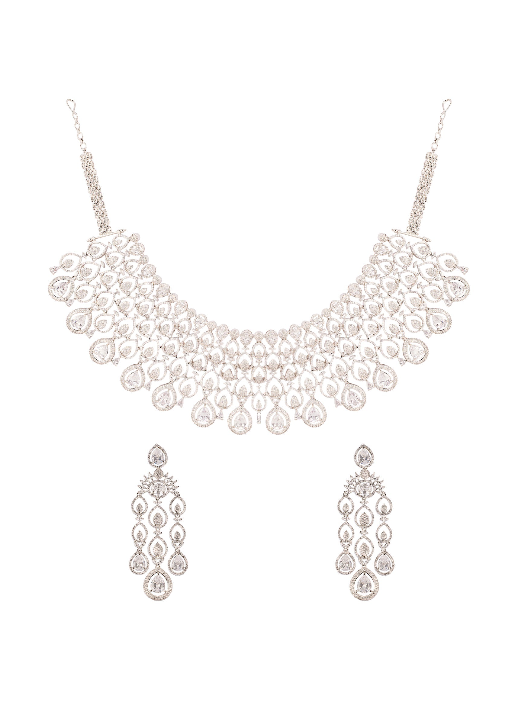 White Cz Diamond Long Necklace Set In Rhodium Plated Brass with Anti Tarnish Finish
