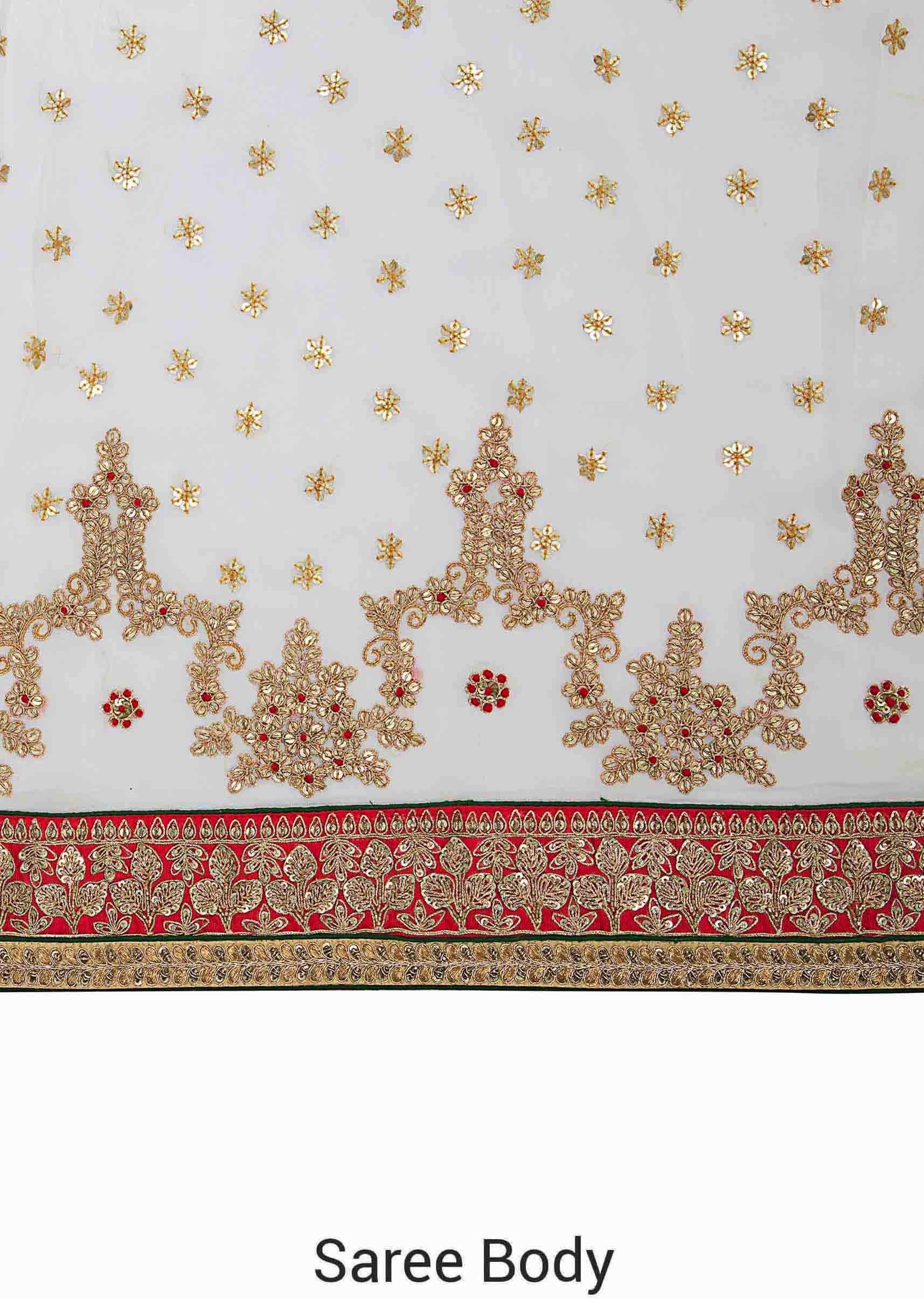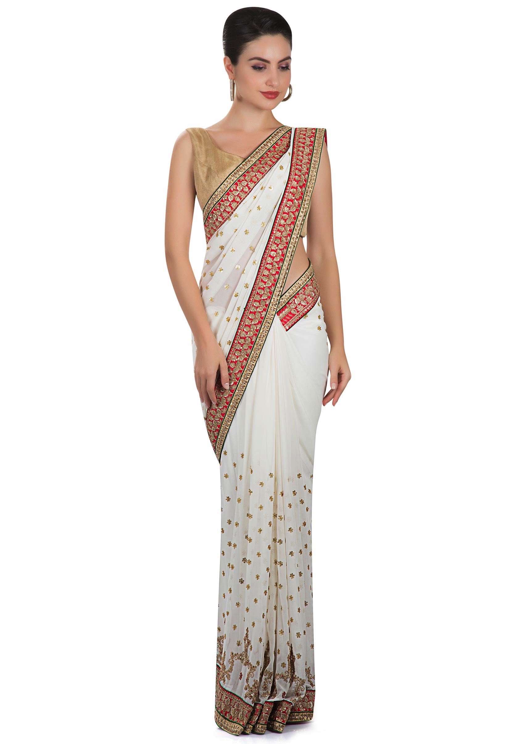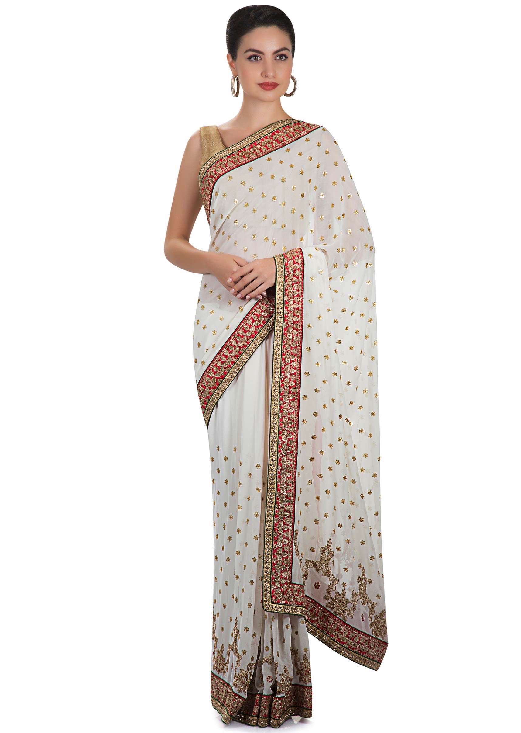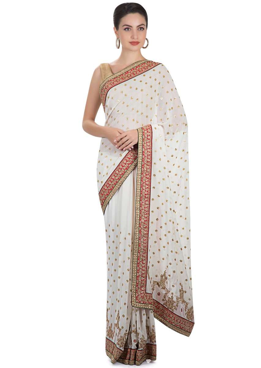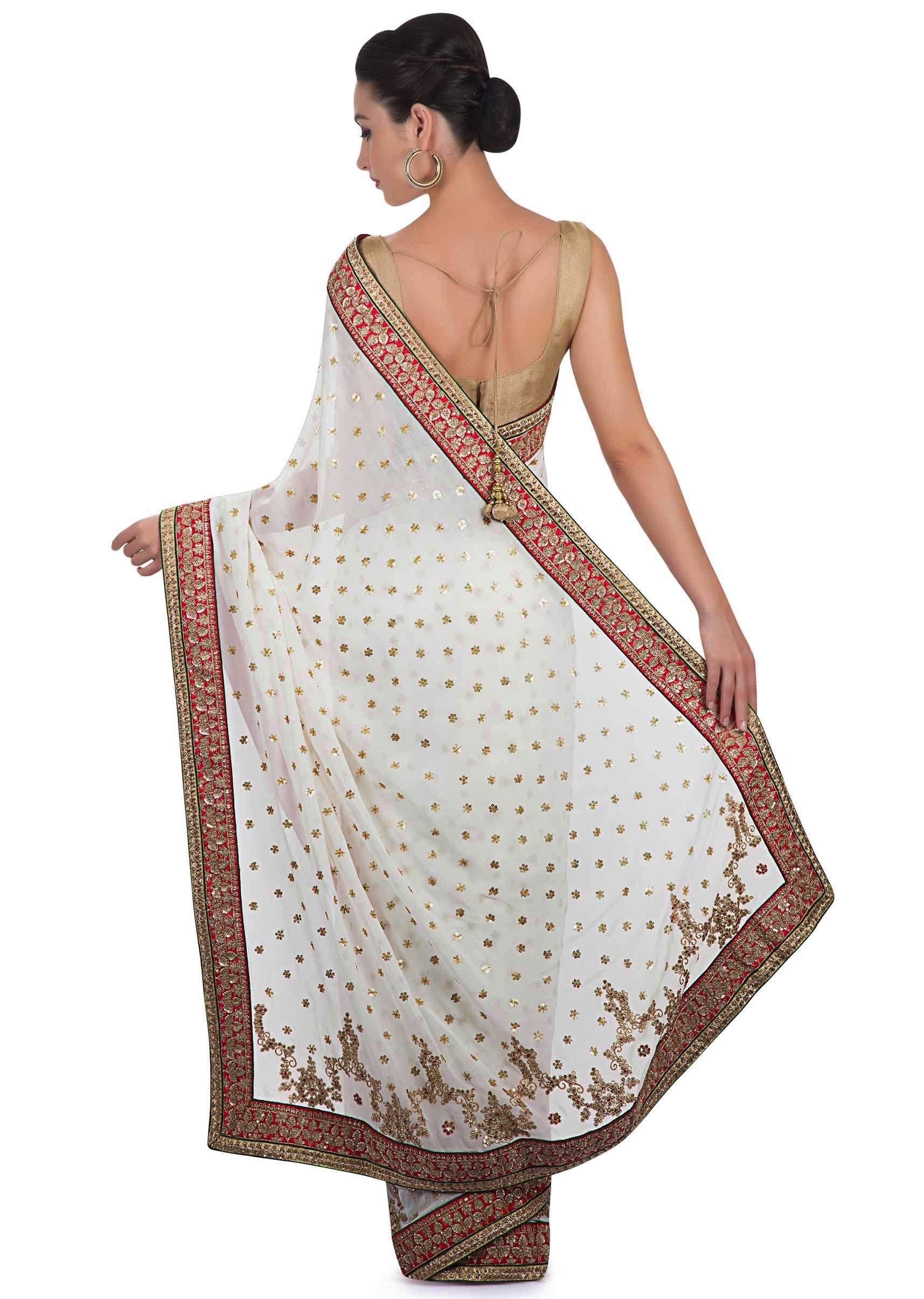 White georgette saree adorned with sequins and zari work only on Kalki